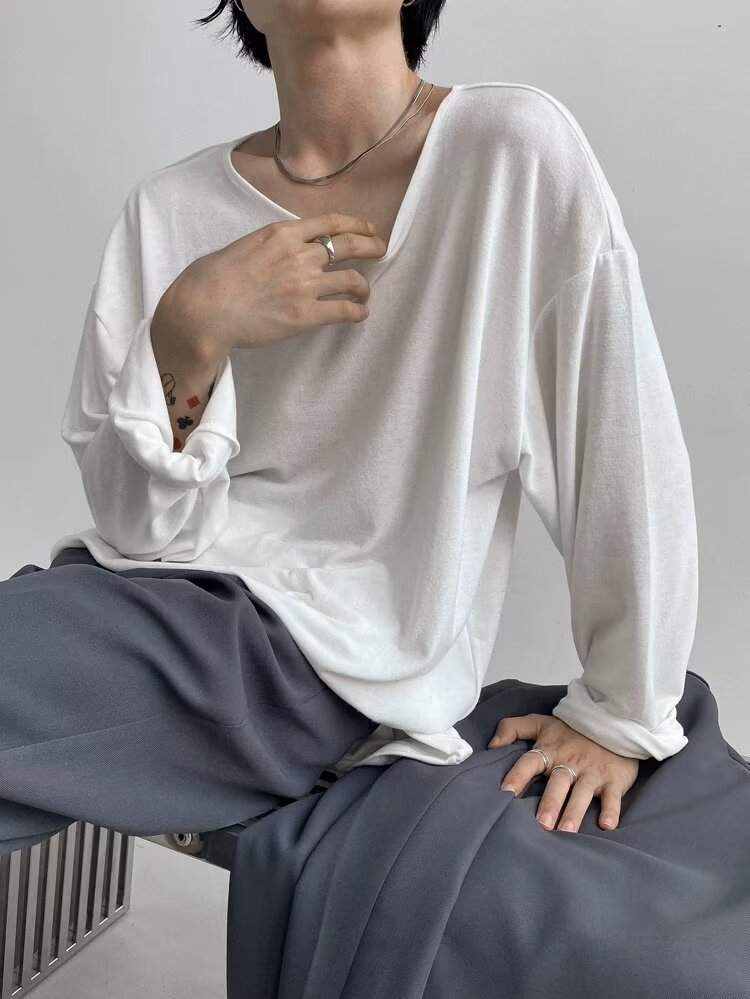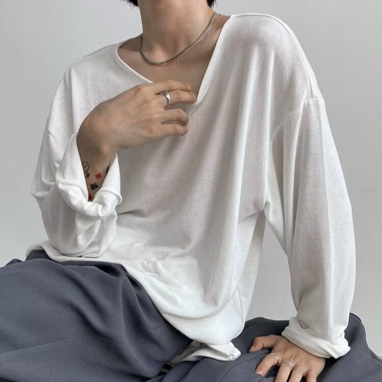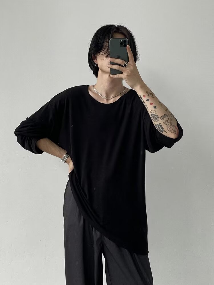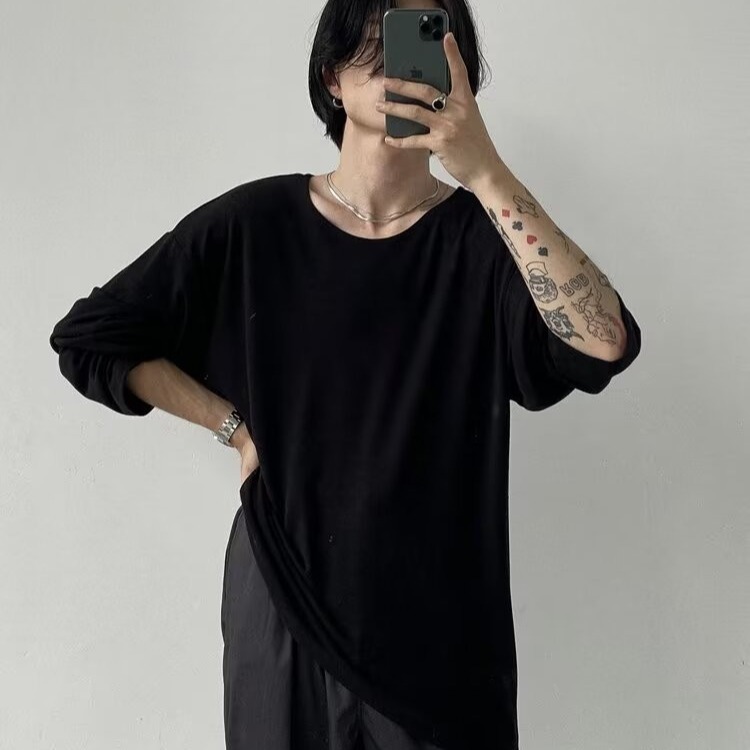 남성용 단색베이스 셔츠 커플 옷 봄과 여름 긴팔 티셔츠 일본식 탑 옷 내부 티셔츠 라운드 칼라