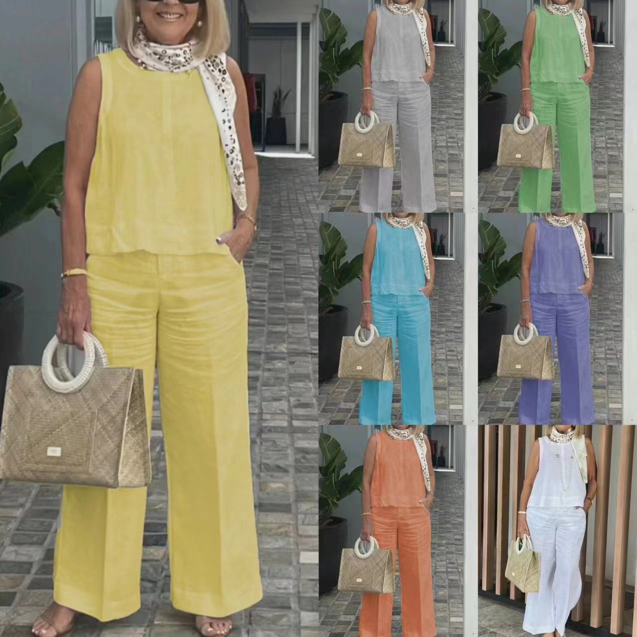 유럽과 미국 국경 대외 무역 여성 의류 봄/여름 2024 새로운 아마존 민소매 단색면 및 린넨 세트
