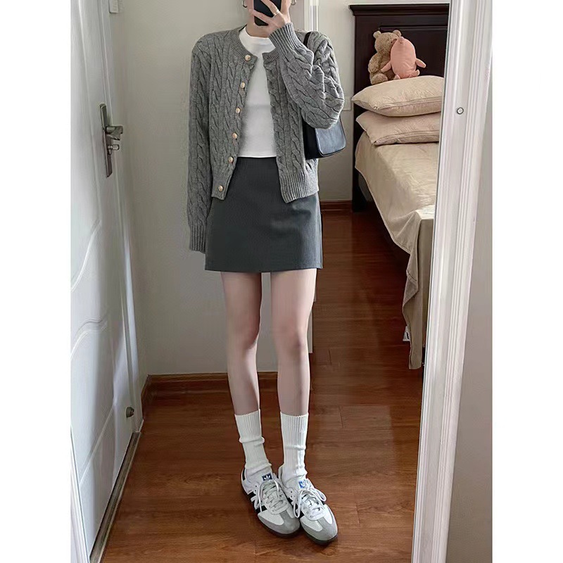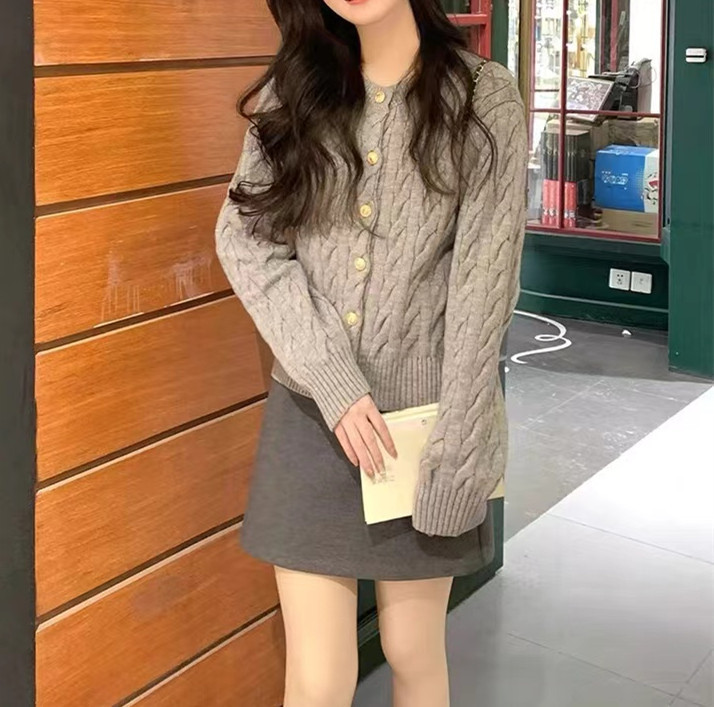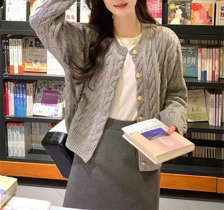 여성을위한 회색 짧은 라운드 넥 트위스트 스웨터 이른 봄 새로운 부드럽고 밀랍 게으른 스타일 느슨한 학생 니트 카디건 재킷스토어 가기