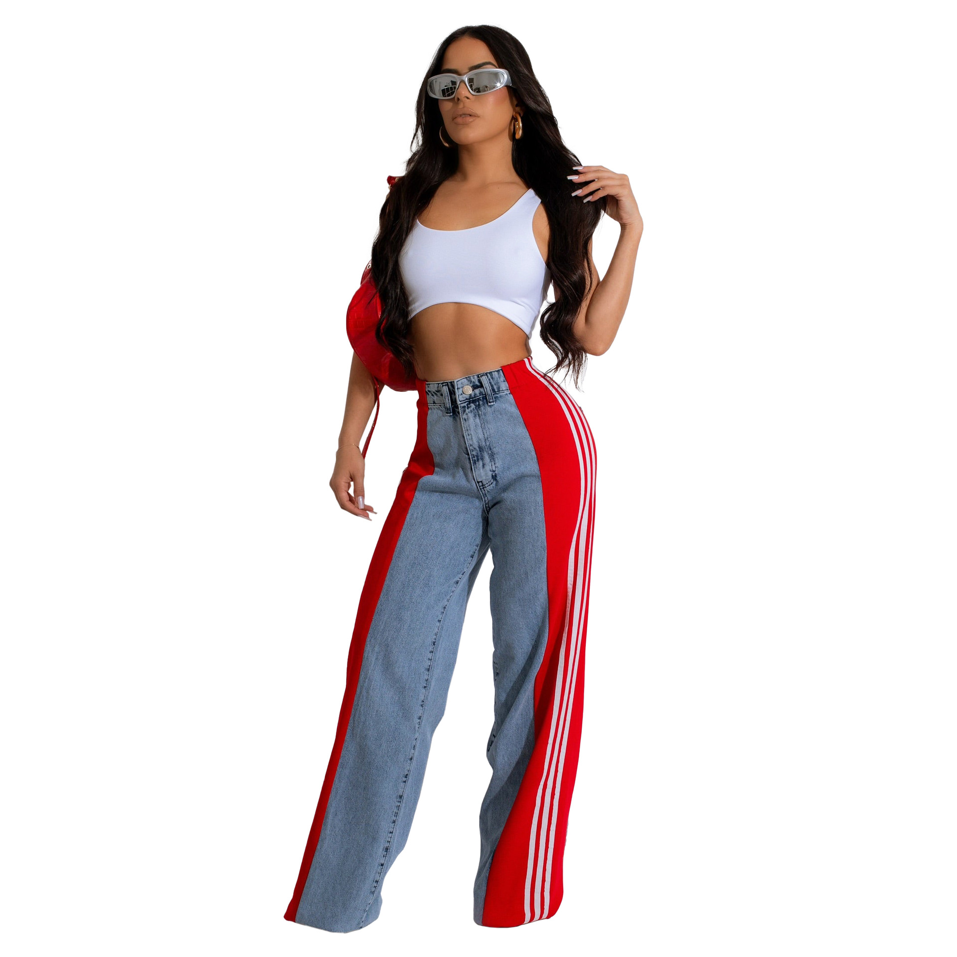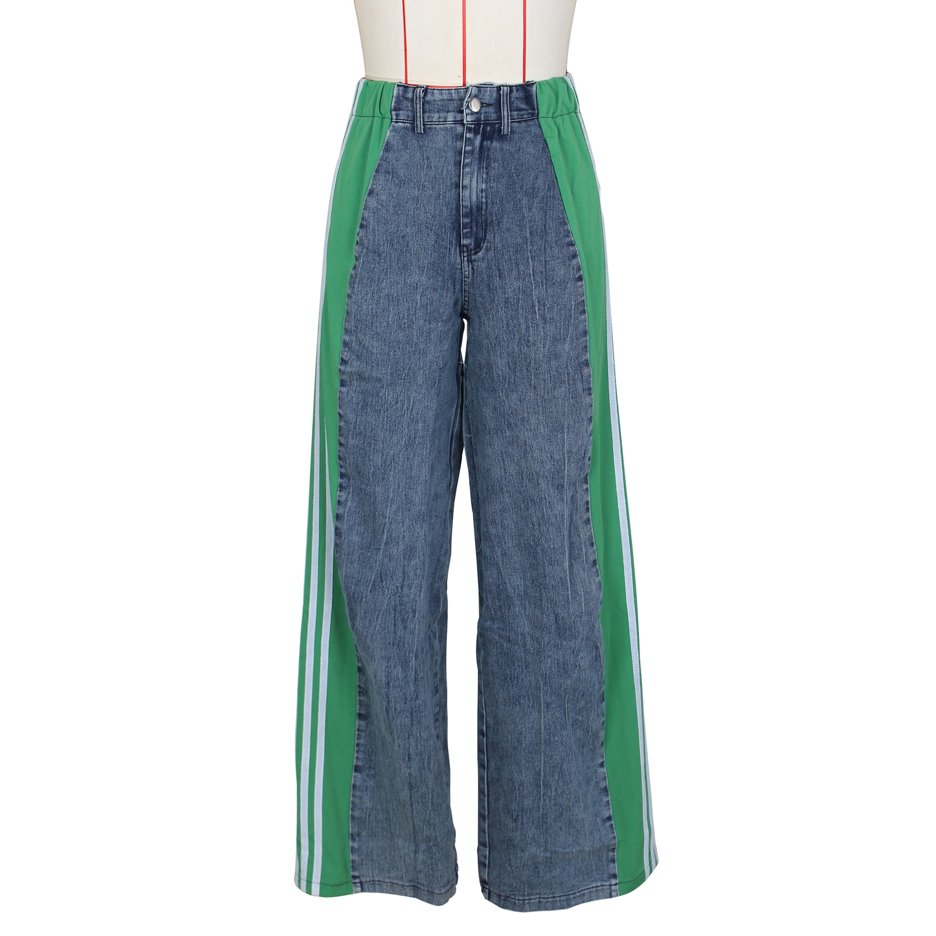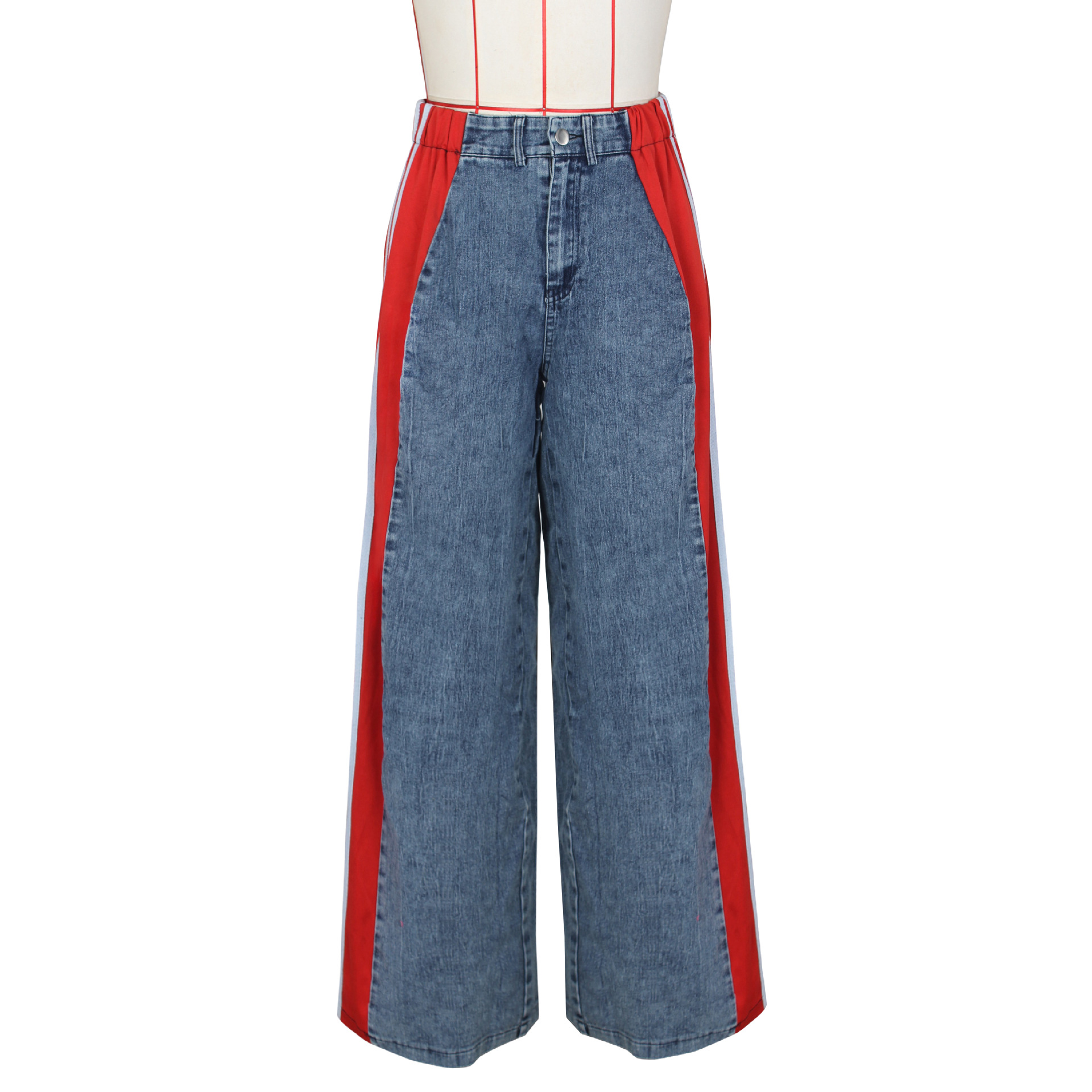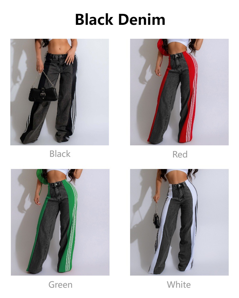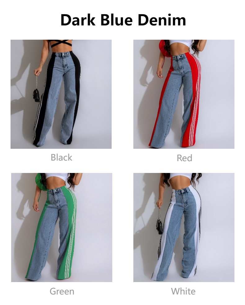 2024 여름 패션 바느질 3 줄무늬 넓은 다리 데님 바지 여성의 새로운 캐주얼 높은 허리 스트레치 스트레이트 다리 바지스토어 가기