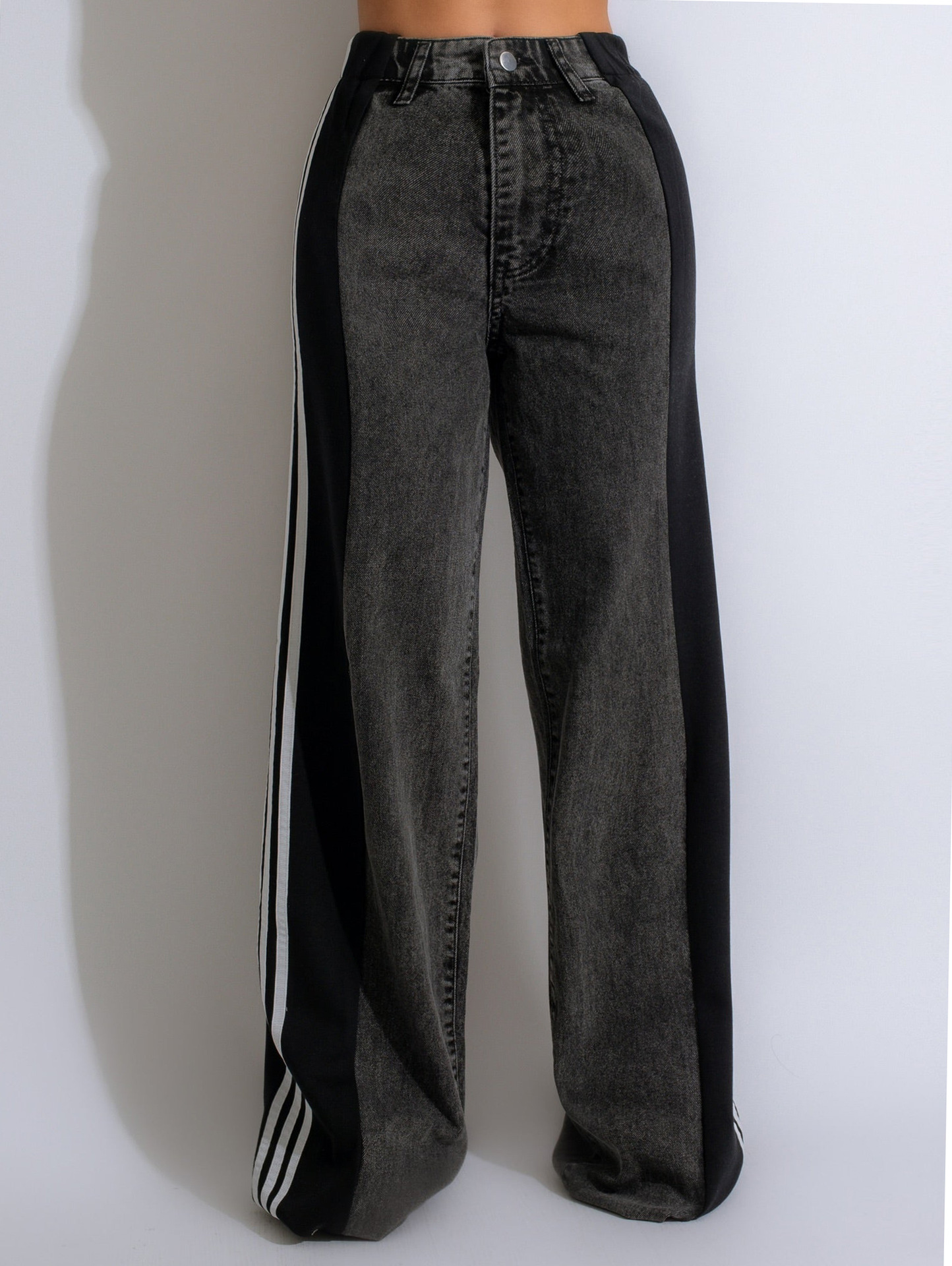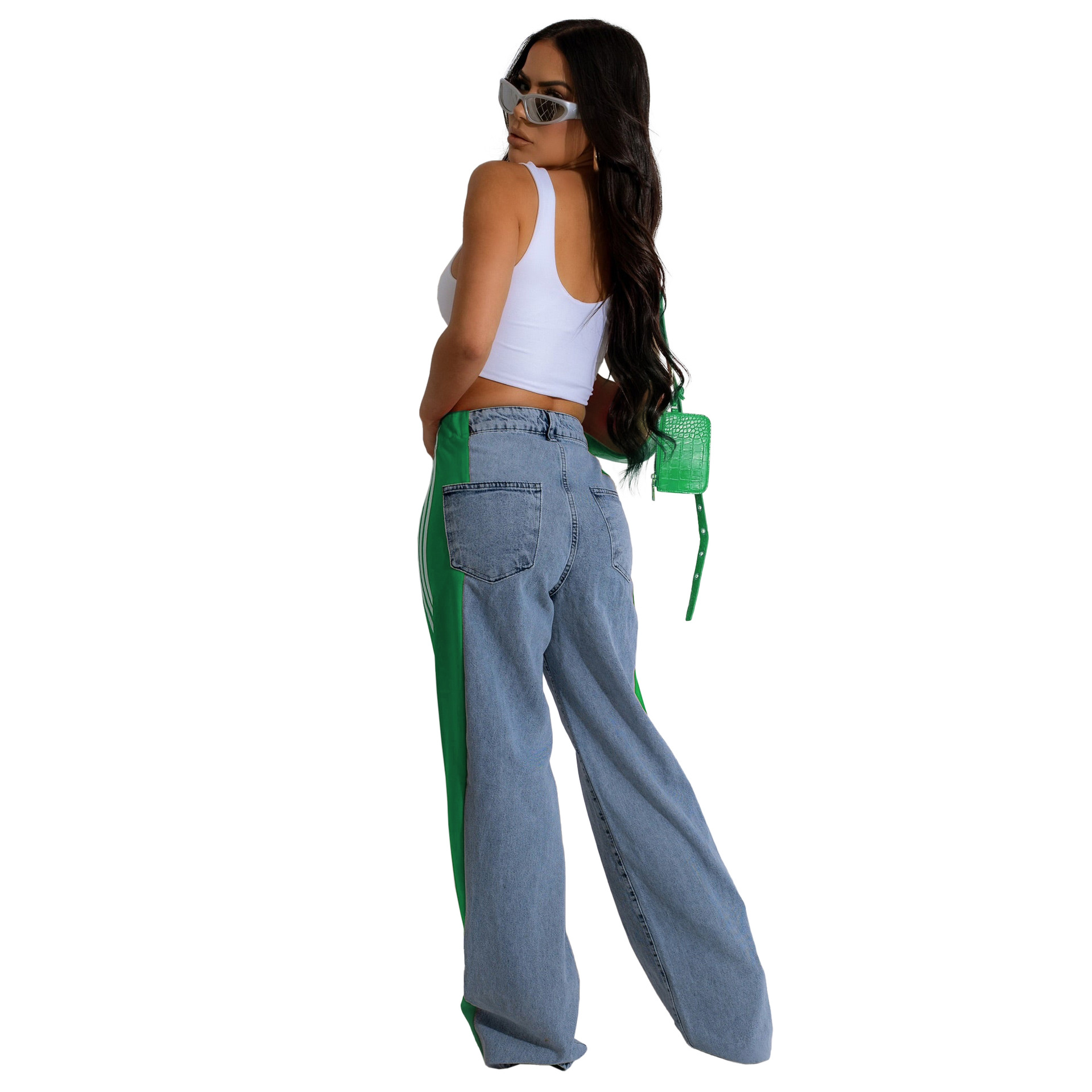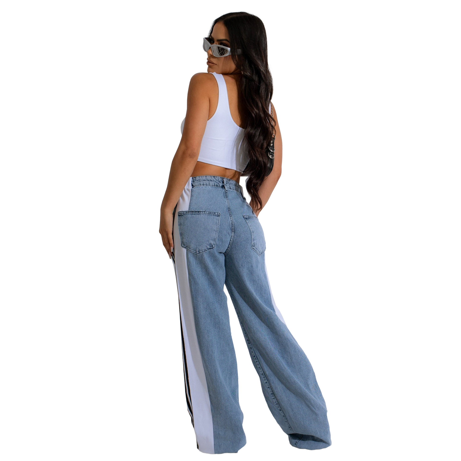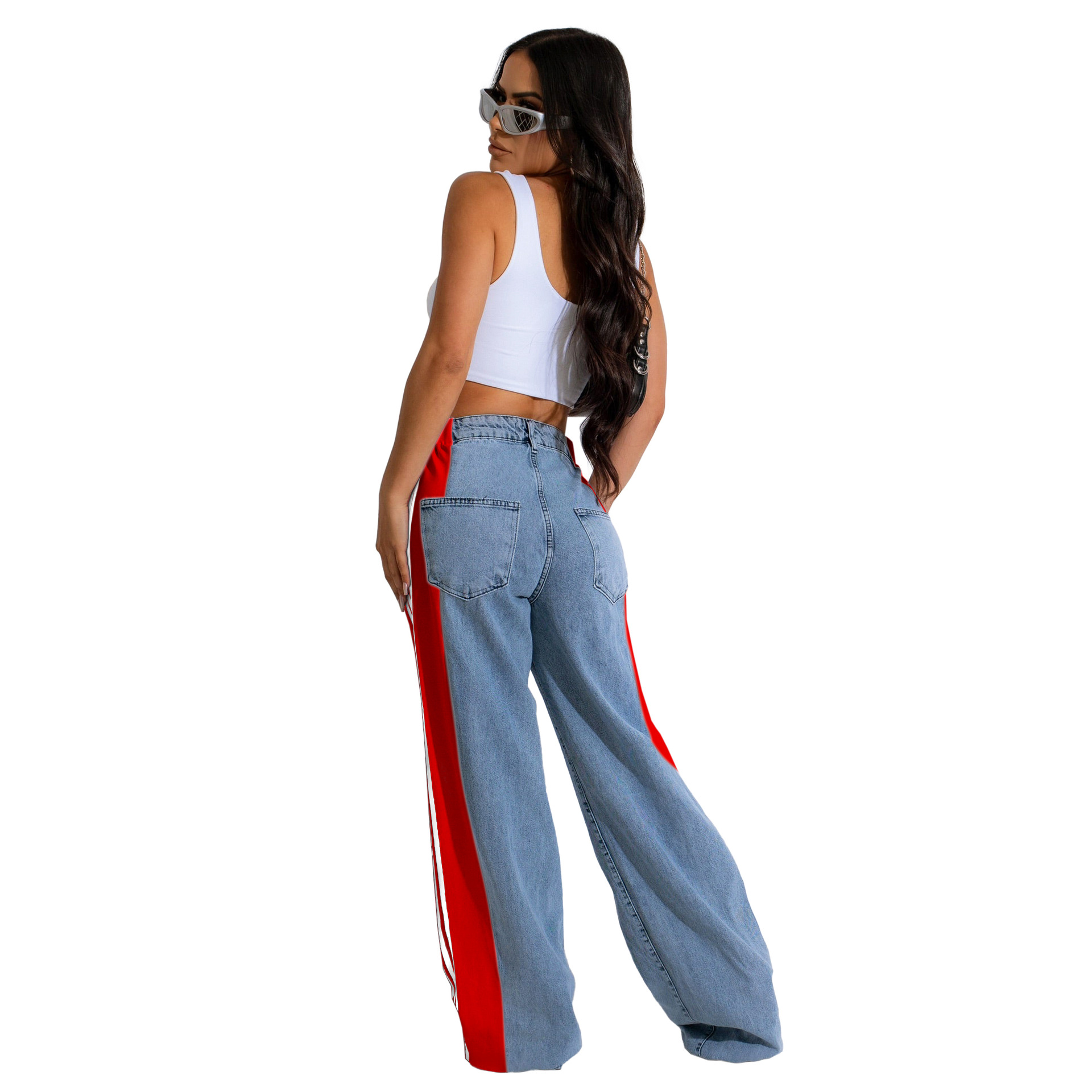 2024 여름 패션 바느질 3 줄무늬 넓은 다리 데님 바지 여성의 새로운 캐주얼 높은 허리 스트레치 스트레이트 다리 바지스토어 가기