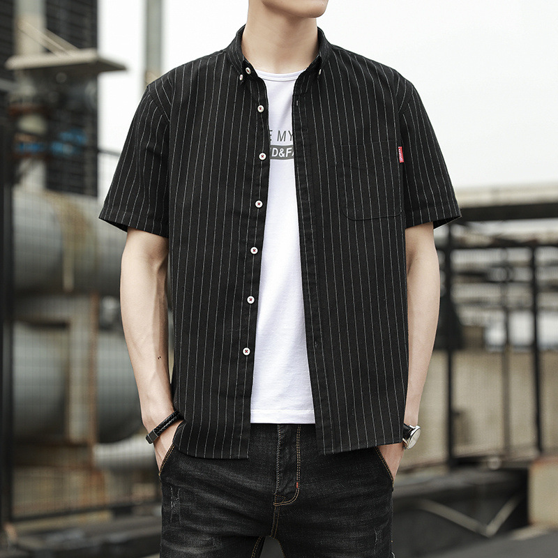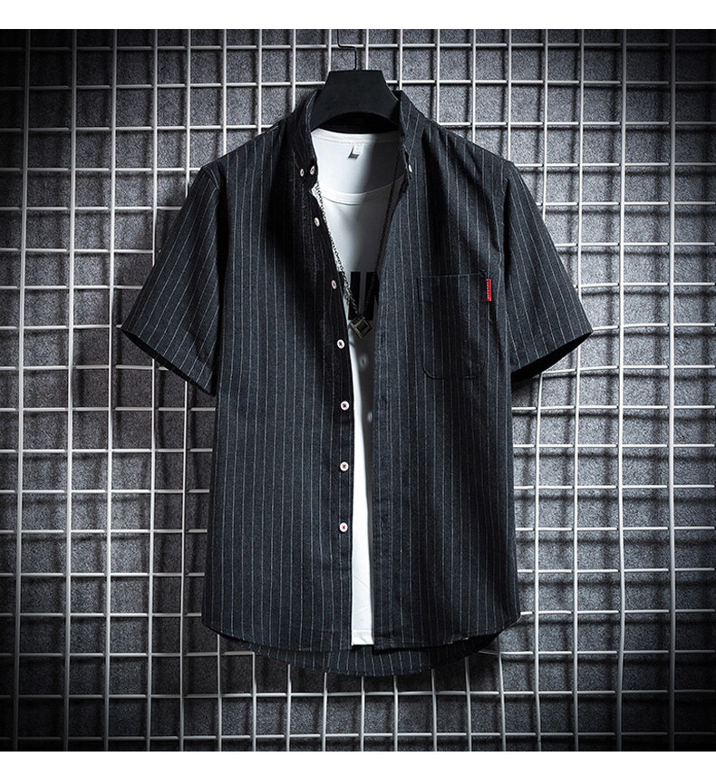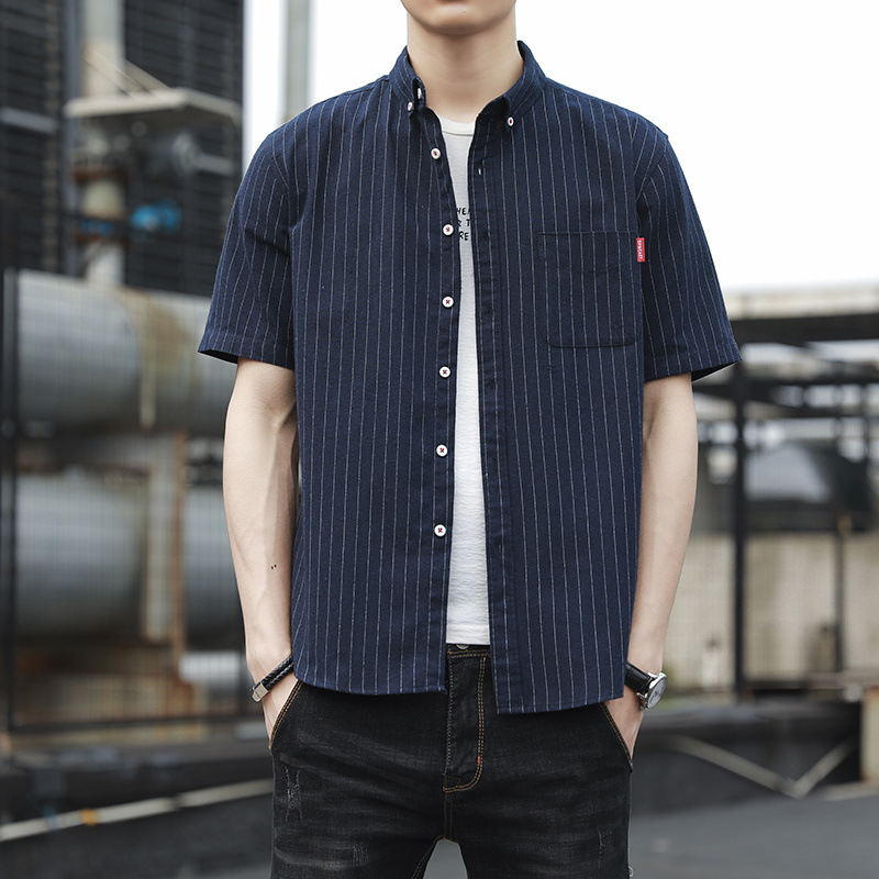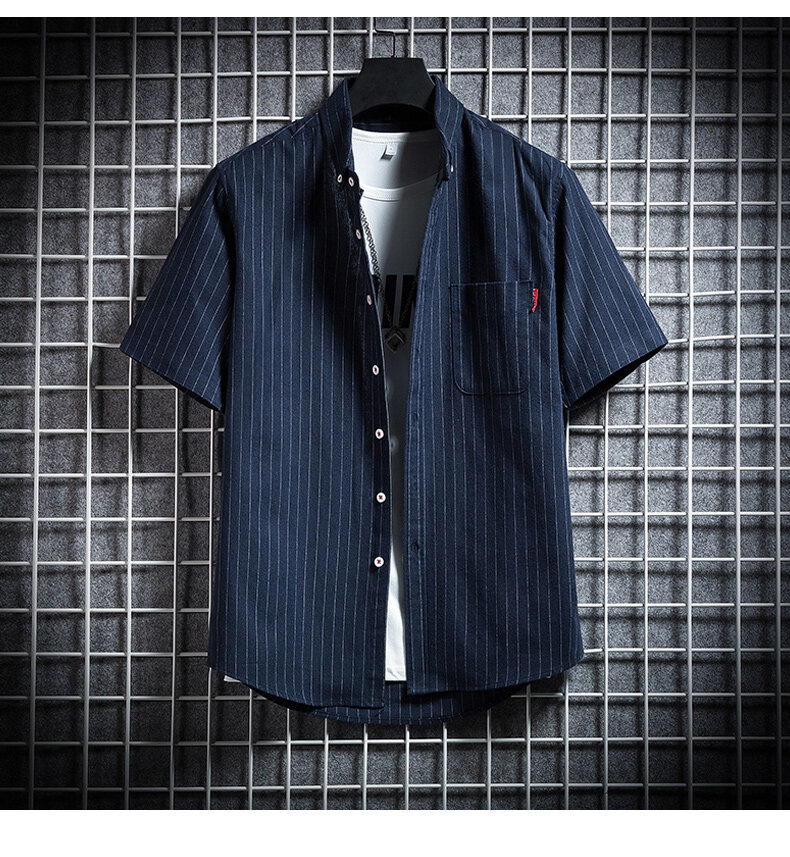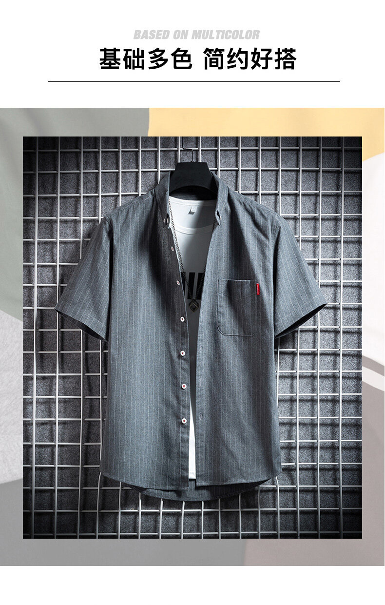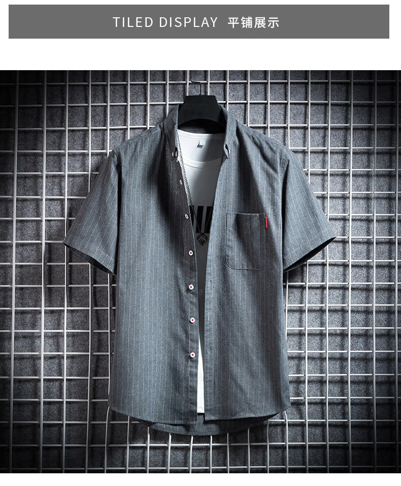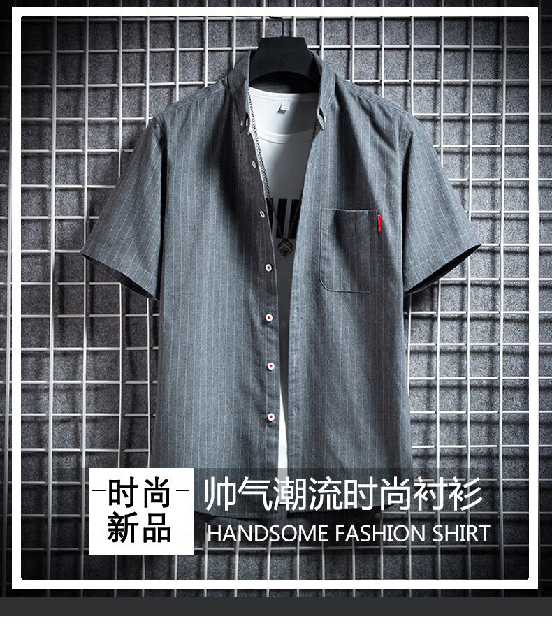 크로스 보더 스트라이프 남성용 캐주얼 셔츠 여름 트렌디 남성용 버튼 칼라 루즈 짧은 소매 탑 스트리트 스트라이프 셔츠스토어 가기