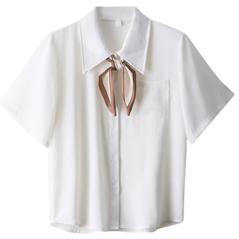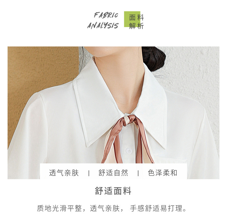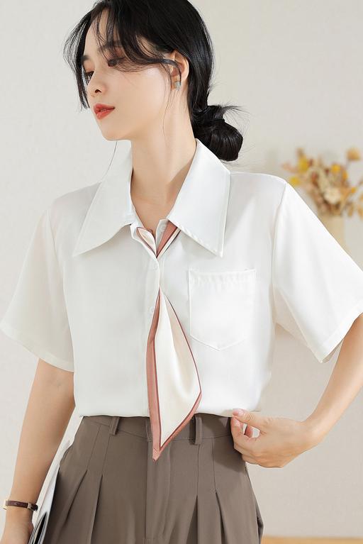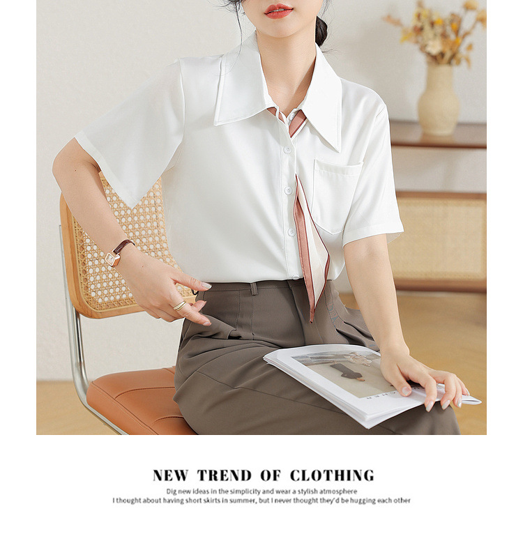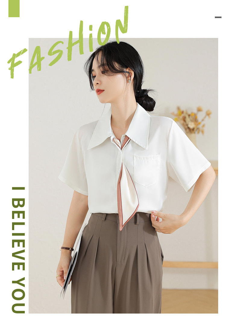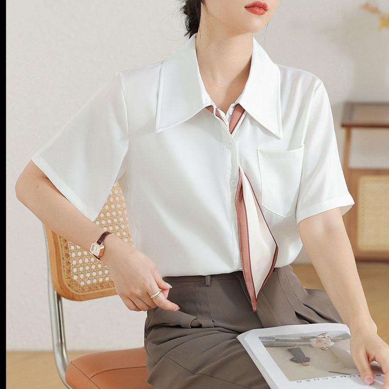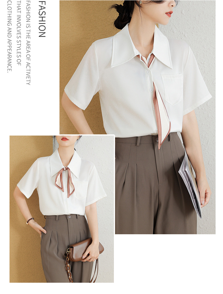리얼 샷 보우 옷깃, 전문 시폰 셔츠 화이트 셔츠 여성 여름 최고 통근 인터뷰 짧은 소매