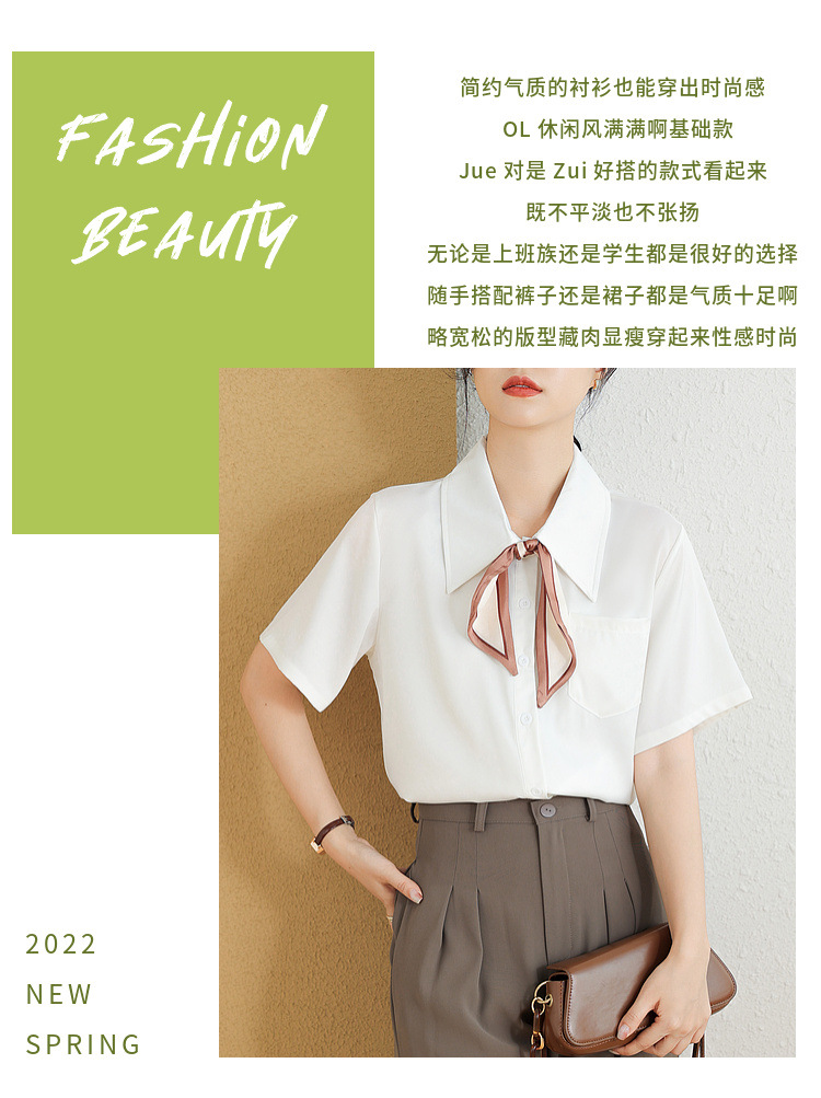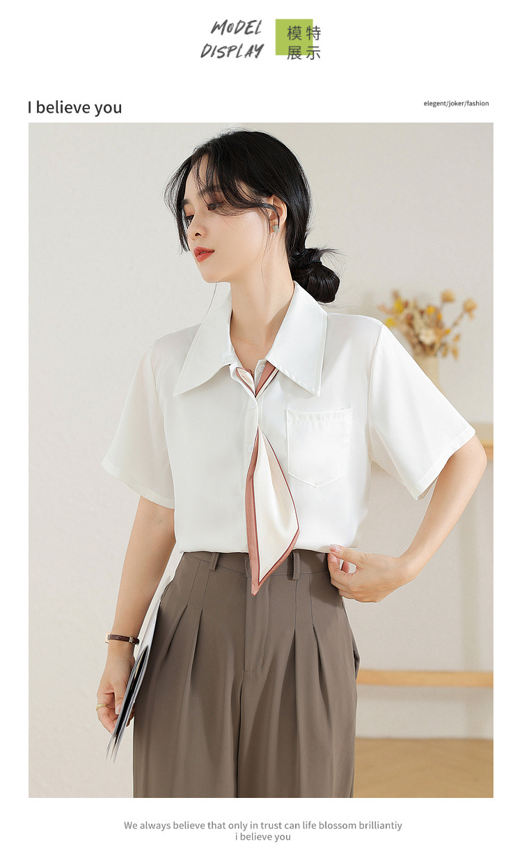 리얼 샷 보우 옷깃, 전문 시폰 셔츠 화이트 셔츠 여성 여름 최고 통근 인터뷰 짧은 소매스토어 가기