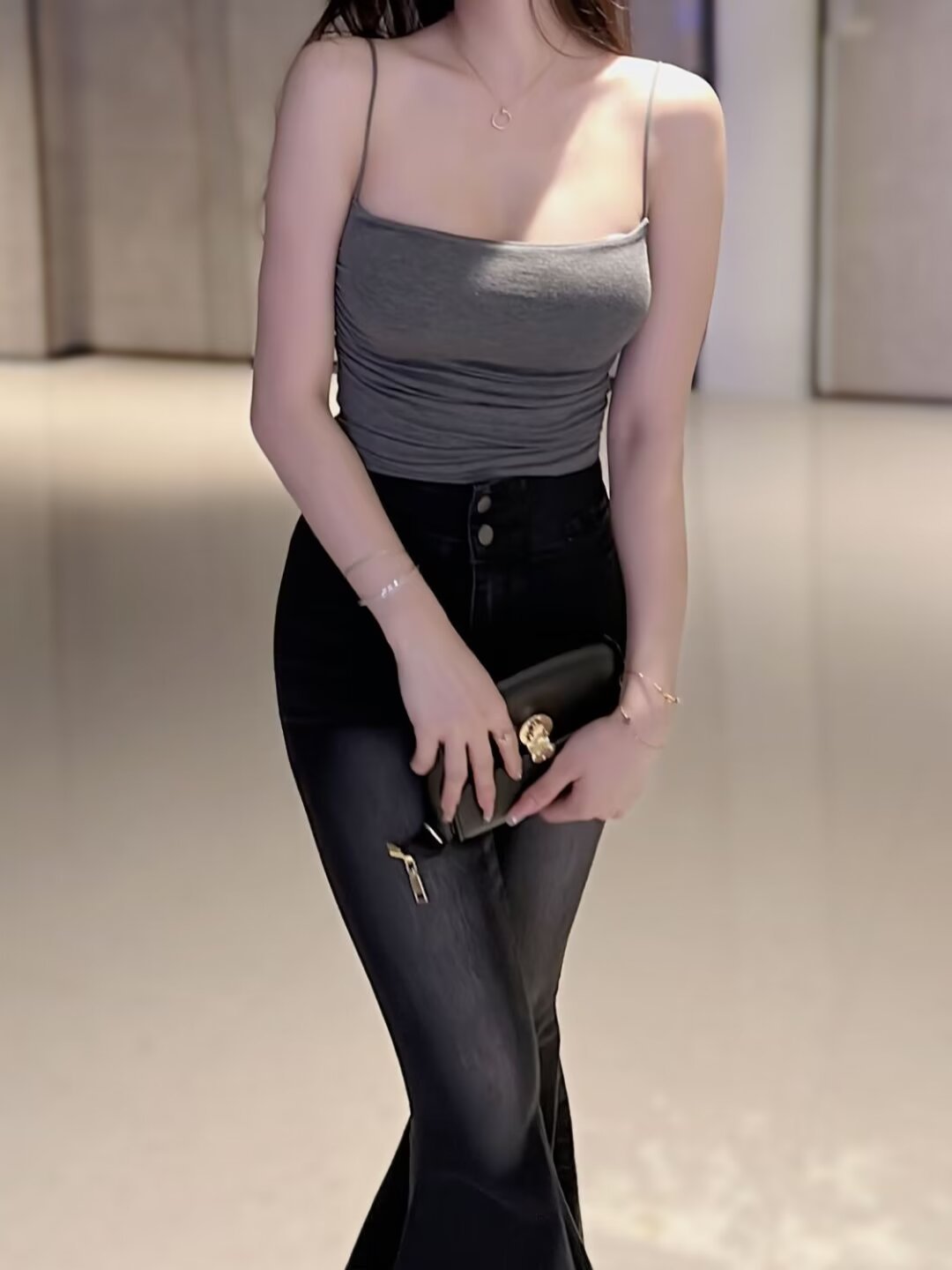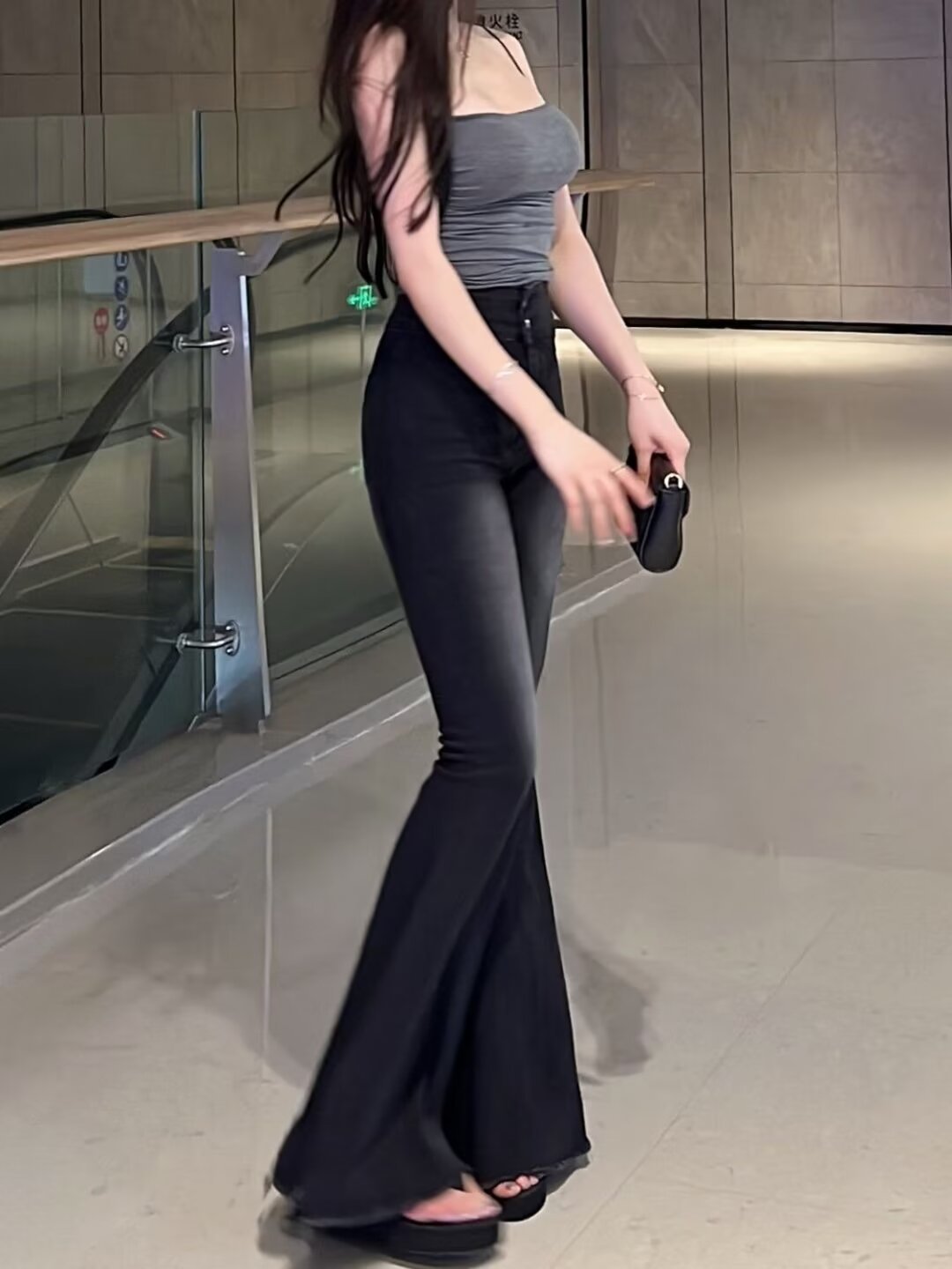 블랙 빈티지 피쉬 테일 대형 경적 청바지 여성의 봄과 여름 새로운 높은 허리 슬림-적합 탄성 슬림 룩 긴 바지스토어 가기