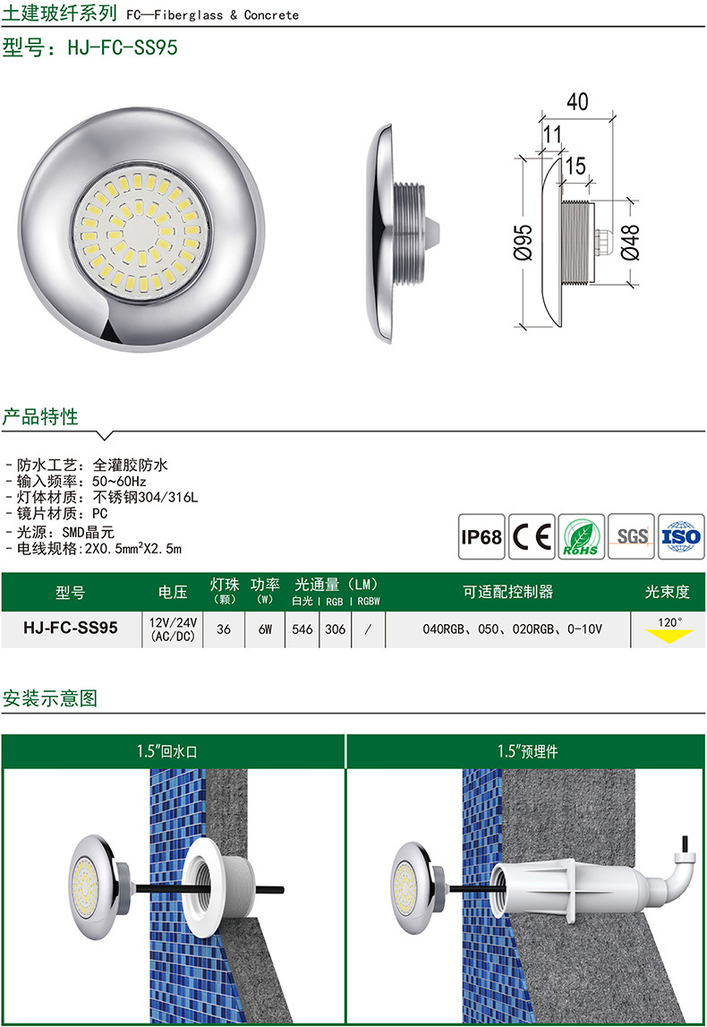 304/316L 스테인리스 민간 수영장 수중 빛 아크릴 유리 수영장 빛 12VLED 다채로운 수중 빛