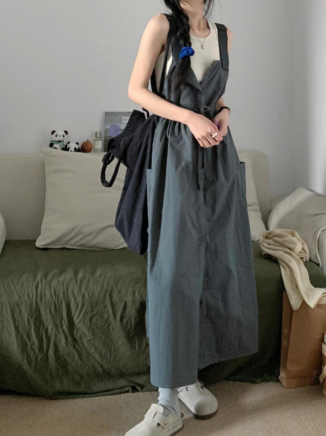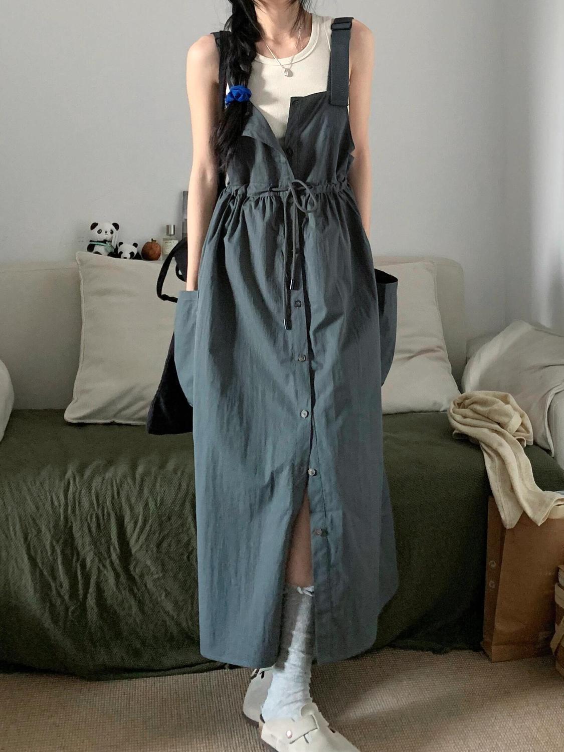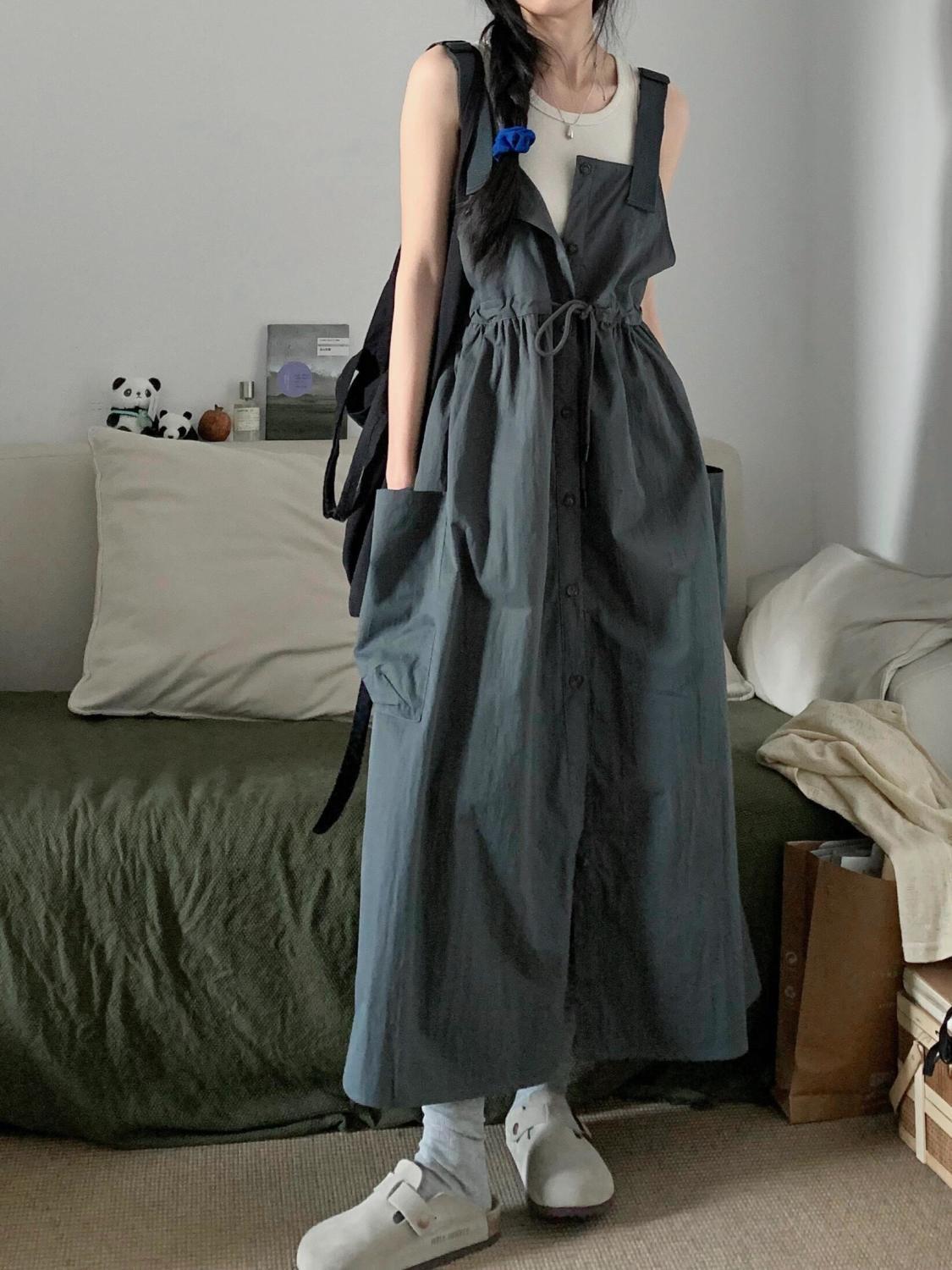 2024 여름 한국 스타일 패션 패션 유행 빈티지 작업 조끼 슬링 스커트 슬림 핏 슬링 조끼 투피스 세트