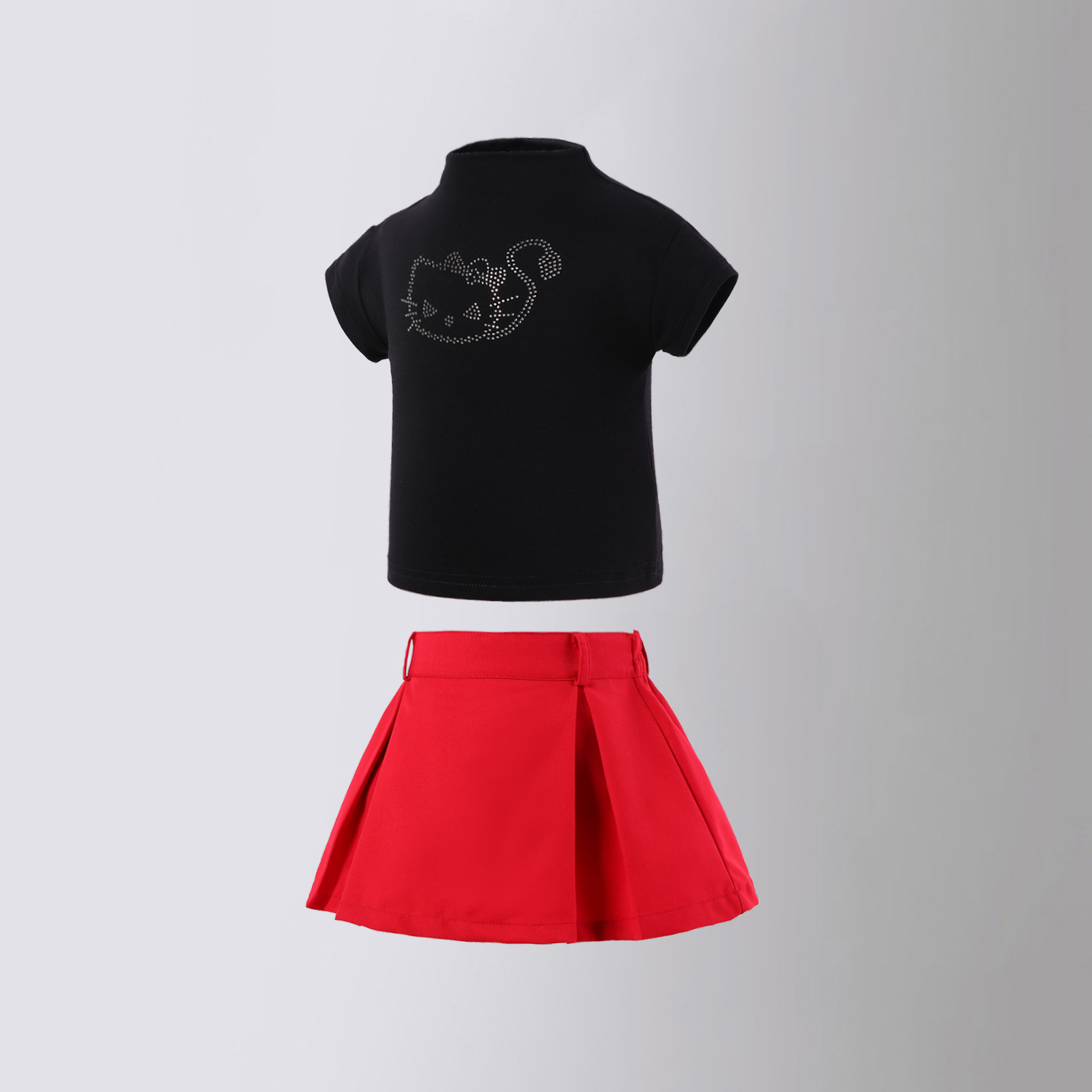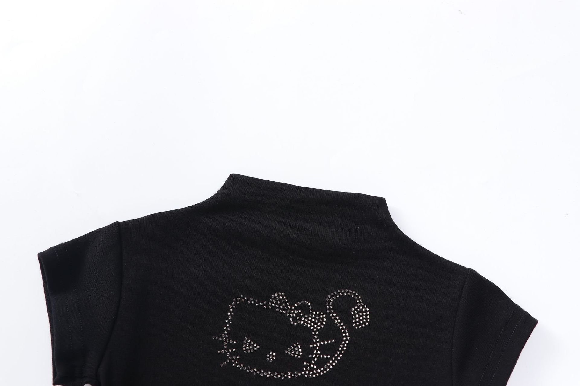 【재고정리】여아용 키티 고양이 반짝이 반팔 티셔츠 여름용 블랙 만능 상의 스커트