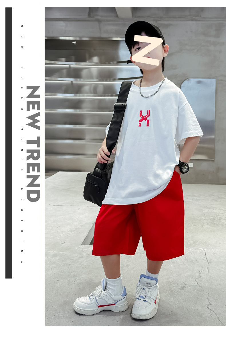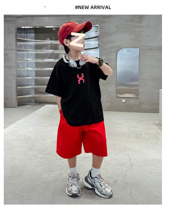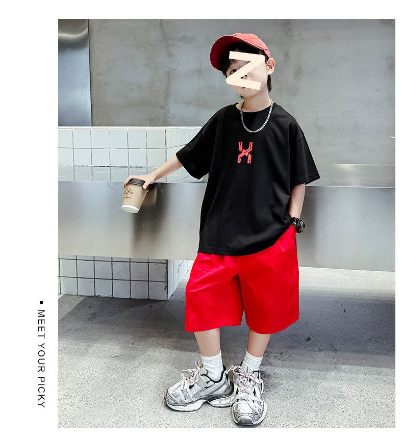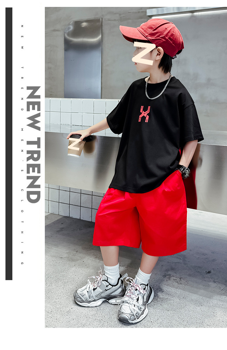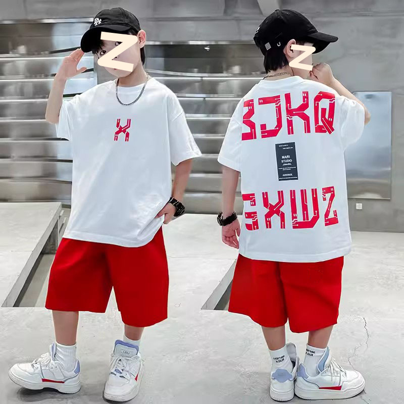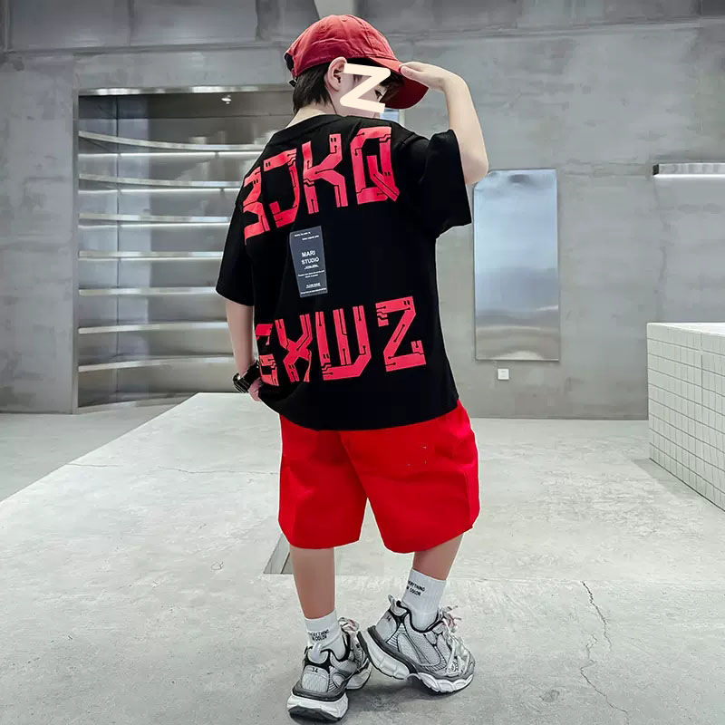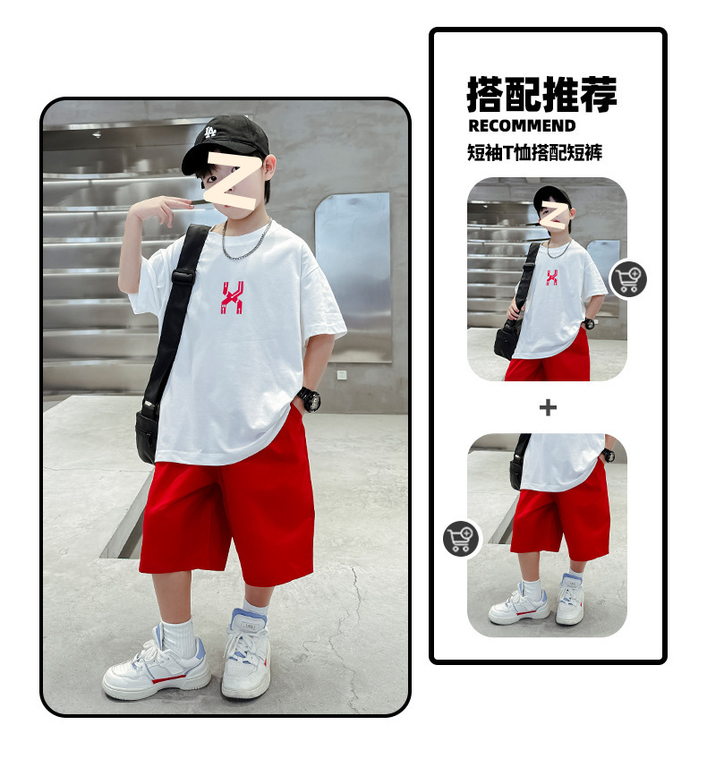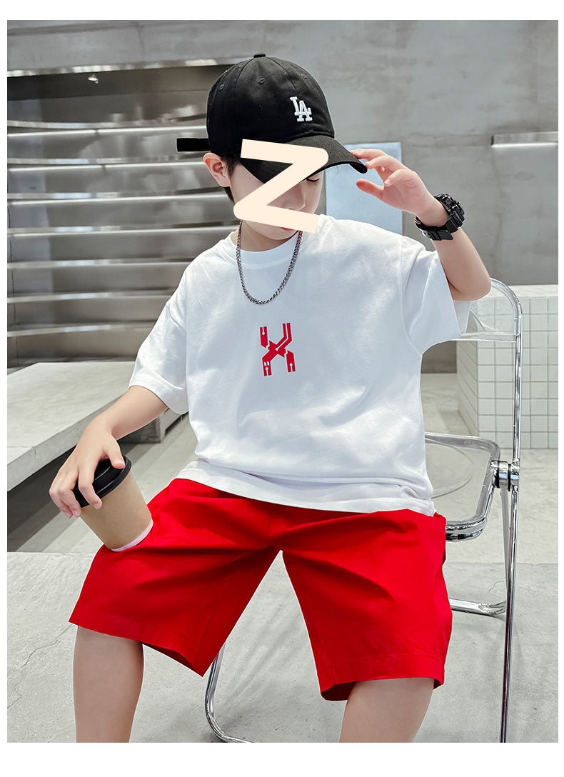 남자들의 여름 반팔 세트 2024 새로운 스타일 중대형 어린이 잘 생긴 소년 티셔츠 5 점 바지 스포츠 투피스 유행 세트스토어 가기