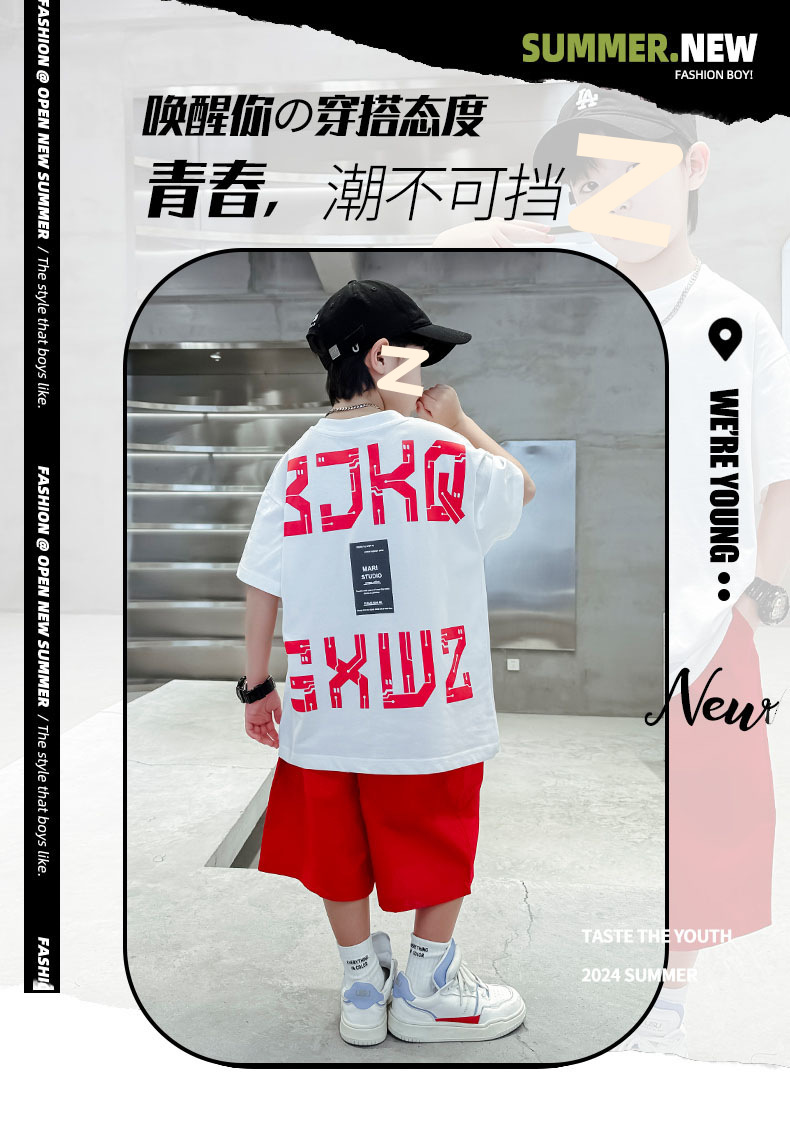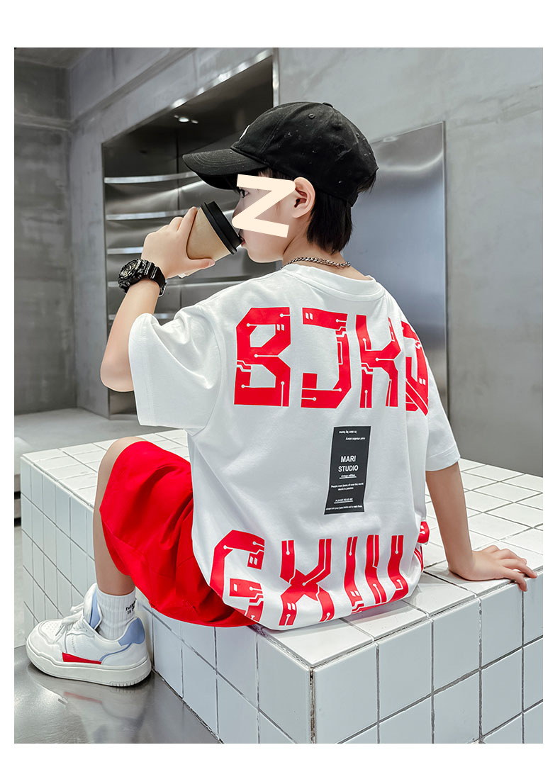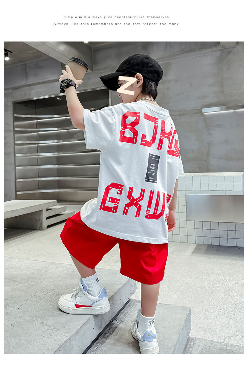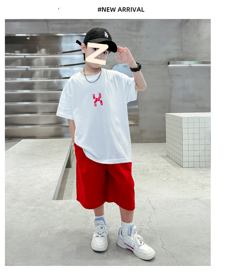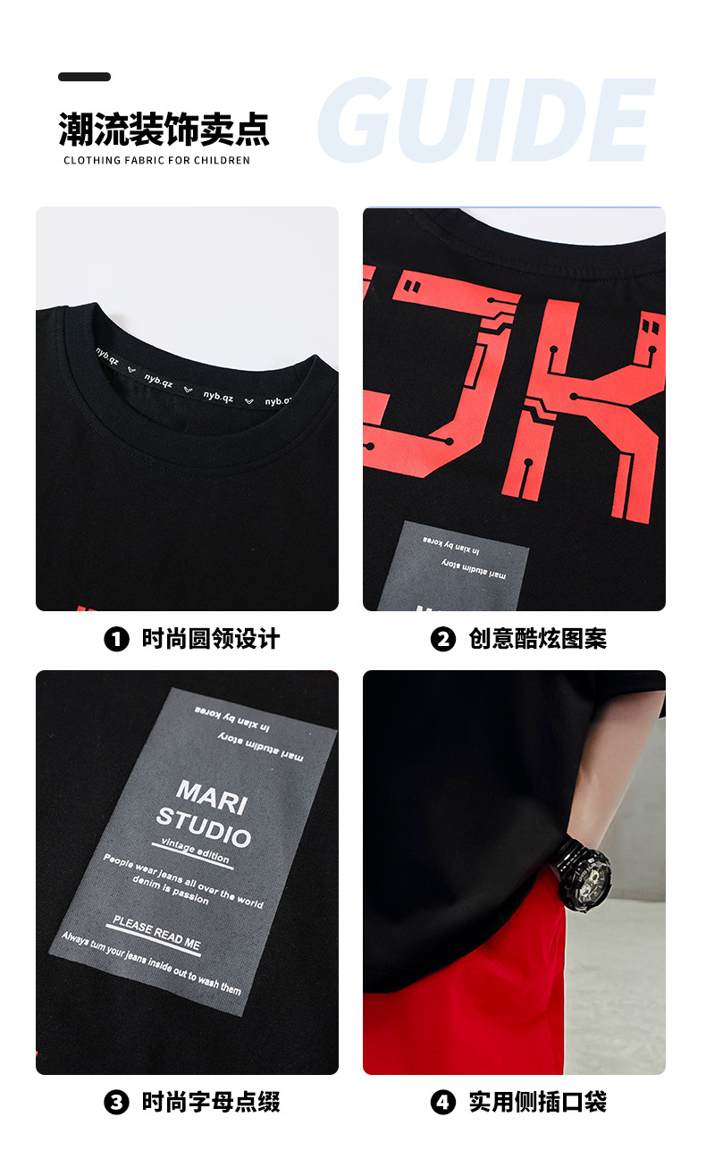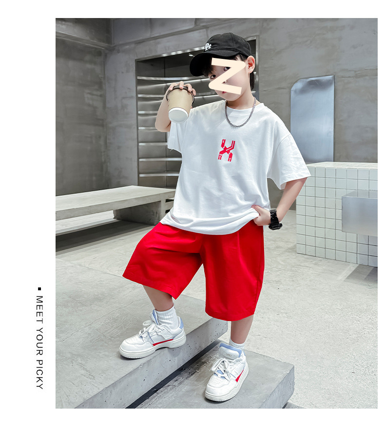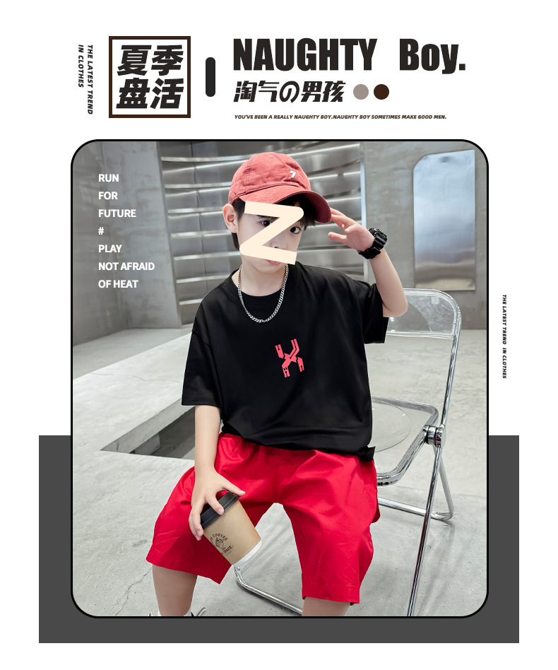 남자들의 여름 반팔 세트 2024 새로운 스타일 중대형 어린이 잘 생긴 소년 티셔츠 5 점 바지 스포츠 투피스 유행 세트스토어 가기