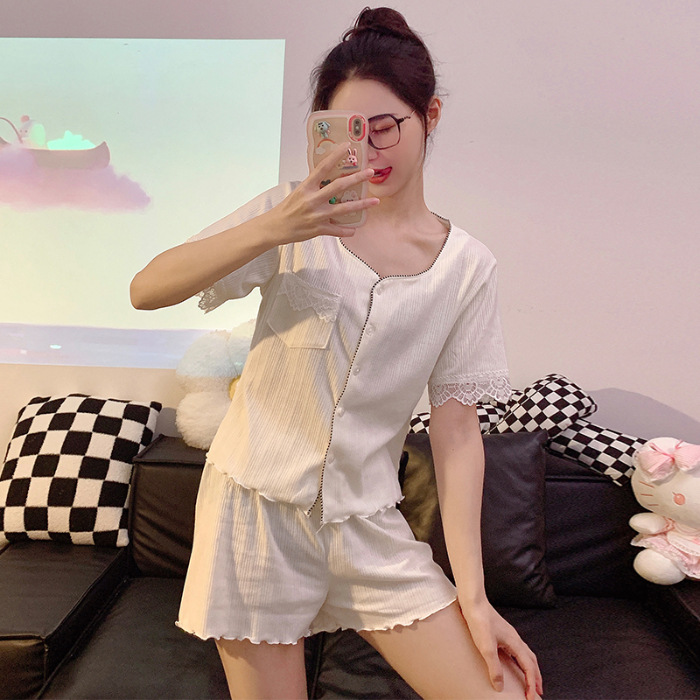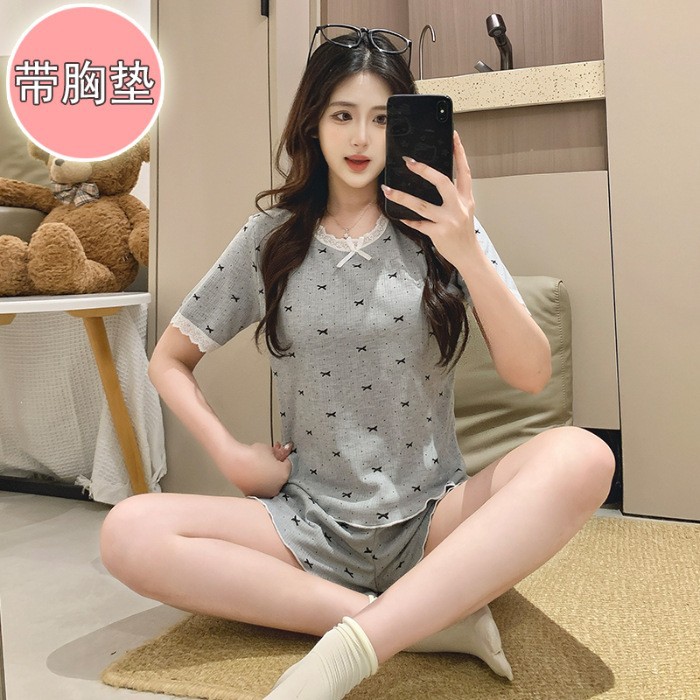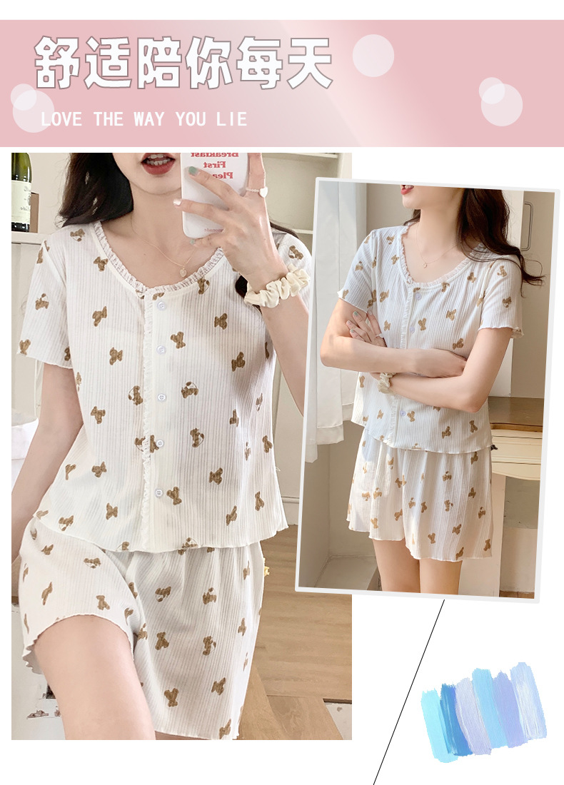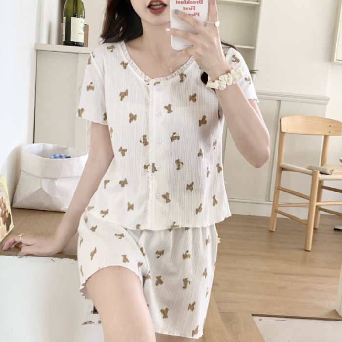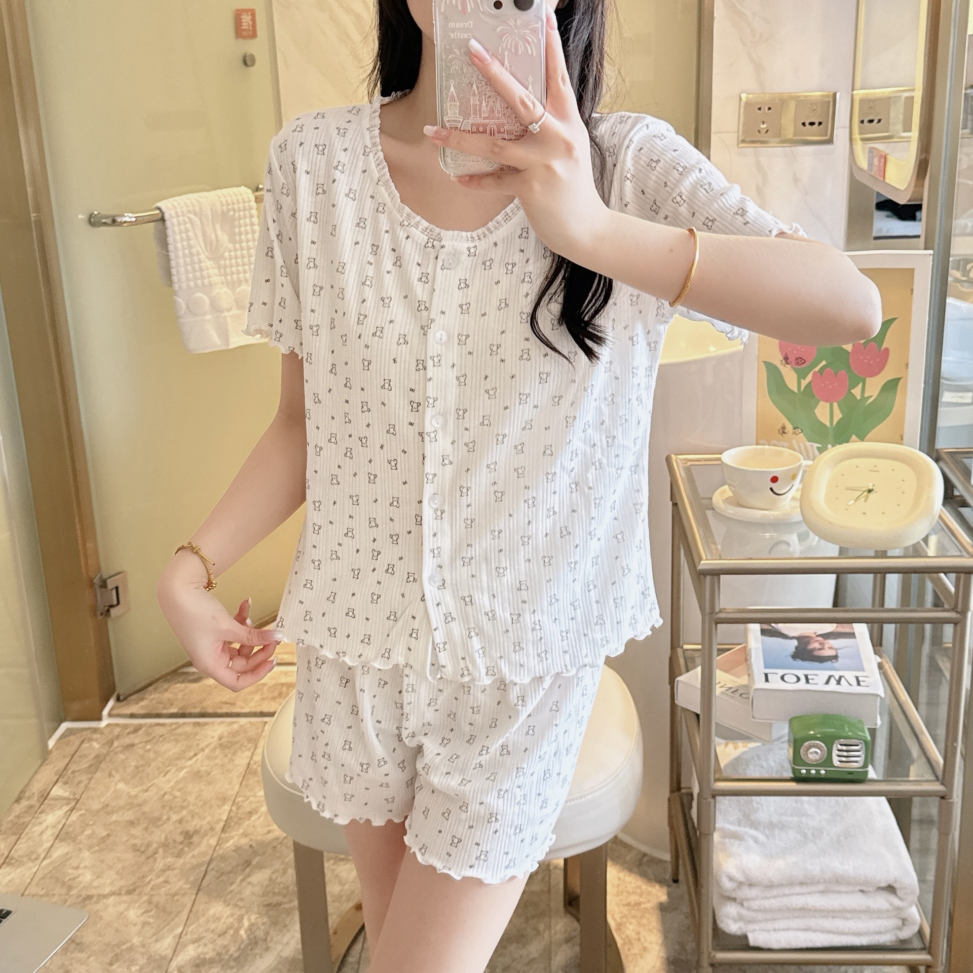 짧은 소매 반바지 세트 여성용 꽃 달콤한 귀여운 소녀의 카디건 홈 의류 캐주얼 프린트 의류