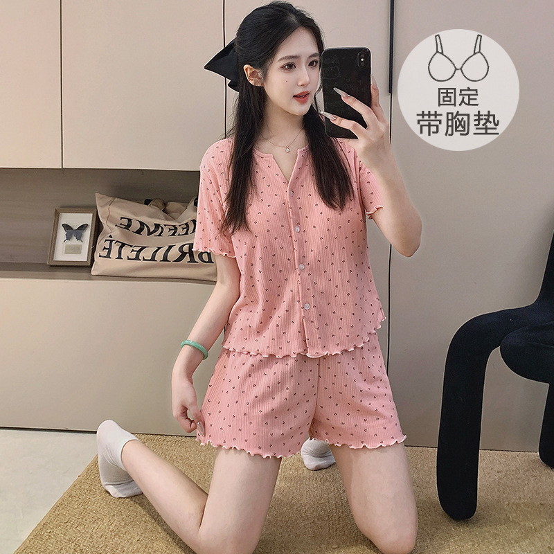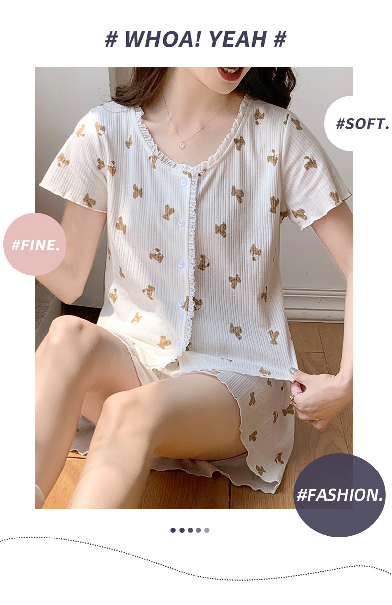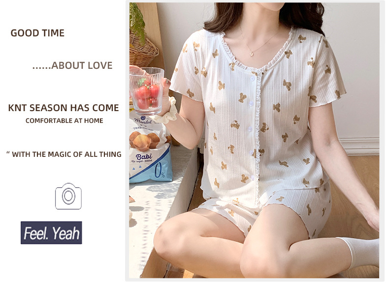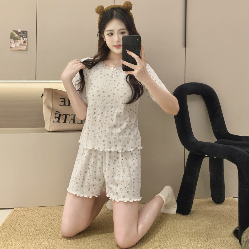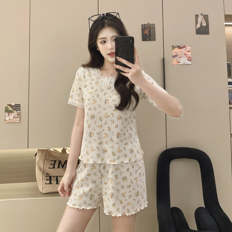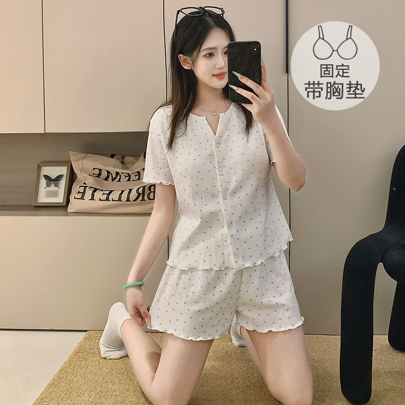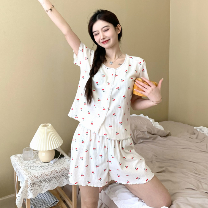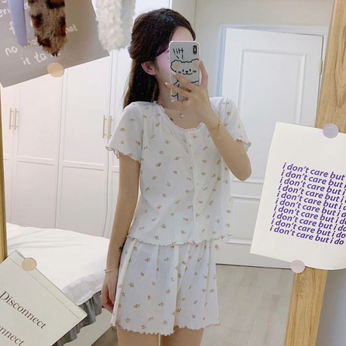 짧은 소매 반바지 세트 여성용 꽃 달콤한 귀여운 소녀의 카디건 홈 의류 캐주얼 프린트 의류스토어 가기
