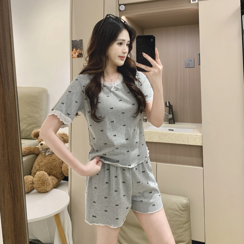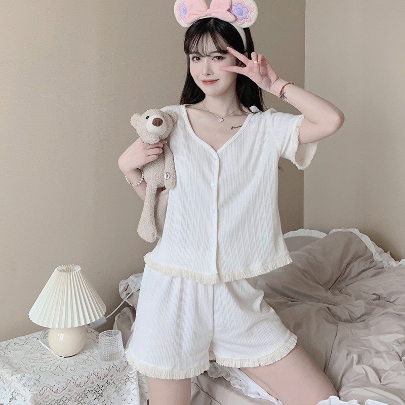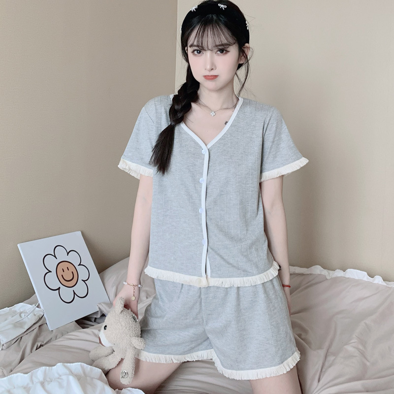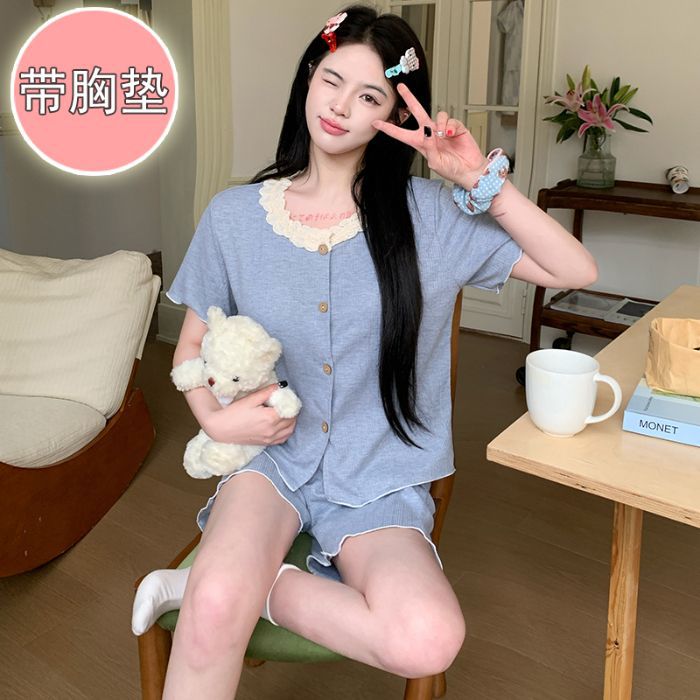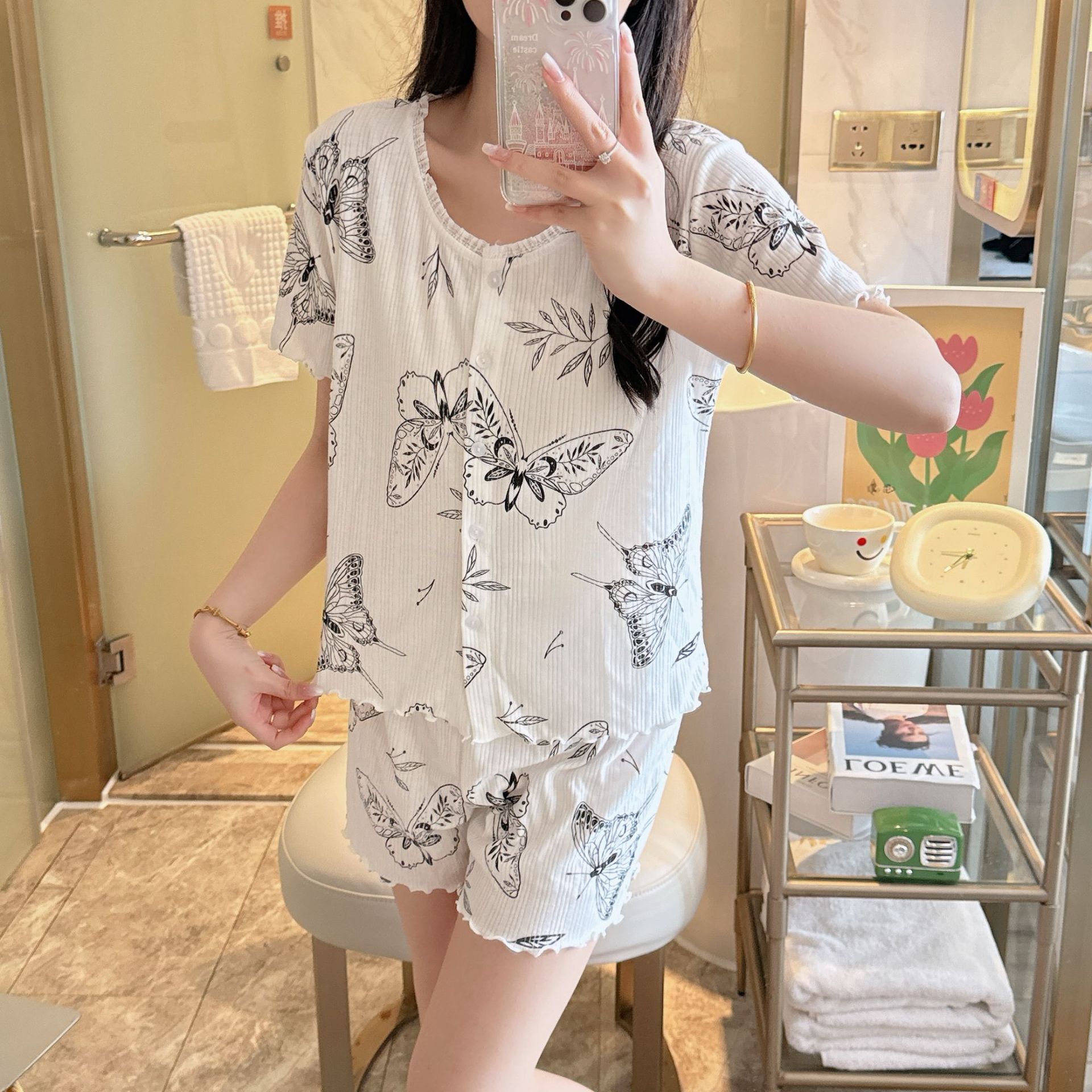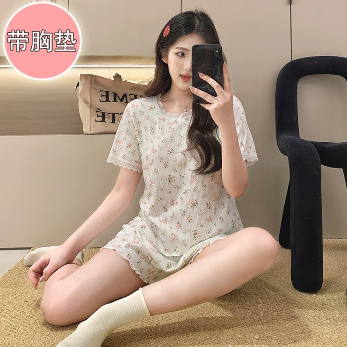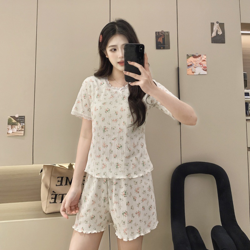 짧은 소매 반바지 세트 여성용 꽃 달콤한 귀여운 소녀의 카디건 홈 의류 캐주얼 프린트 의류스토어 가기