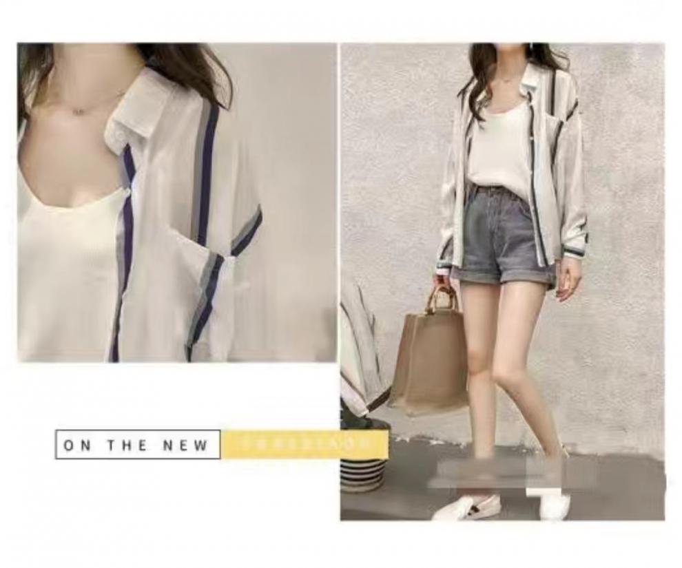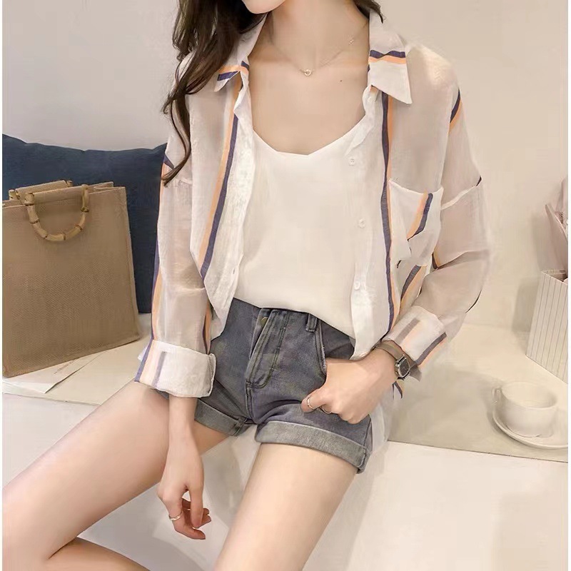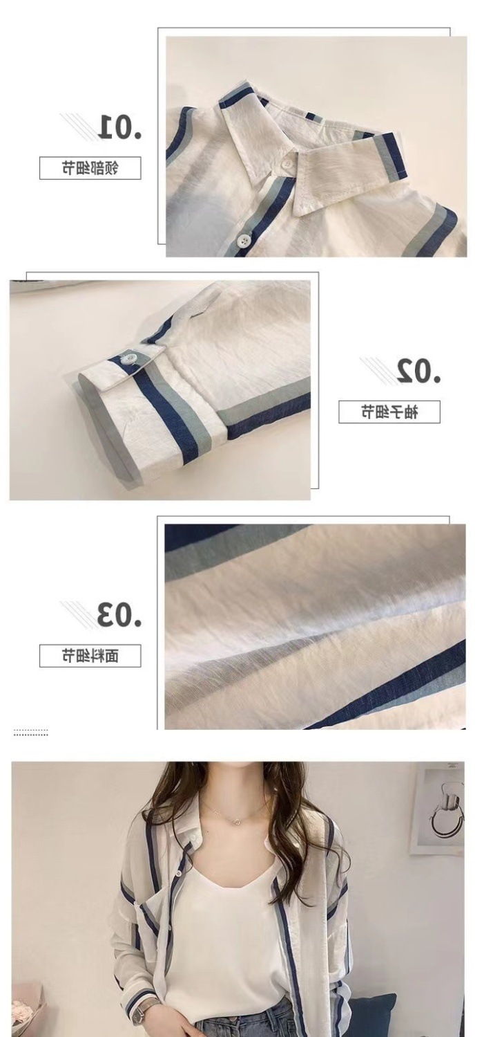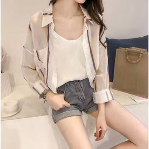 2022 년 여름 새로운 한국 스타일 스트라이프 간단한 선 스크린 울트라 얇은 느슨한 셔츠 재킷스토어 가기
