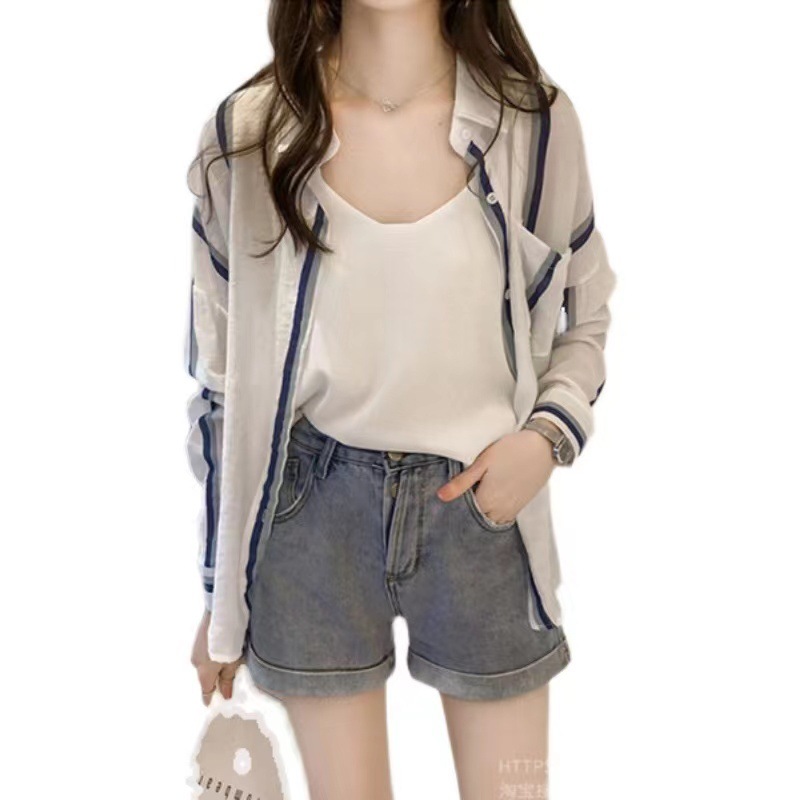2022 년 여름 새로운 한국 스타일 스트라이프 간단한 선 스크린 울트라 얇은 느슨한 셔츠 재킷