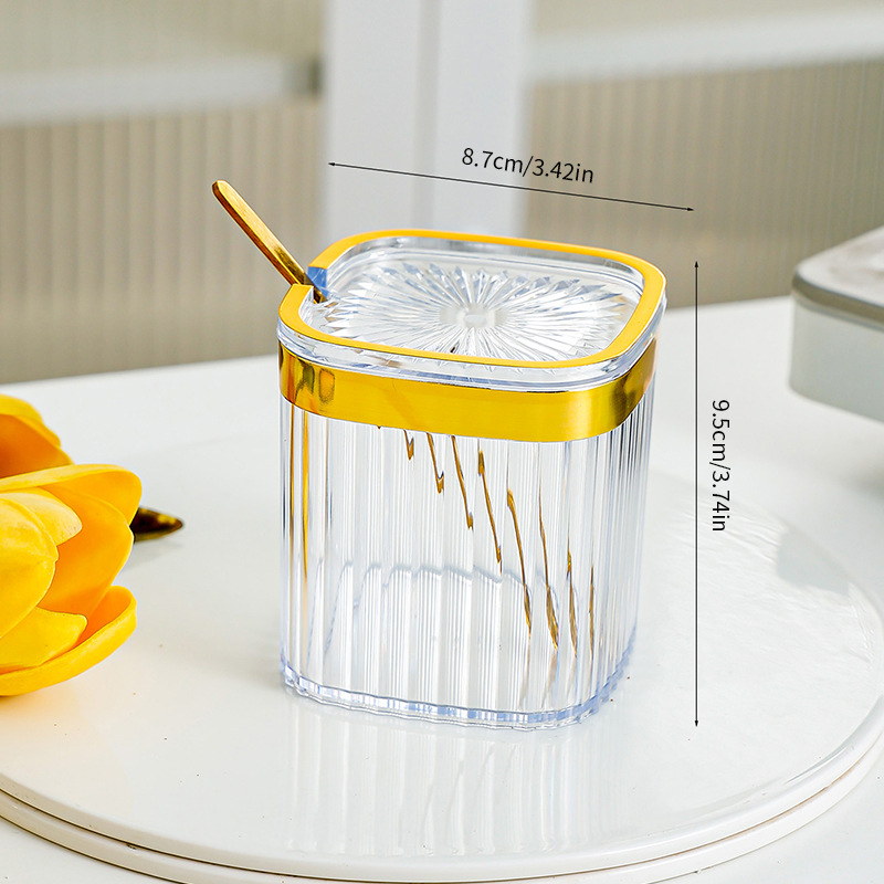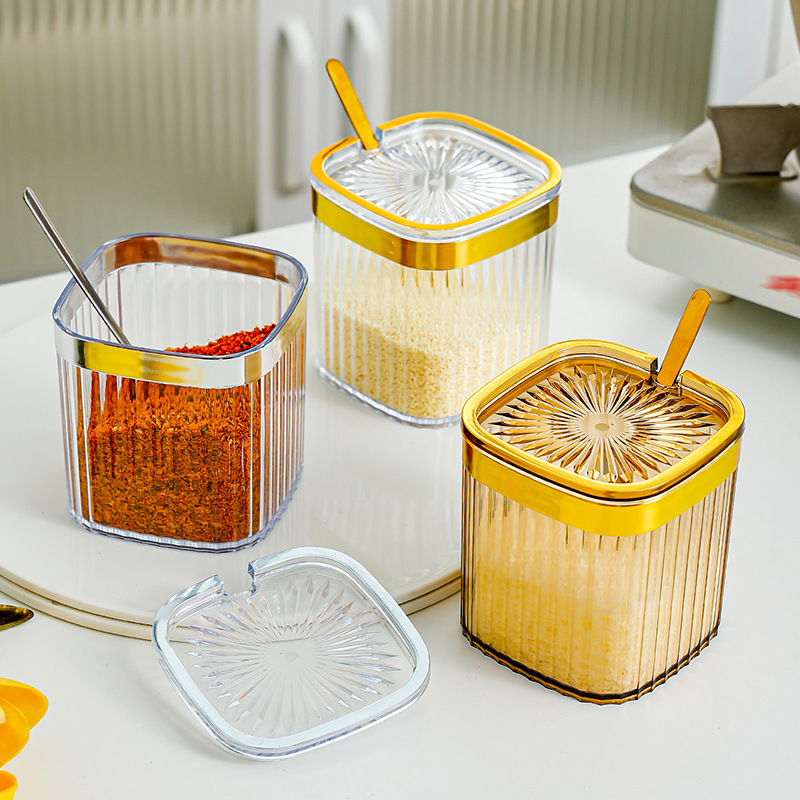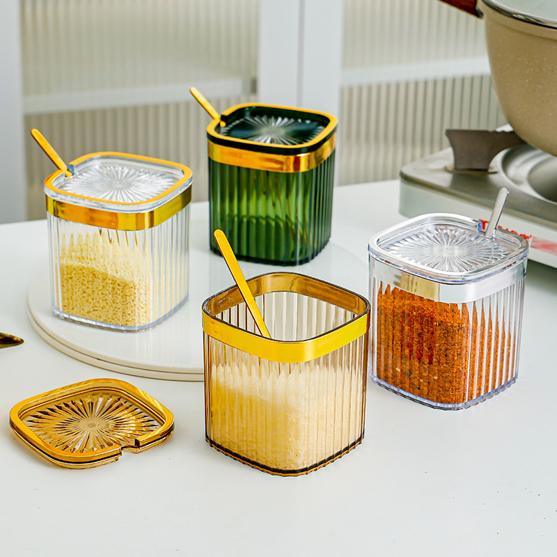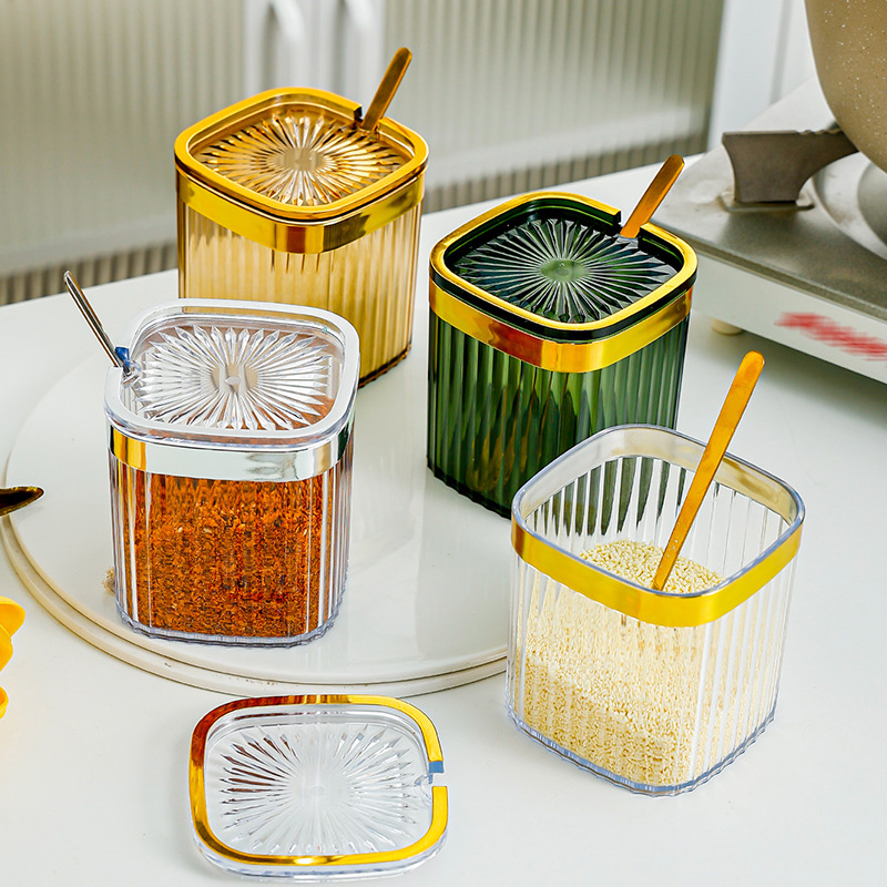 • 금 가장자리 숟가락으로 투명한 색 사각형 조미료 항아리