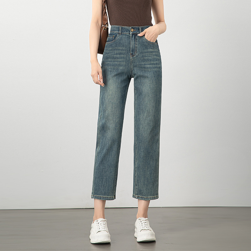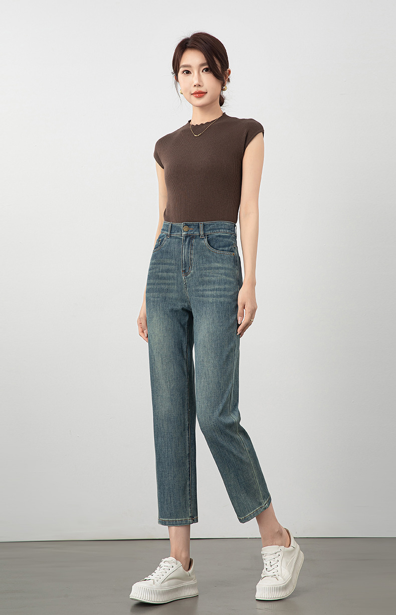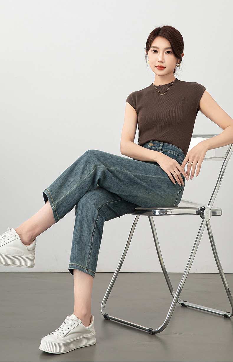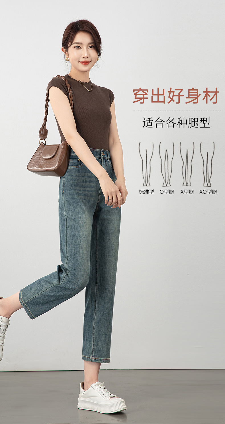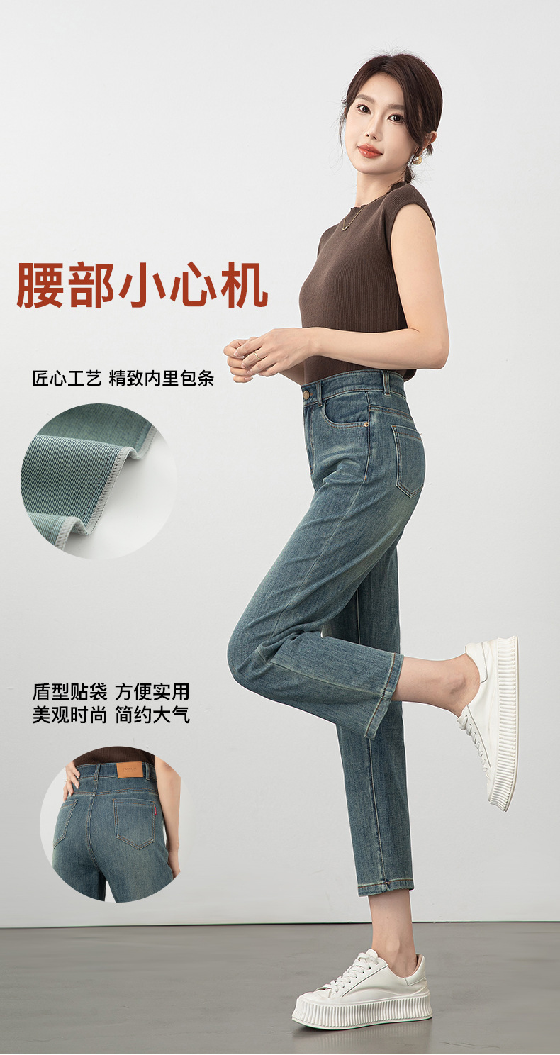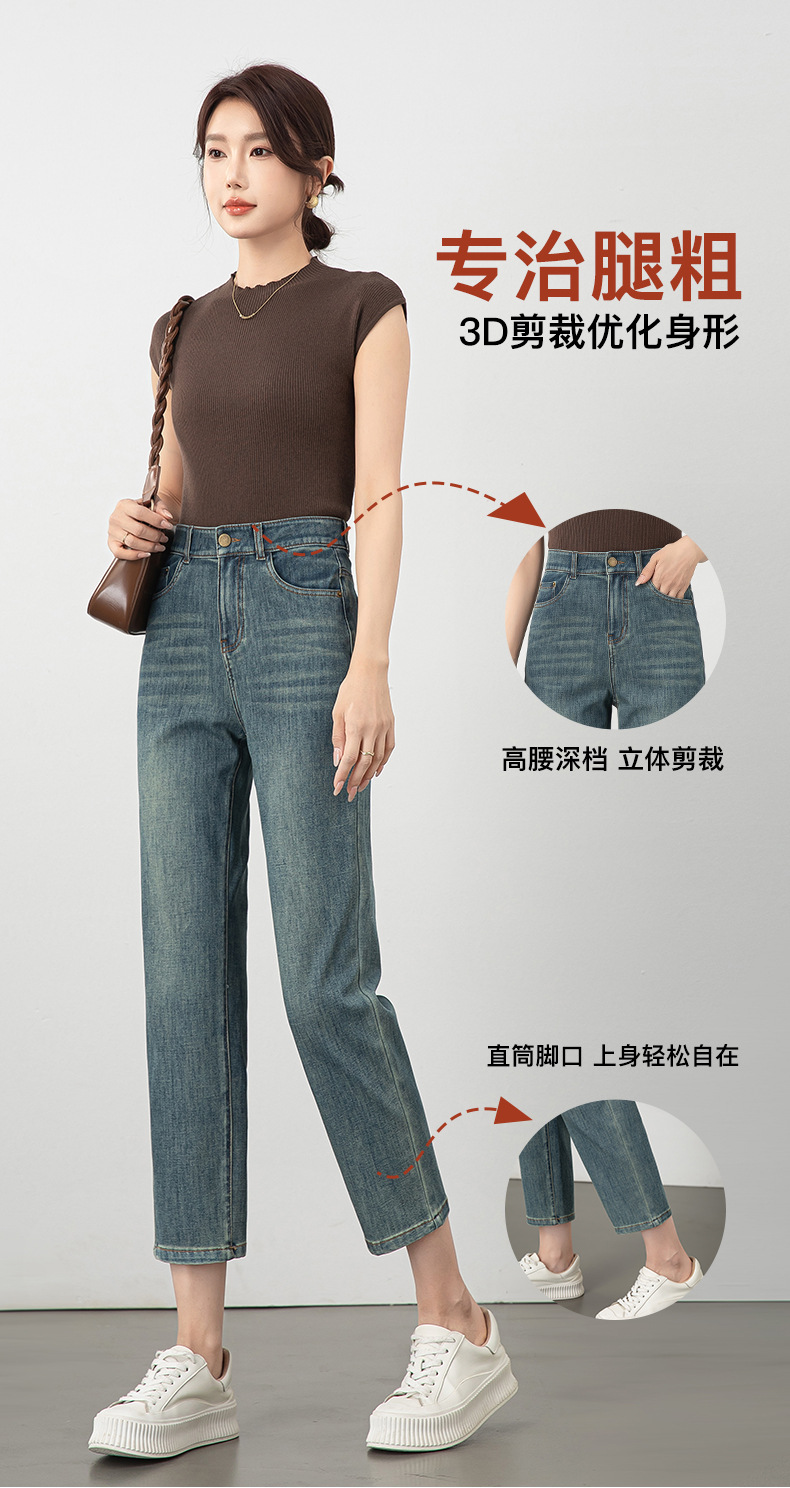 2025년 여름 신상 여성용 미드라이즈 4방향 스트레치 데님 바게트 팬츠, 한국 스타일의 키 작은 분들을 위한 9부 스트레이트 팬츠 8086스토어 가기