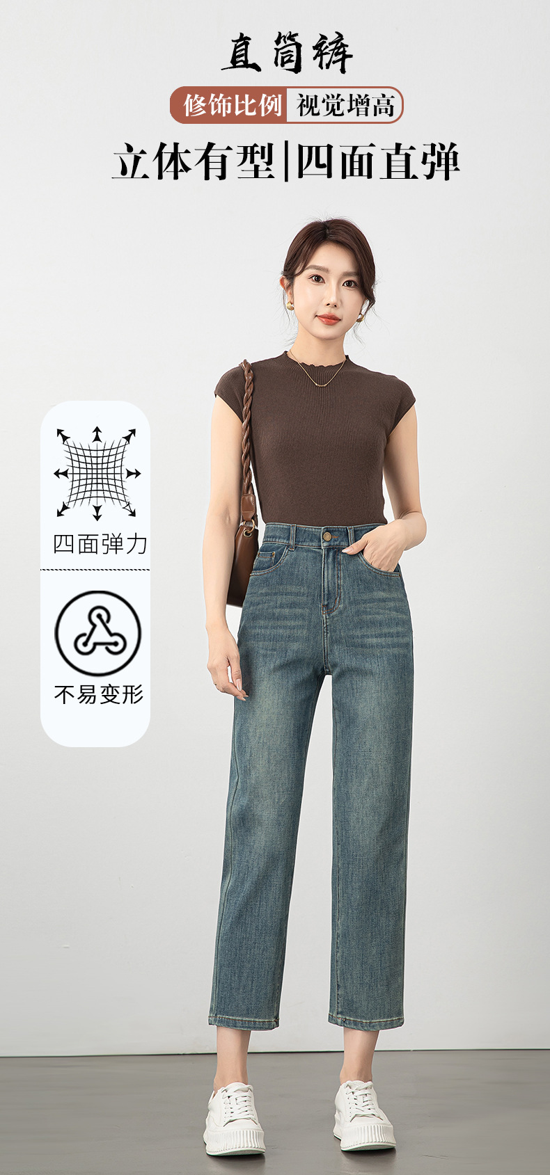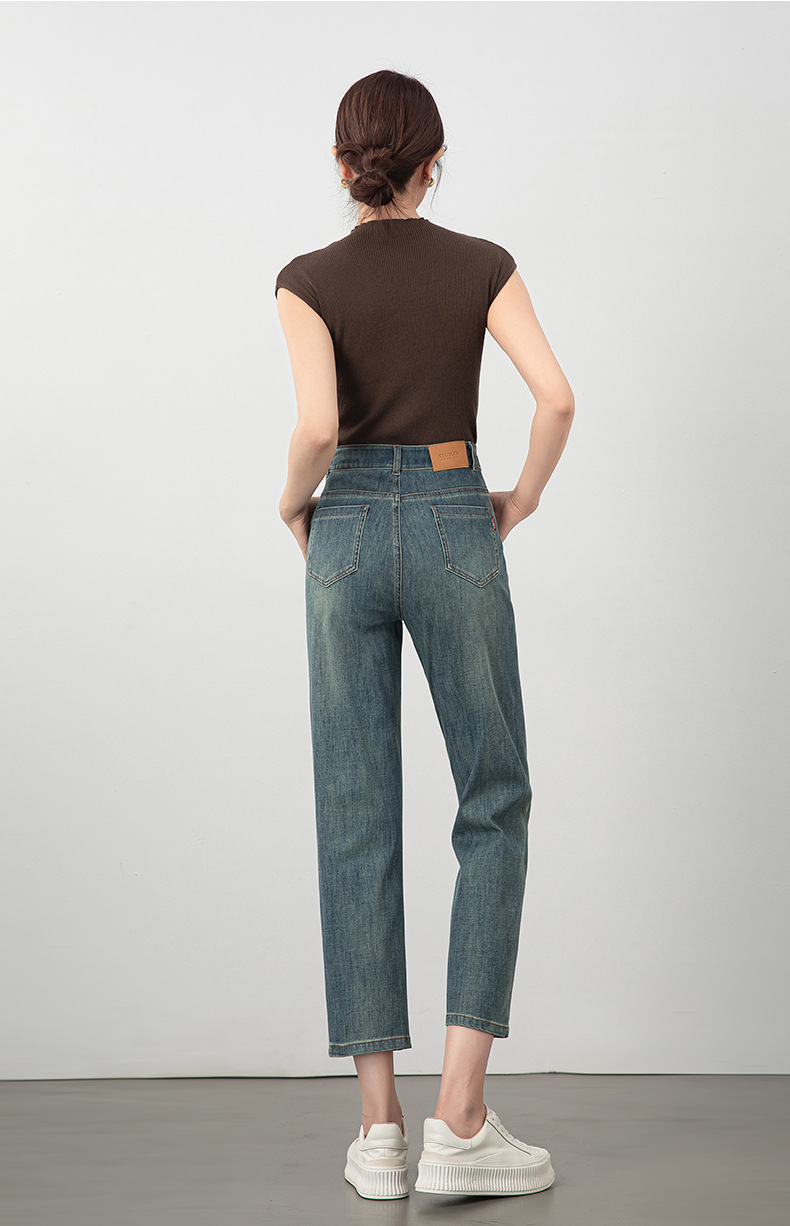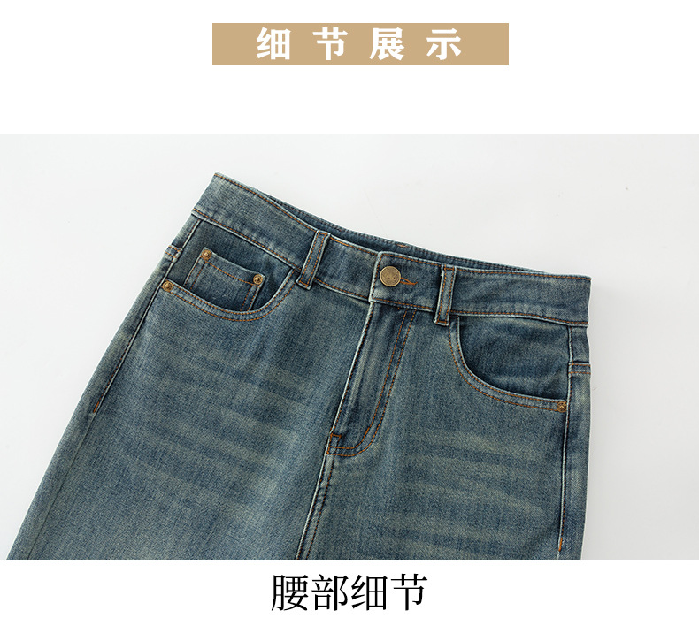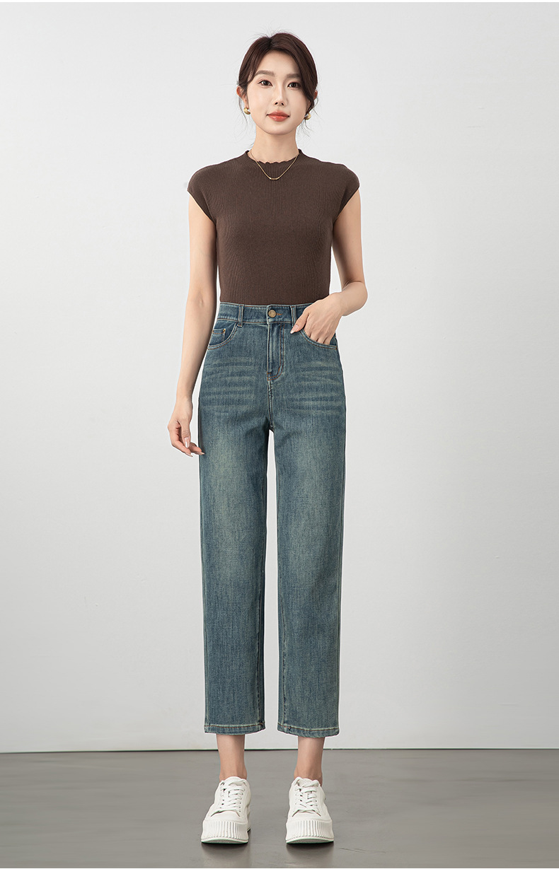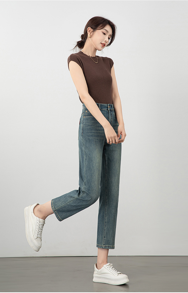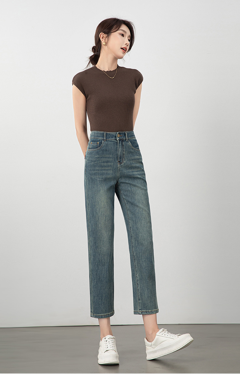 2025년 여름 신상 여성용 미드라이즈 4방향 스트레치 데님 바게트 팬츠, 한국 스타일의 키 작은 분들을 위한 9부 스트레이트 팬츠 8086스토어 가기