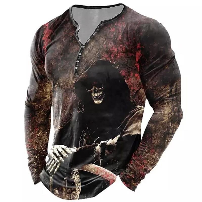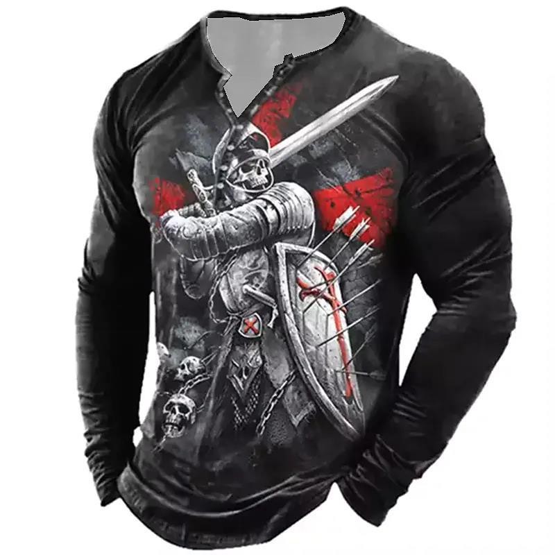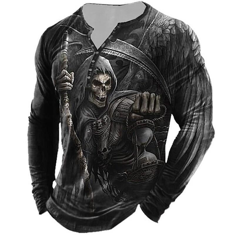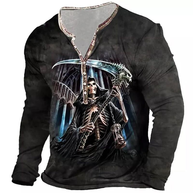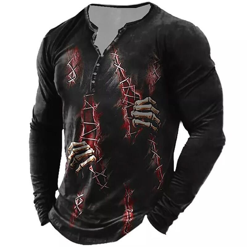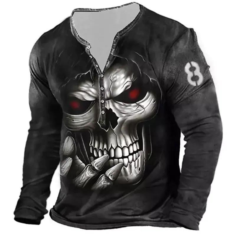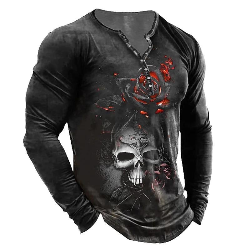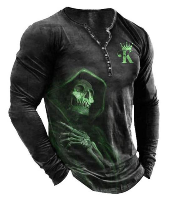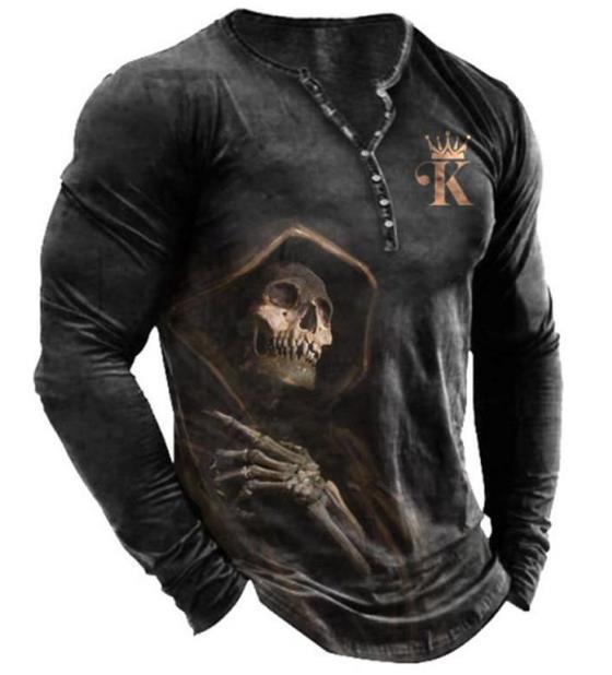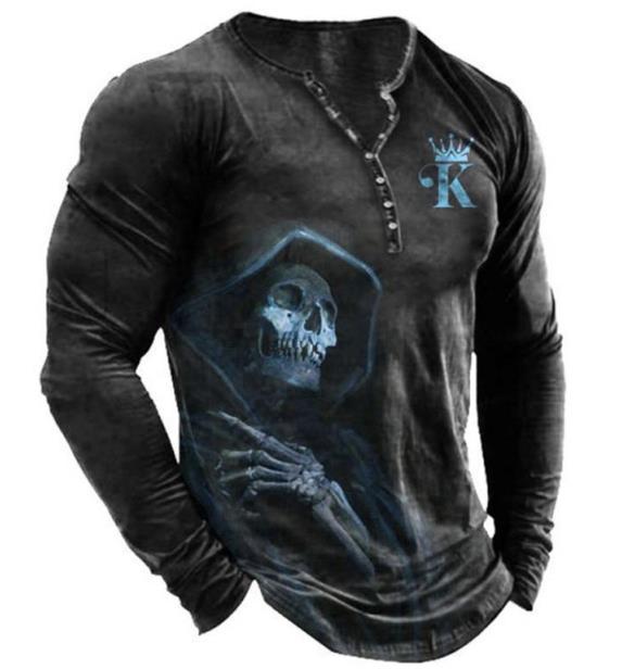 남성 유럽과 미국의 V 넥 티셔츠 긴 소매 오픈 플래켓 크라운 두개골 7 버튼 모조 면 셔츠 헨리 셔츠 긴 소매
