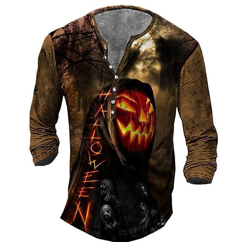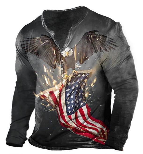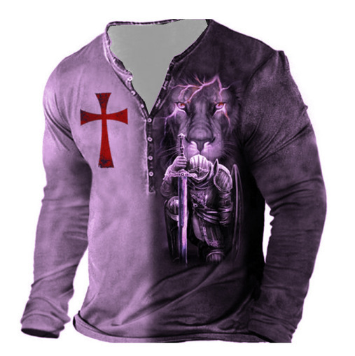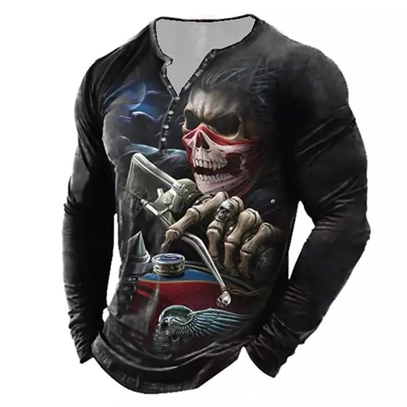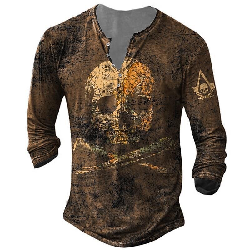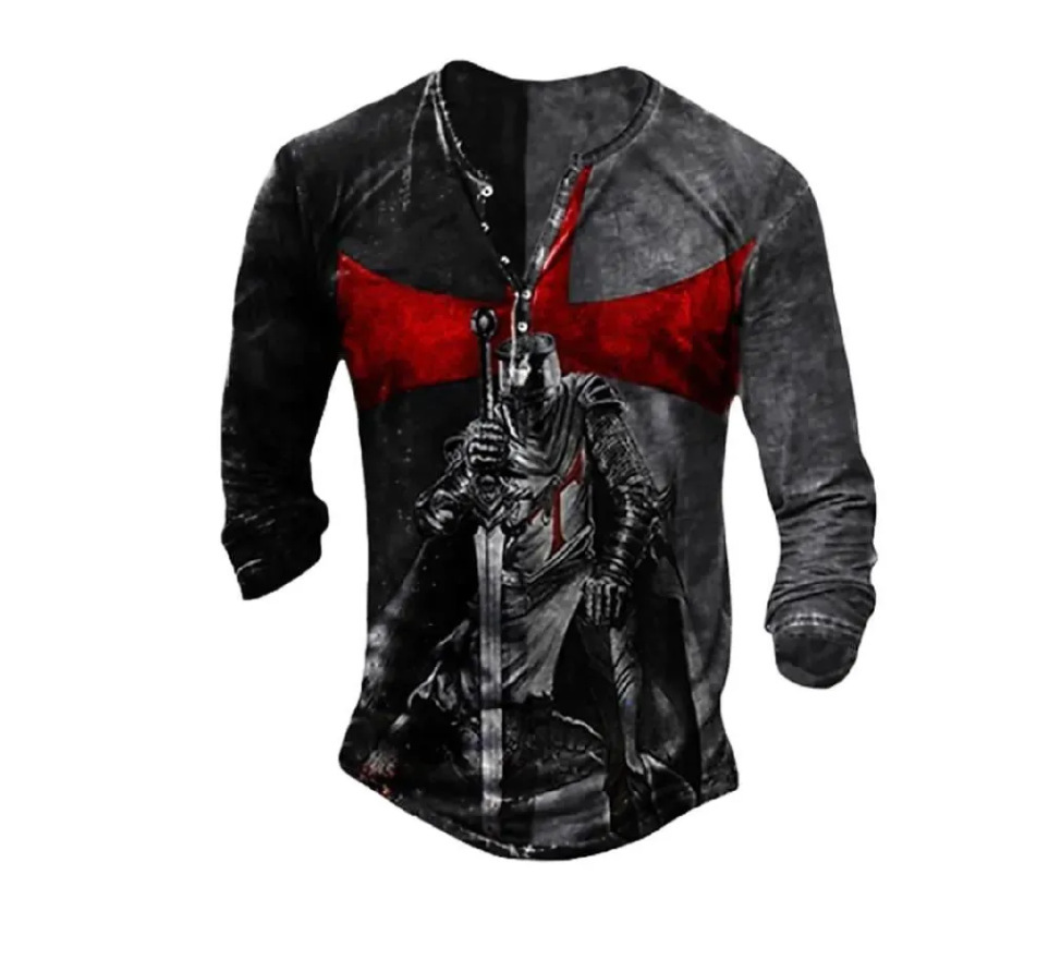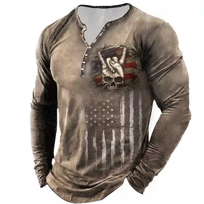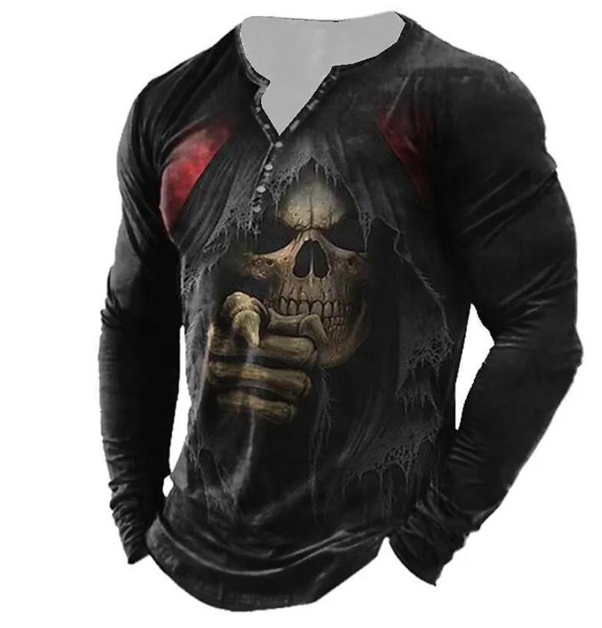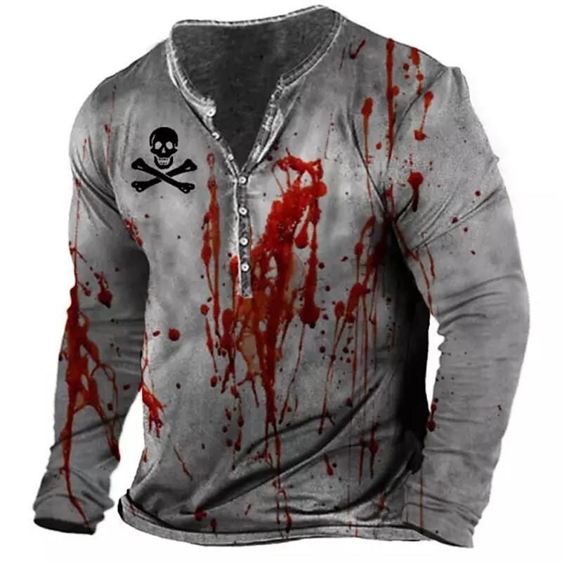 남성 유럽과 미국의 V 넥 티셔츠 긴 소매 오픈 플래켓 크라운 두개골 7 버튼 모조 면 셔츠 헨리 셔츠 긴 소매