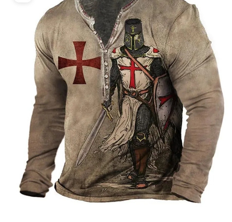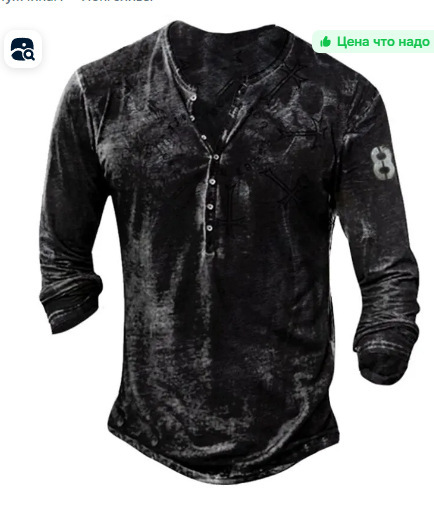 남성 유럽과 미국의 V 넥 티셔츠 긴 소매 오픈 플래켓 크라운 두개골 7 버튼 모조 면 셔츠 헨리 셔츠 긴 소매스토어 가기