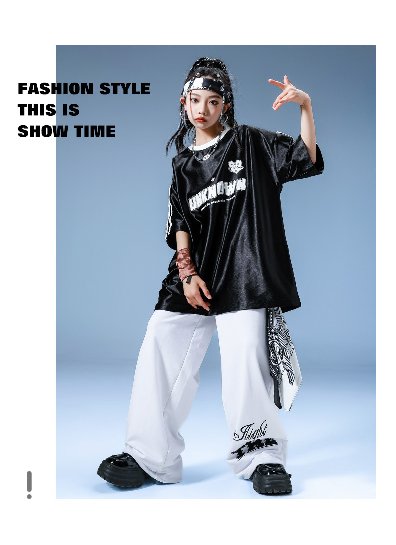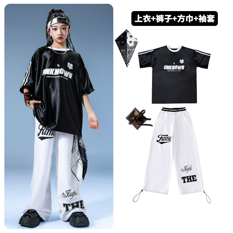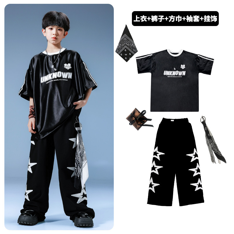 • 세트 [620D 블랙 밝은 가죽 짧은 소매 544D 화이트 스타 블랙 바지] 블랙 스퀘어 스카프 소매 흑백 펜던트