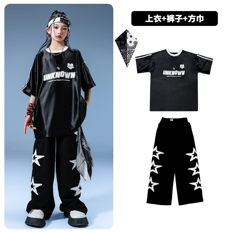 • 세트 [620D 블랙 밝은 가죽 짧은 소매 544D 화이트 스타 블랙 바지] 블랙 스퀘어 스카프 소매