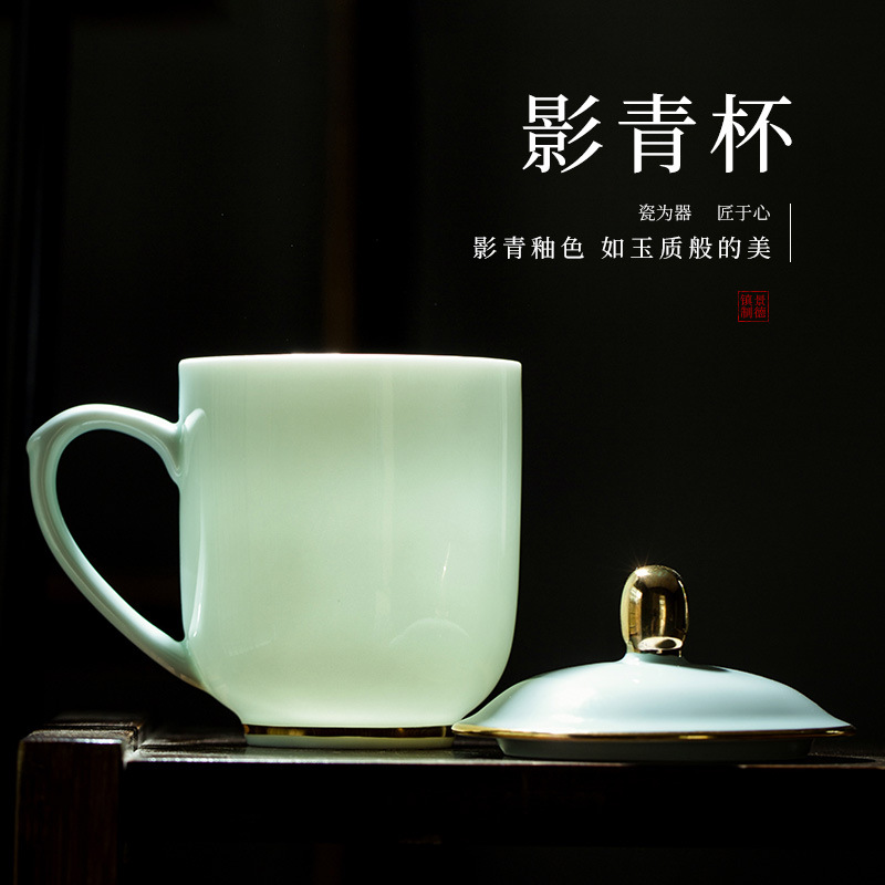 뚜껑이있는 Jingdezhen 세라믹 골드 컵 도자기 그림자 녹색 선물 싱글 컵 오피스 컨퍼런스 컵 홈 티 워터 컵