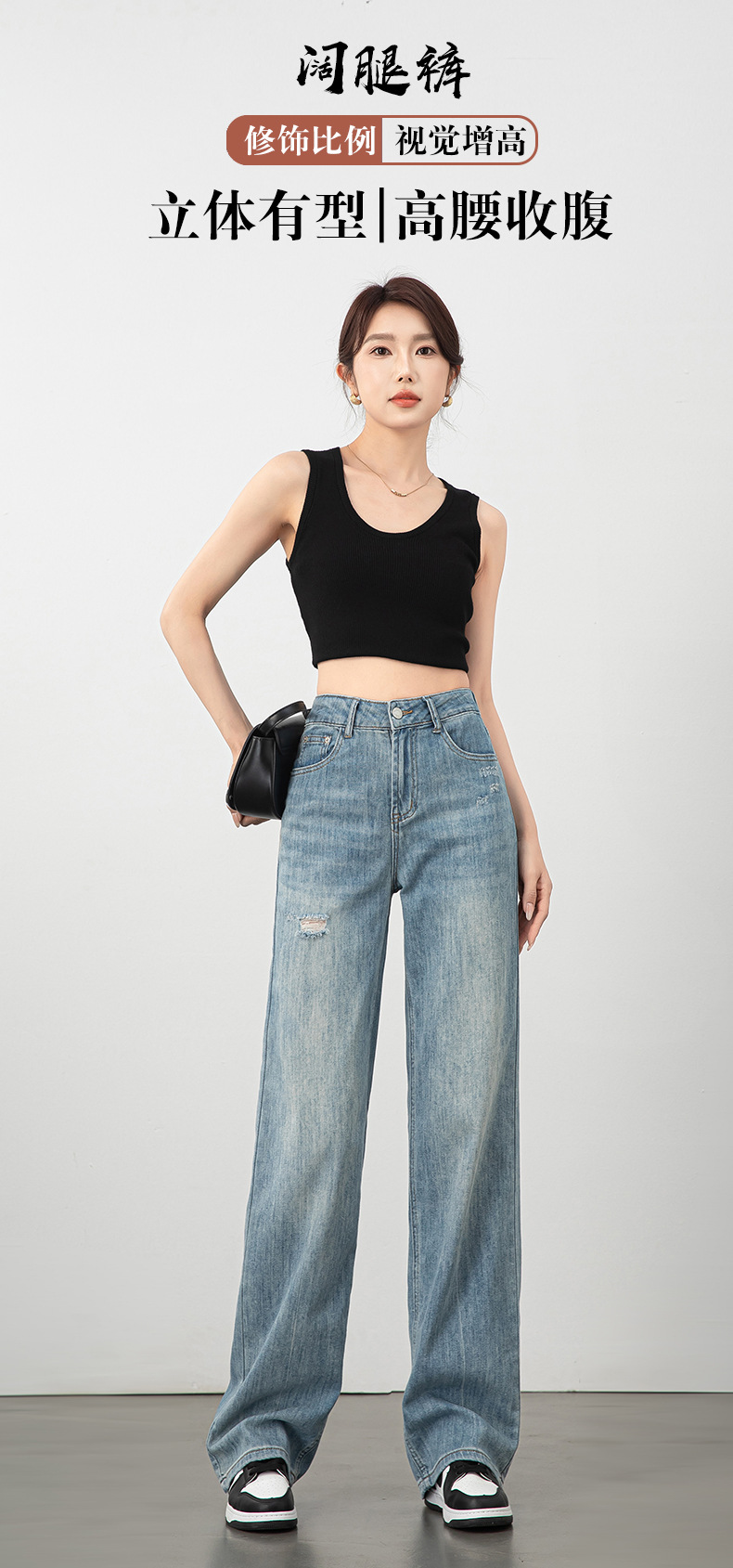클리어런스 상품, 찢어진 하이웨이스트 슬림핏 와이드 팬츠 여성용 2025 가을 루즈핏 슬림 데님 스트레이트 롱 팬츠 8919