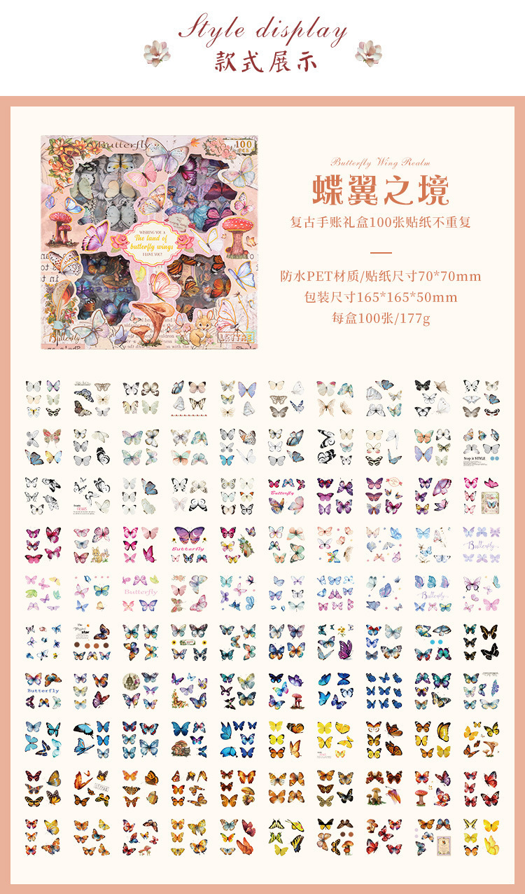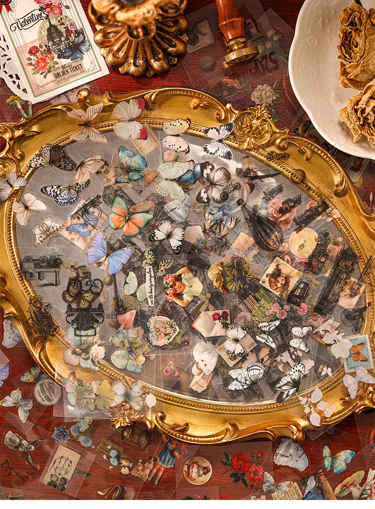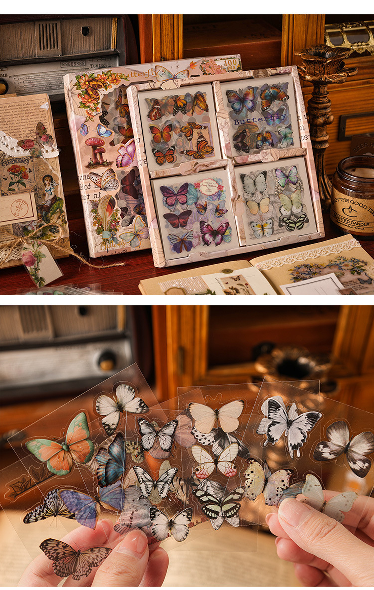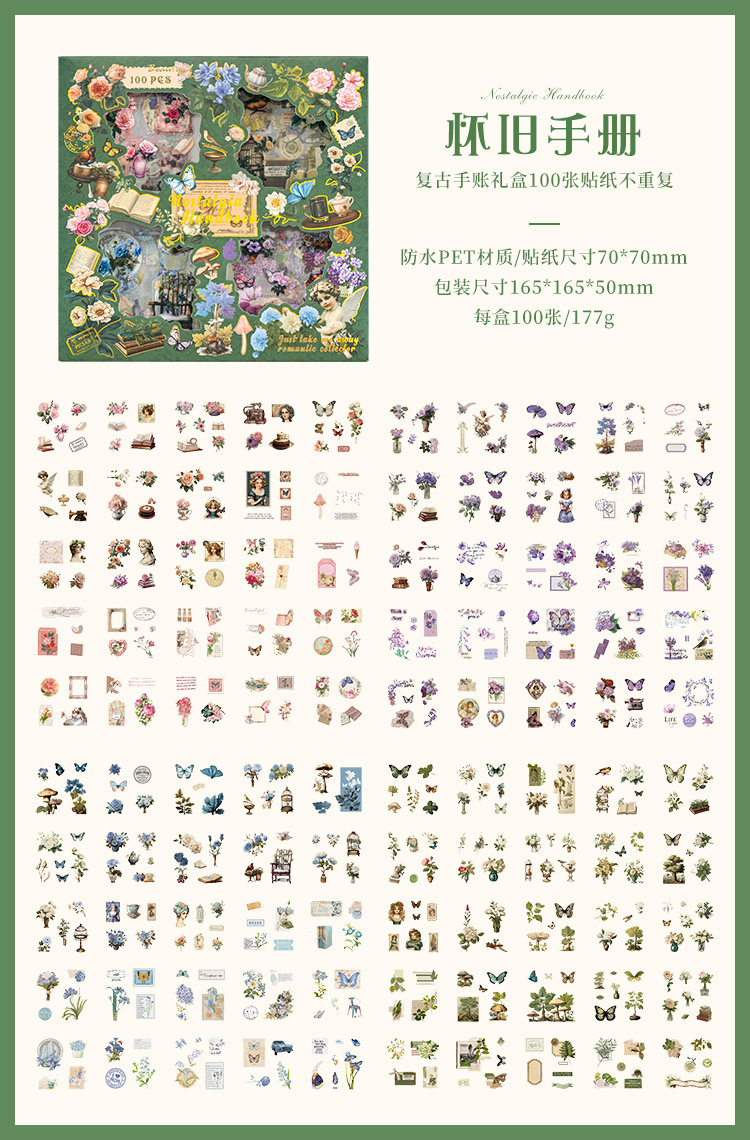 100 박스 빈티지 스티커 유럽과 미국의 캐릭터 스티커 꽃 나비 손 계정 diy 장식 자기 접착 작은 패턴