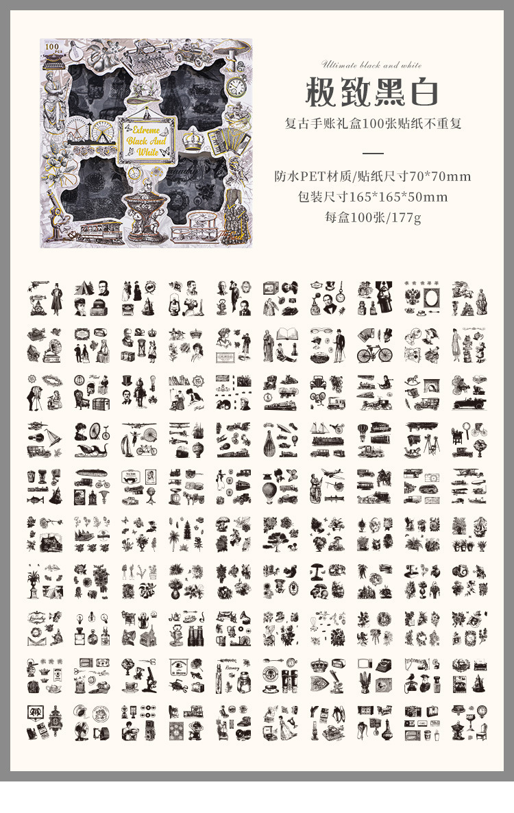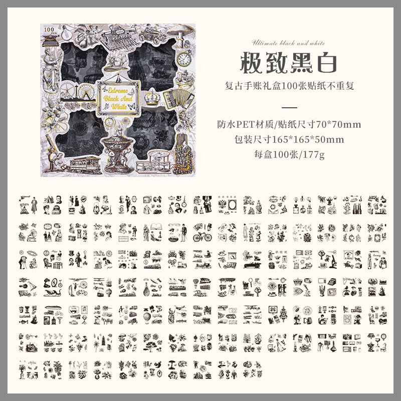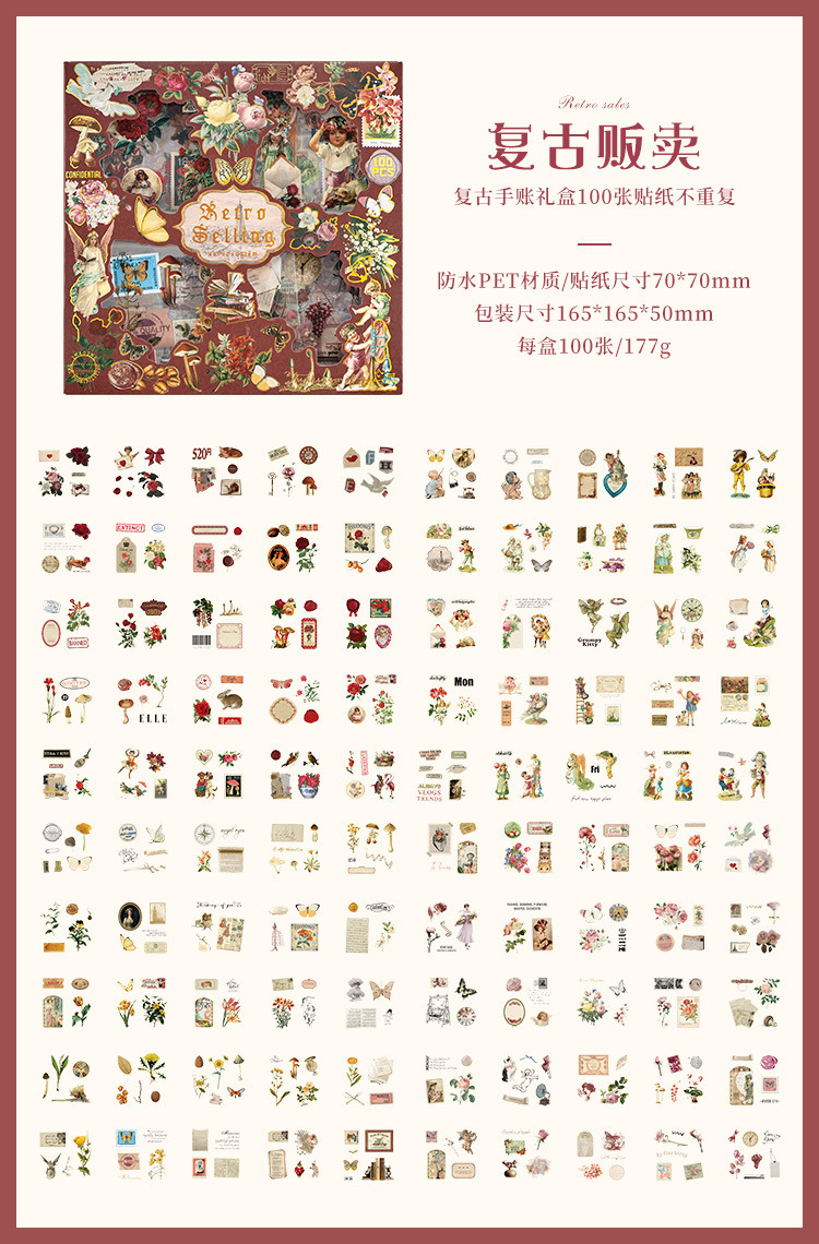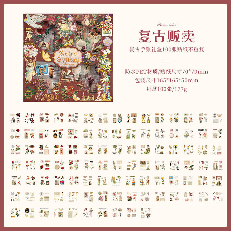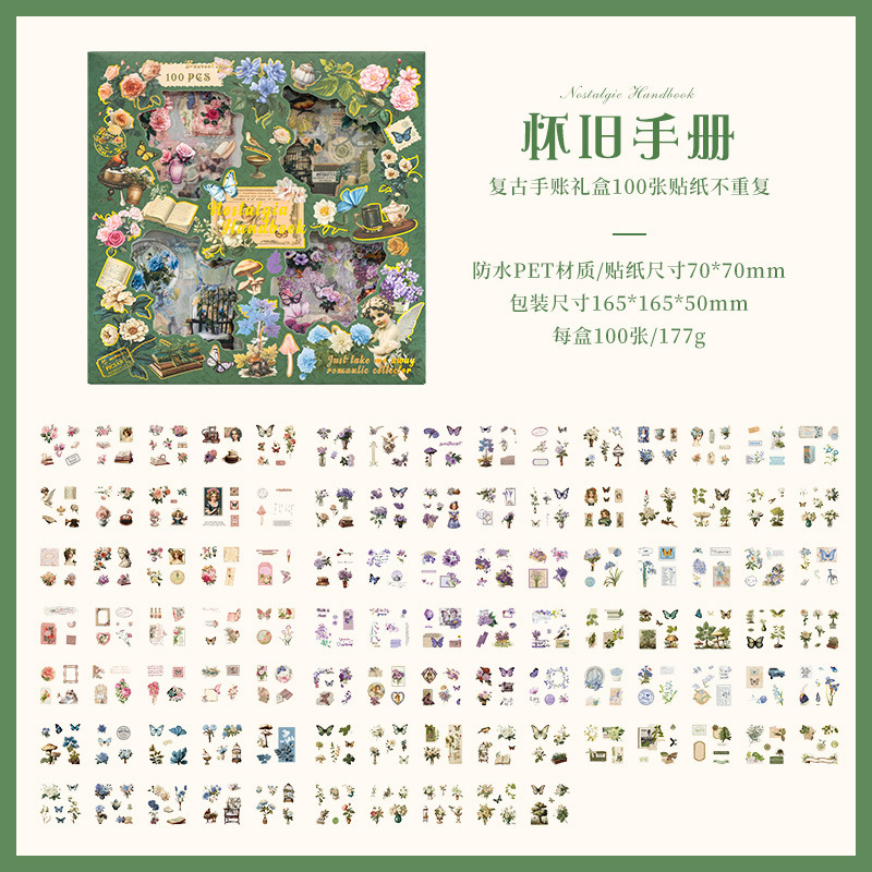100 박스 빈티지 스티커 유럽과 미국의 캐릭터 스티커 꽃 나비 손 계정 diy 장식 자기 접착 작은 패턴스토어 가기