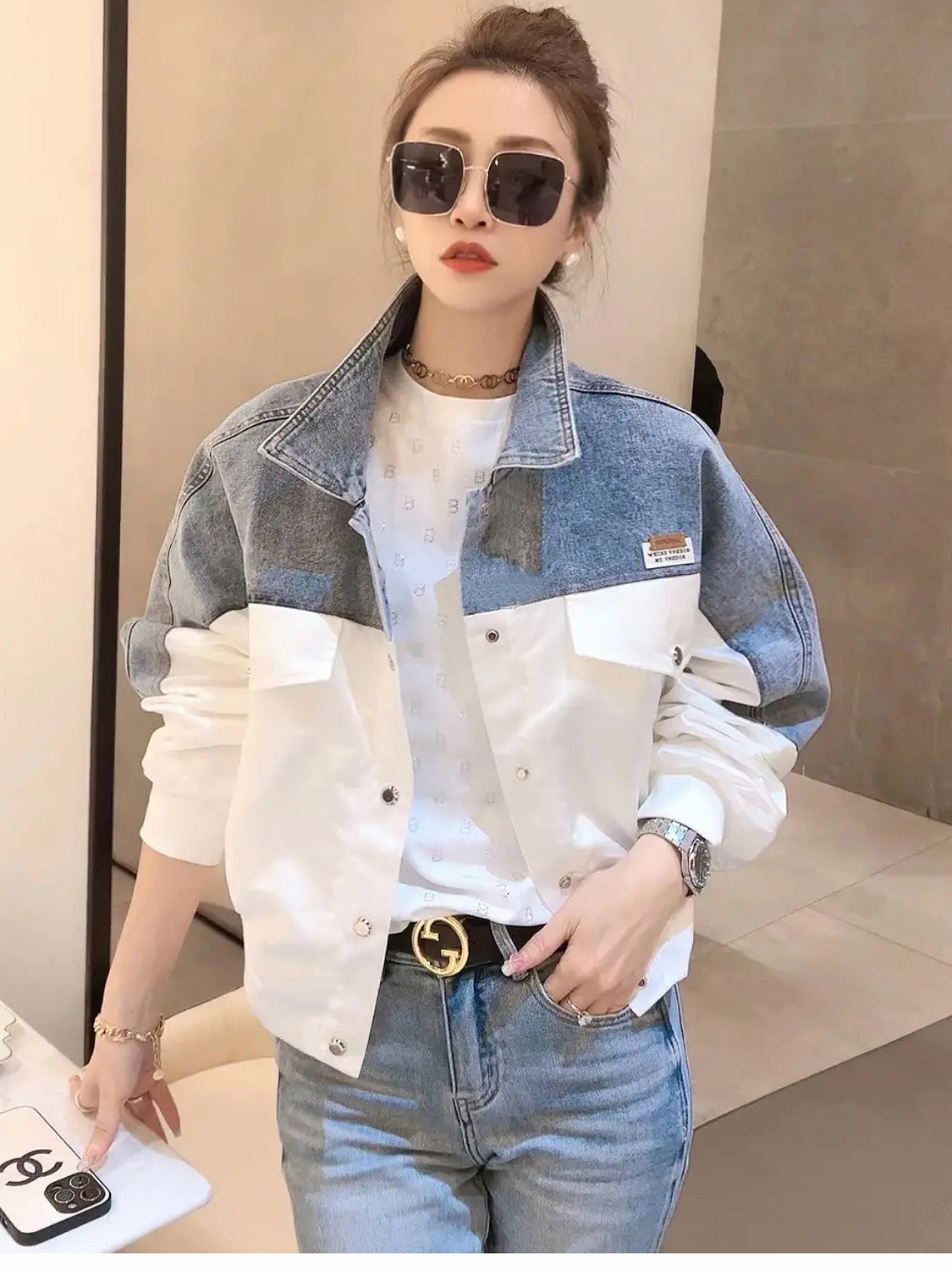 [재고] 데님 코트 여성 2024 년 봄 · 가을 새 바느질 자수 콘트라스트 컬러 데님 의류 여성 자켓 조수