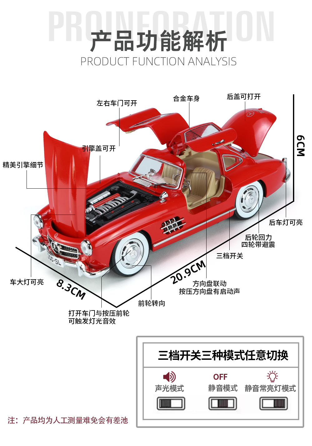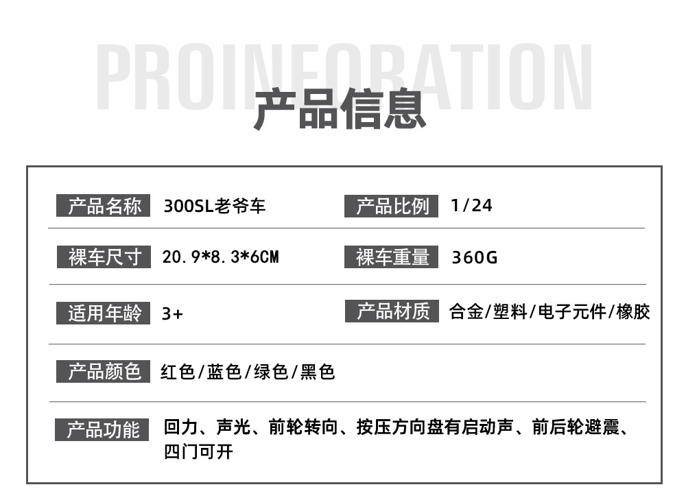 【商品功能】声光、回力、前轮转向,前后轮避震,4门可开,方向盘联动,按压方向盘有启动声