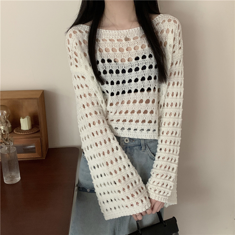 여성 패션 둥근 목 긴 소매 느슨한 니트 풀오버 게으른 스타일 디자인 틈새 빈 메쉬 니트 스웨터