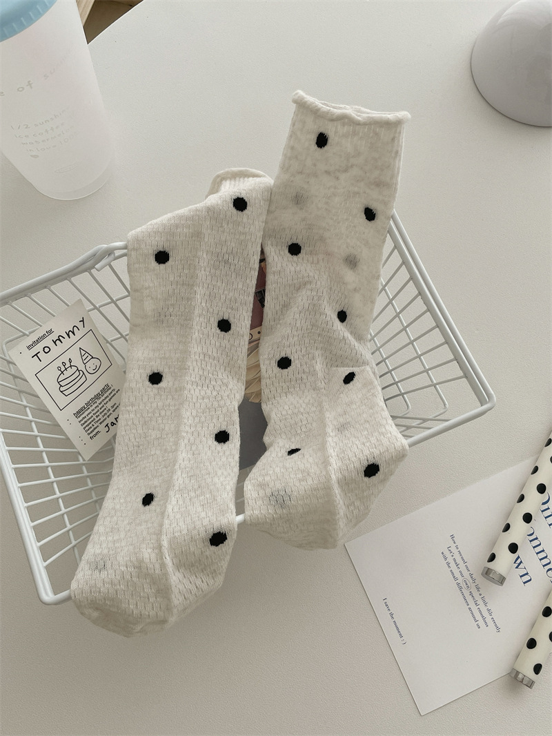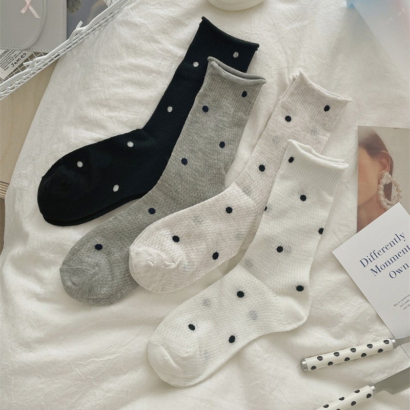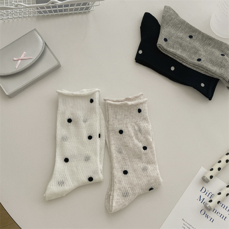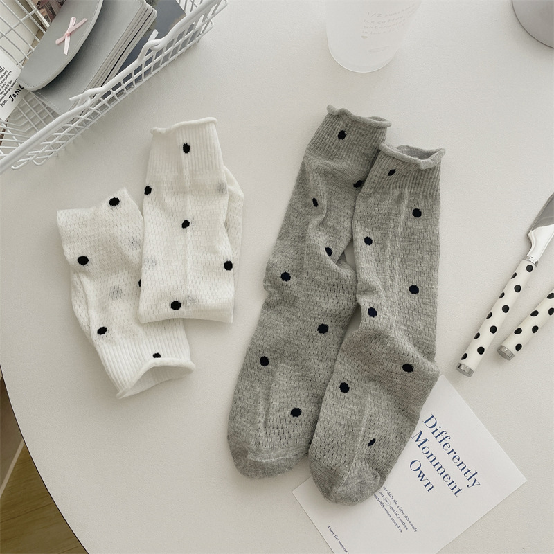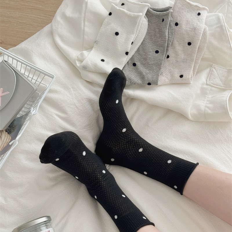 봄과 여름 얇은 웨이브 도트 양말 여성용 중간 길이 양말 Ins 유행 일본식 메쉬 통기성 컬링 퓨어 코튼 더미 스타킹스토어 가기