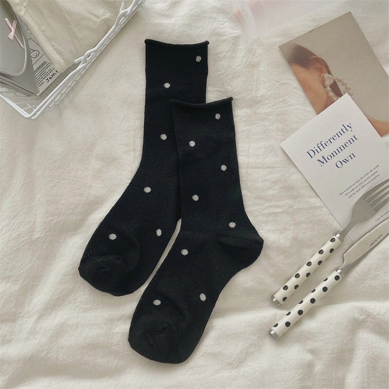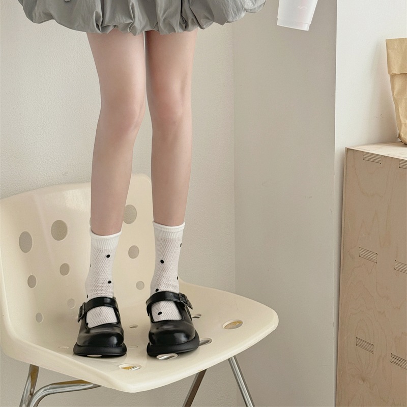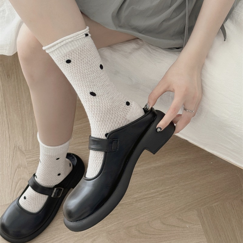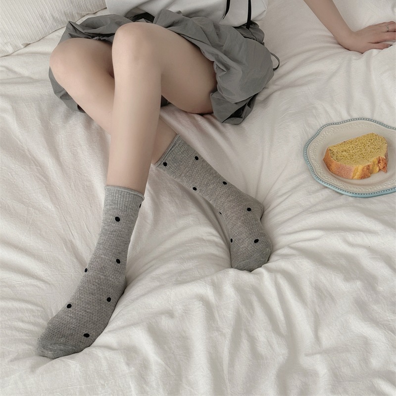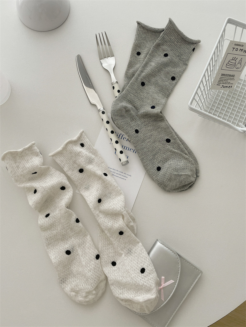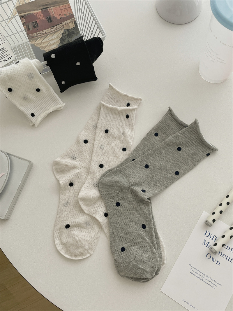 봄과 여름 얇은 웨이브 도트 양말 여성용 중간 길이 양말 Ins 유행 일본식 메쉬 통기성 컬링 퓨어 코튼 더미 스타킹스토어 가기
