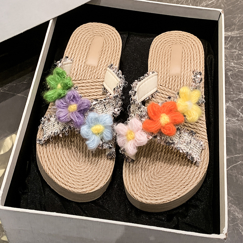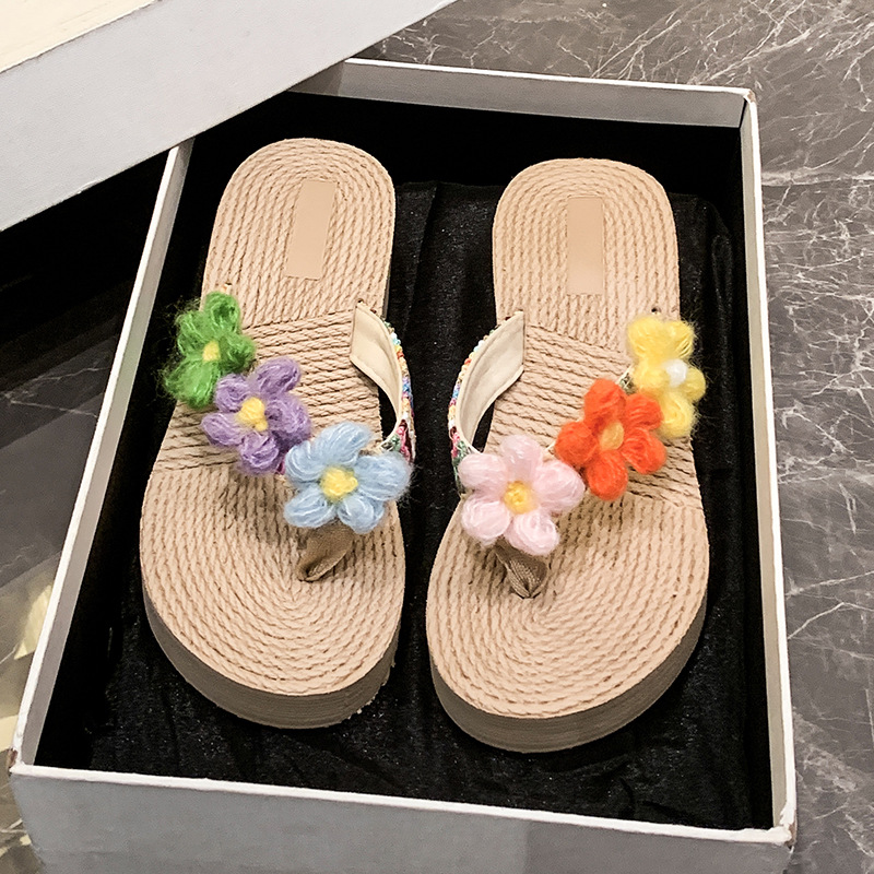 Xiaozhong 새로운 요정 바람 쐐기 플립 플롭 여성 여름 패션 밀짚 꽃 두꺼운 바닥 목회 휴가 비치 신발스토어 가기