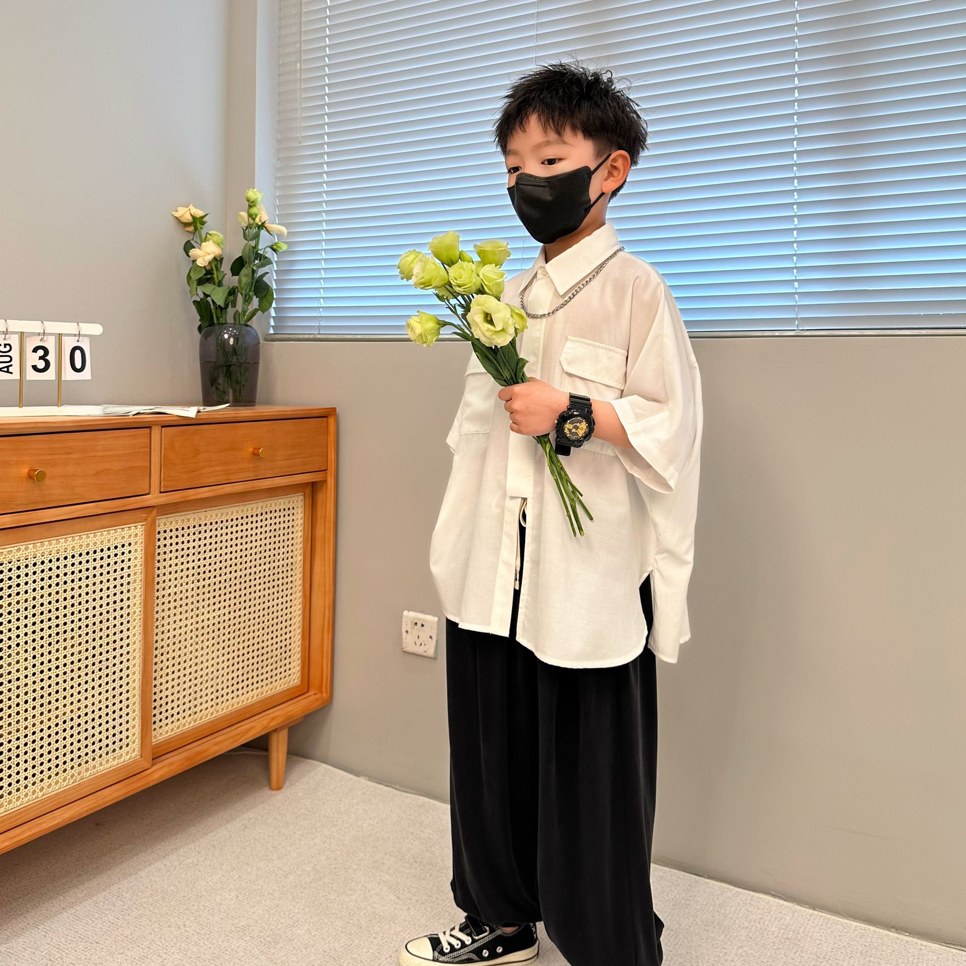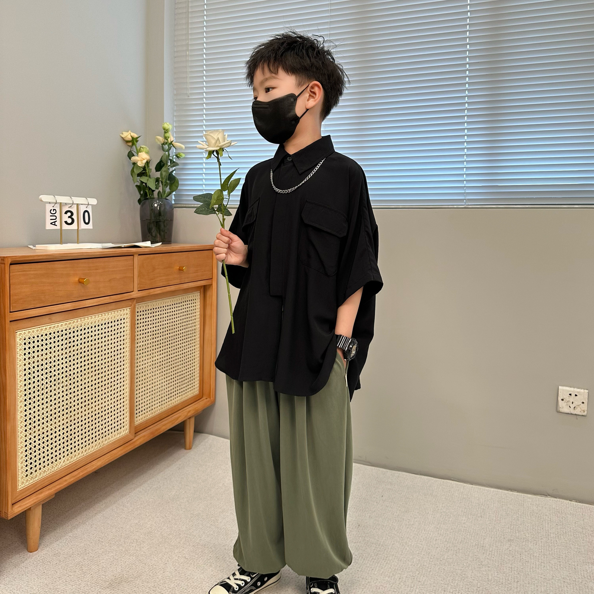 2024 여름 새로운 소년 아이스 실크 2 색 셔츠 대형 어린이 포켓 셔츠 캐주얼 패션 최고 어린이 남성스토어 가기