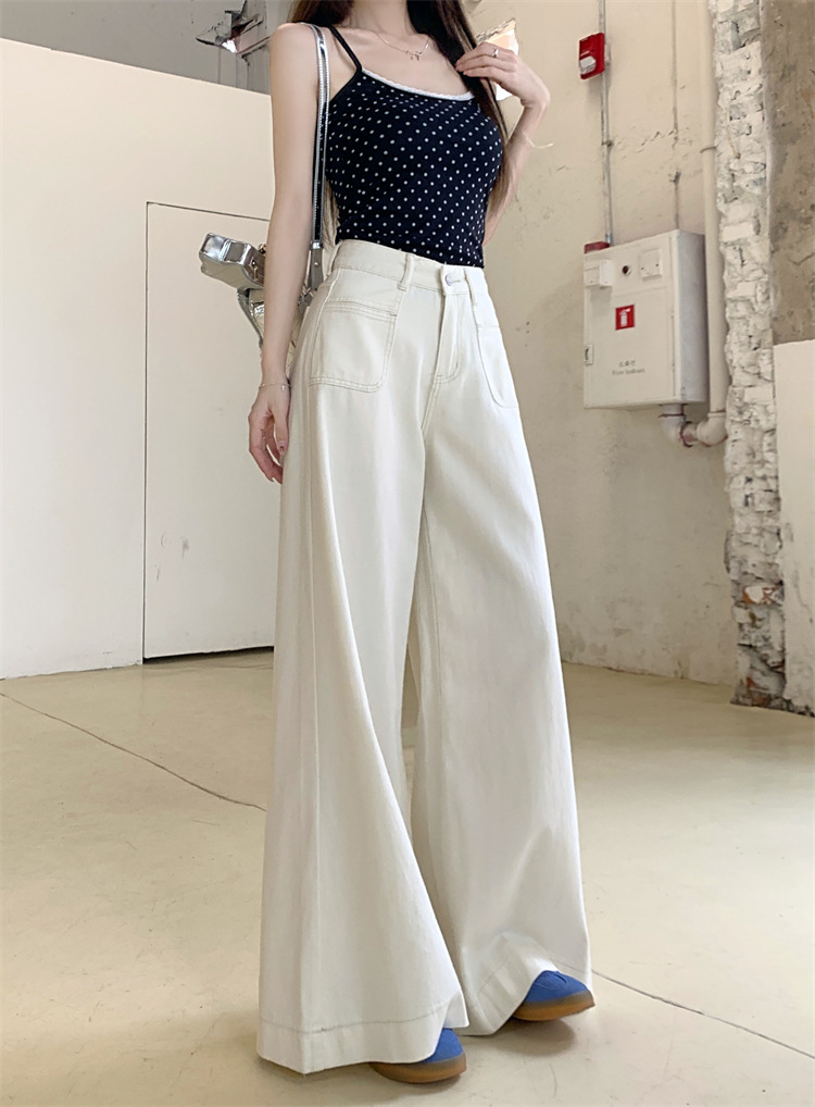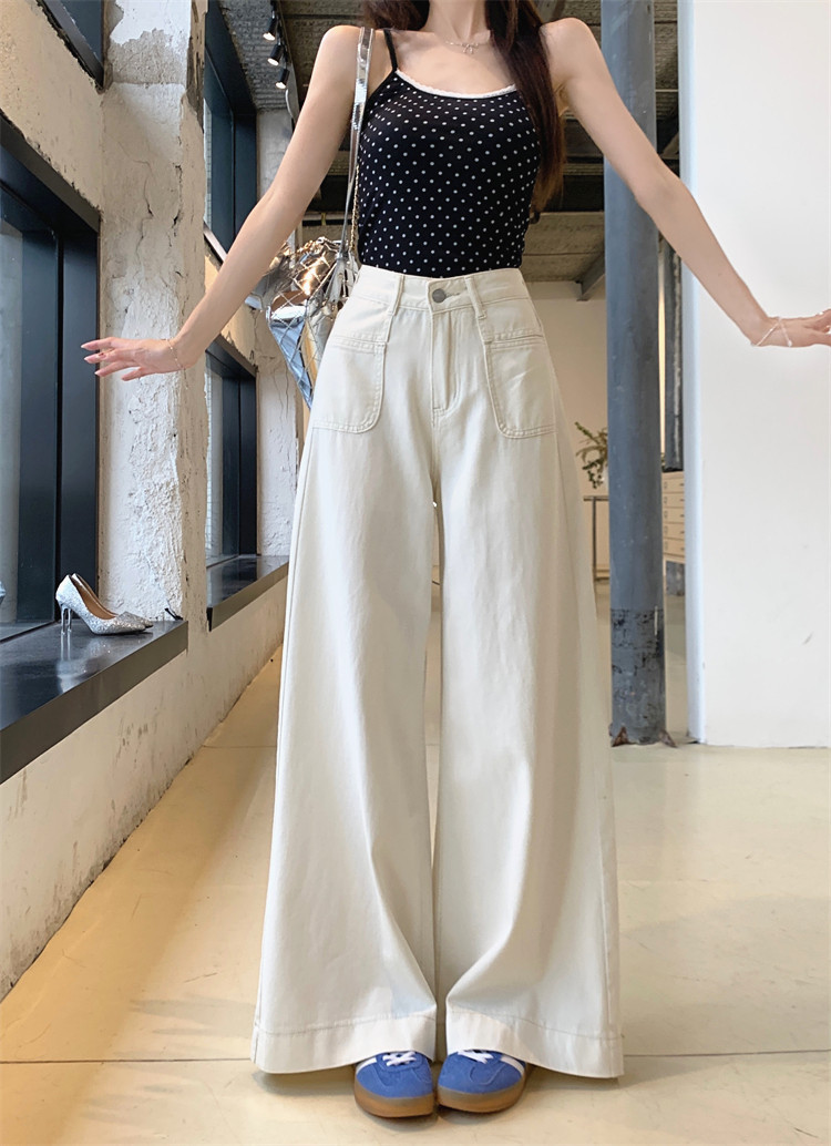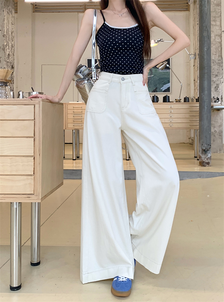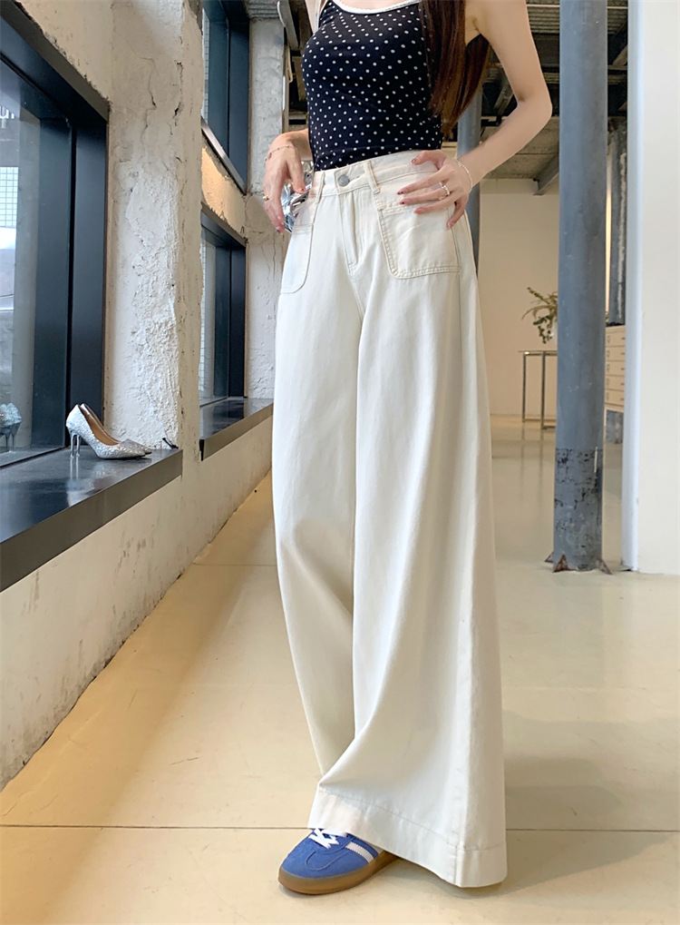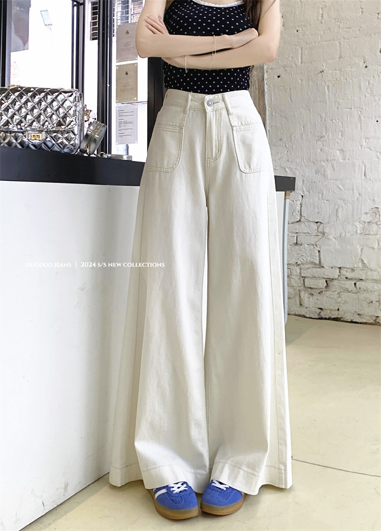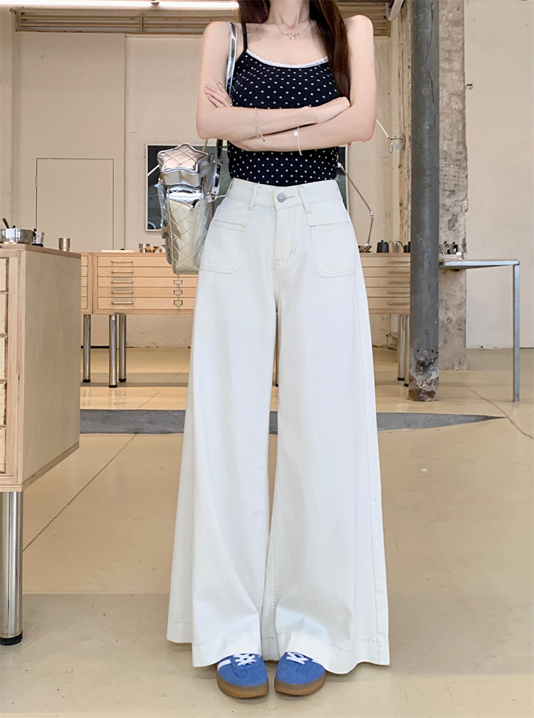 2024 단색 독특한 미국 스타일 화이트 와이드 다리 청바지 여성의 높은 허리 느슨한 슬림 핏 스트레이트 바지스토어 가기