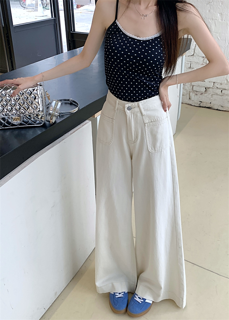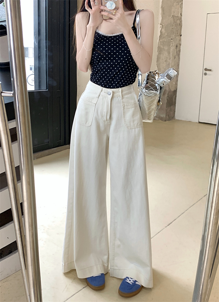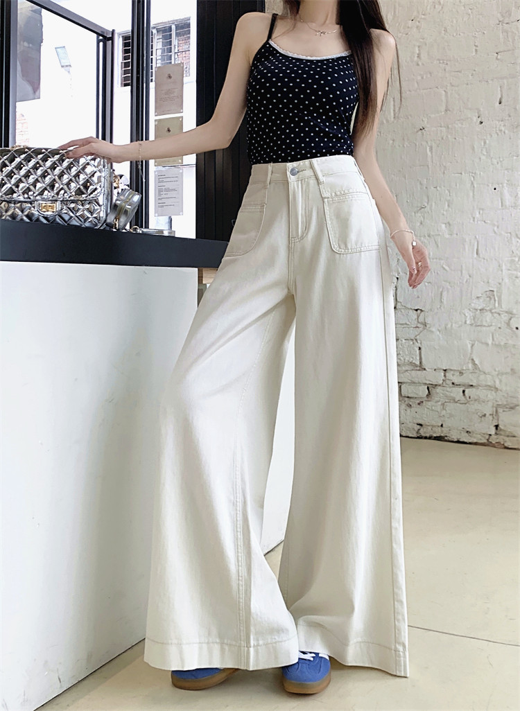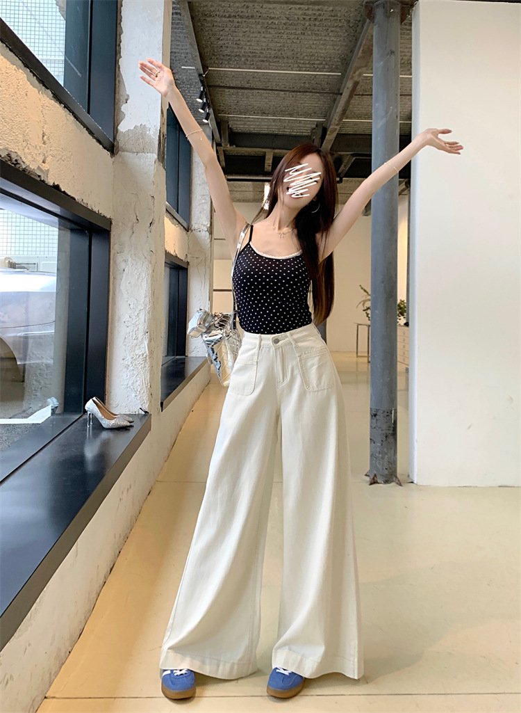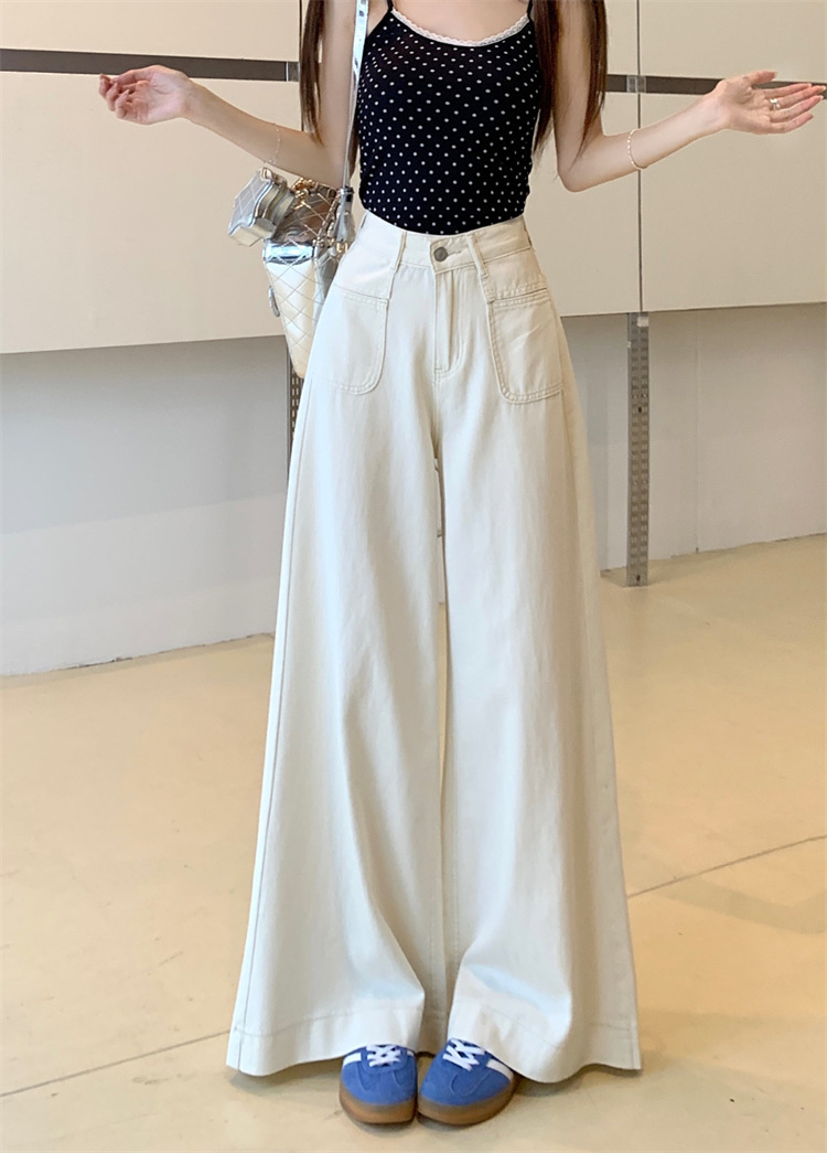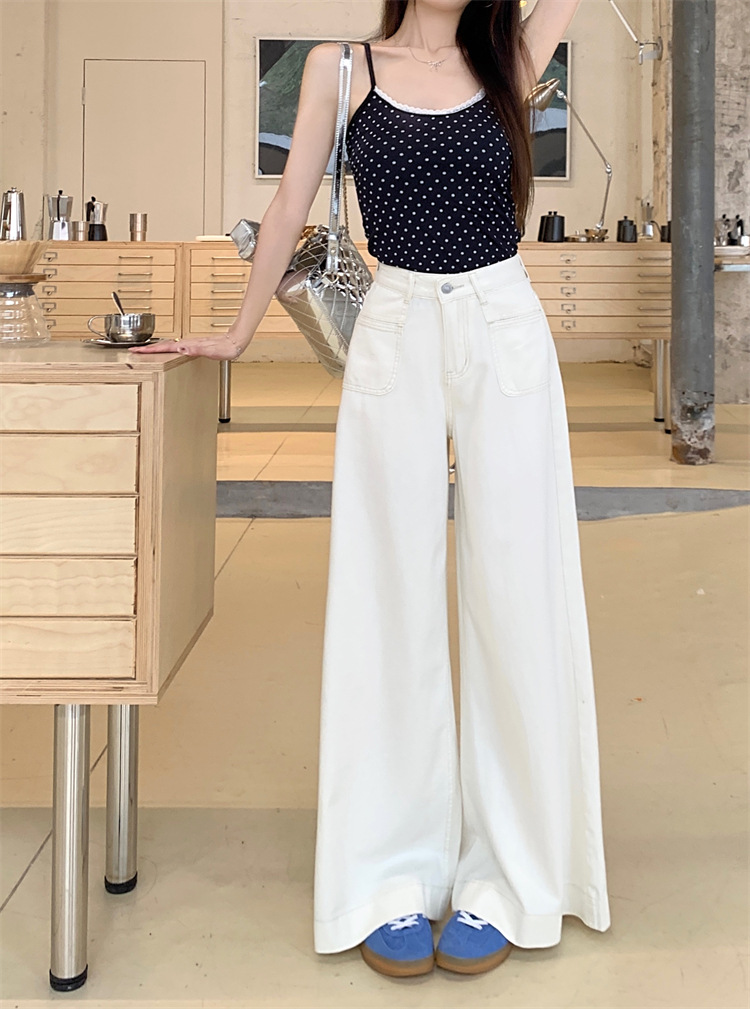 2024 단색 독특한 미국 스타일 화이트 와이드 다리 청바지 여성의 높은 허리 느슨한 슬림 핏 스트레이트 바지스토어 가기