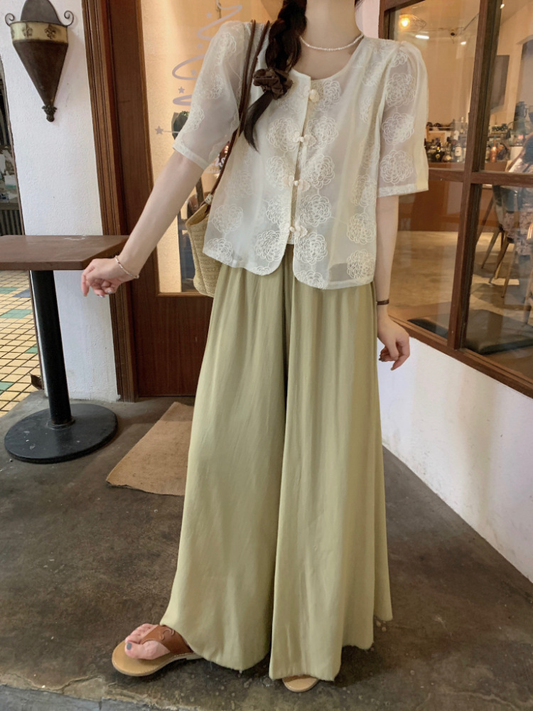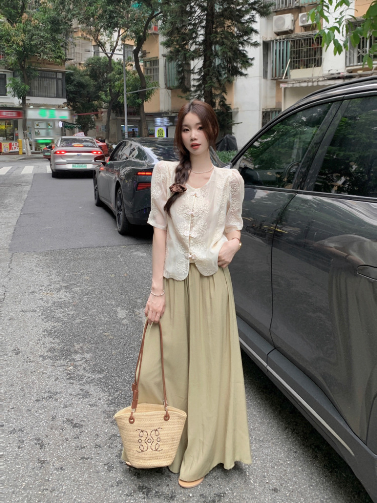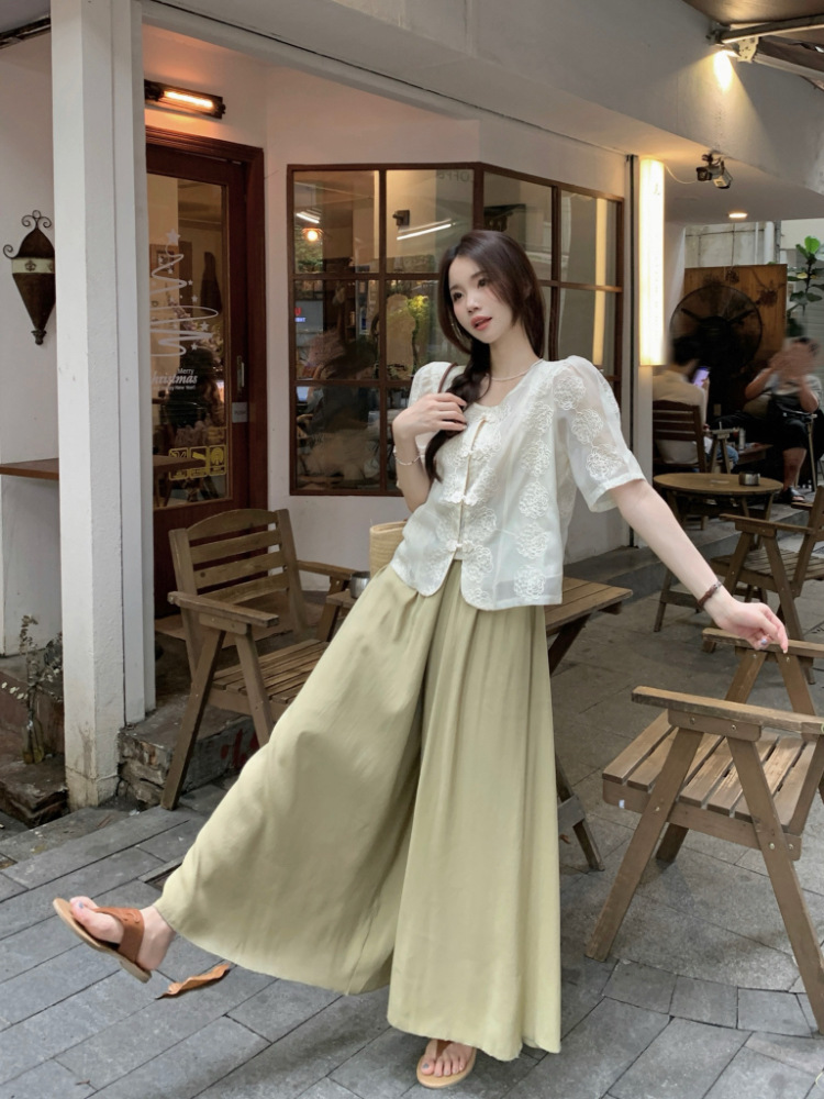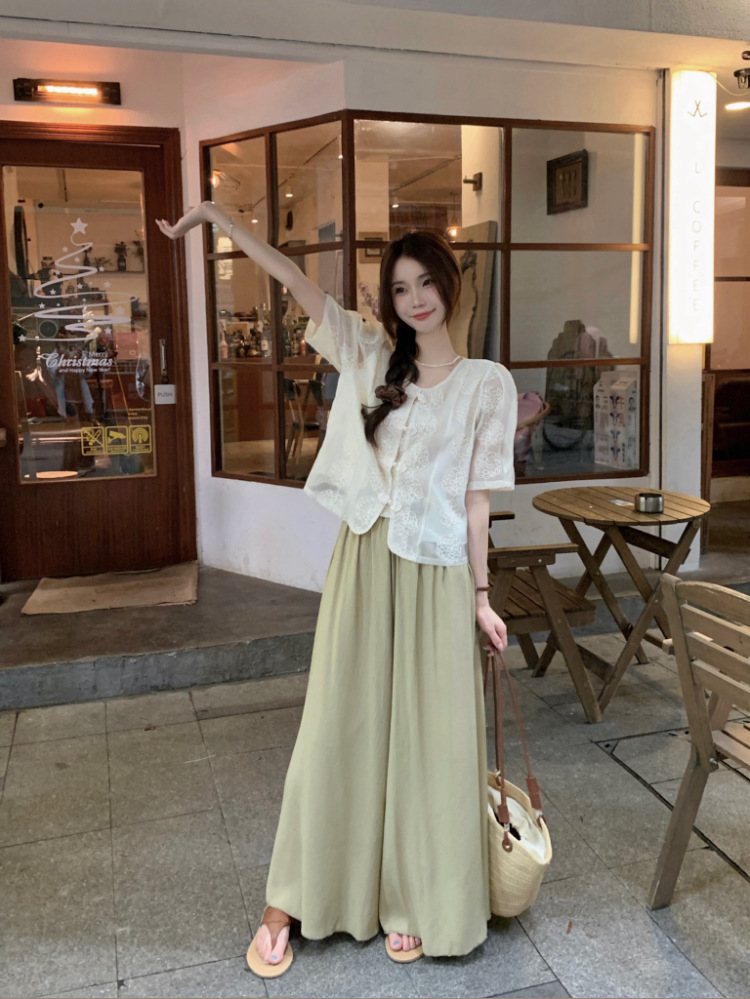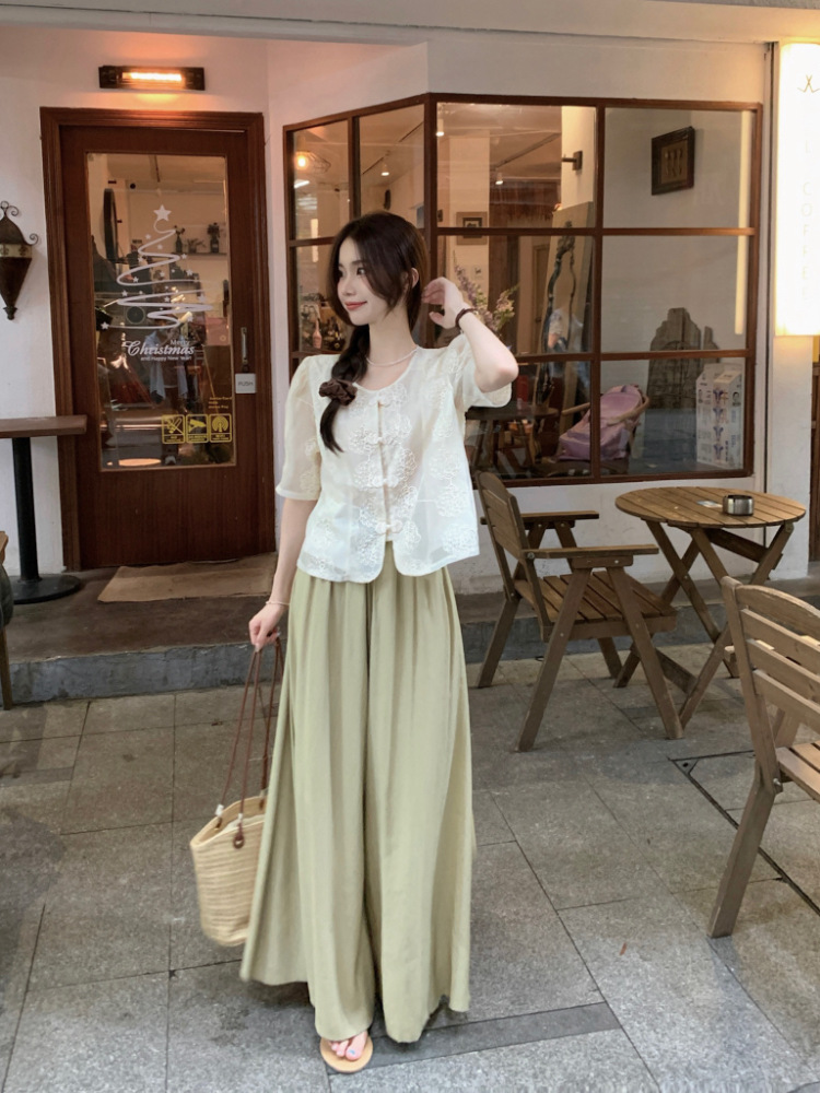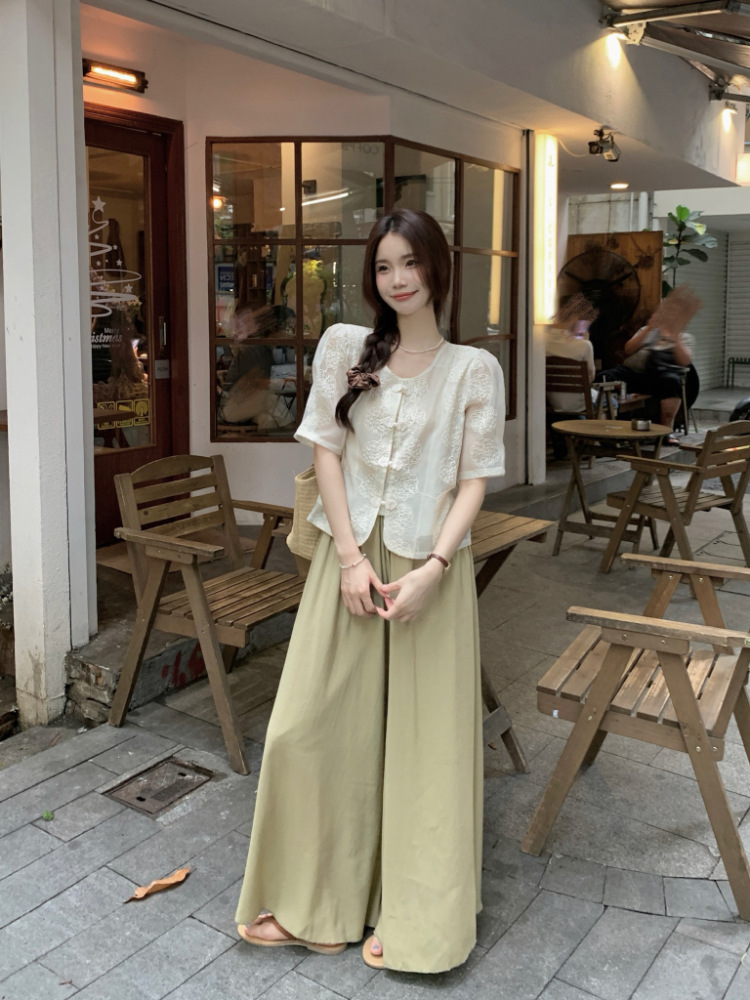 리얼 샷 프랑스 세트 여성용 복고풍 버클 기질 짧은 소매 셔츠 하이 허리 느슨한 캐주얼 바지 투피스 64405