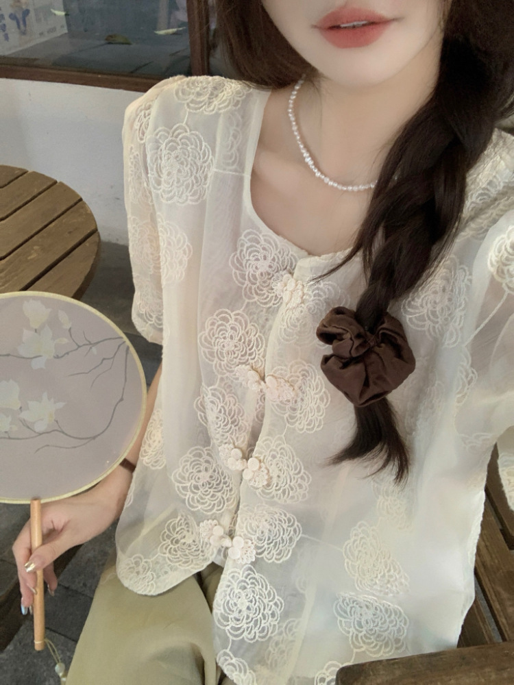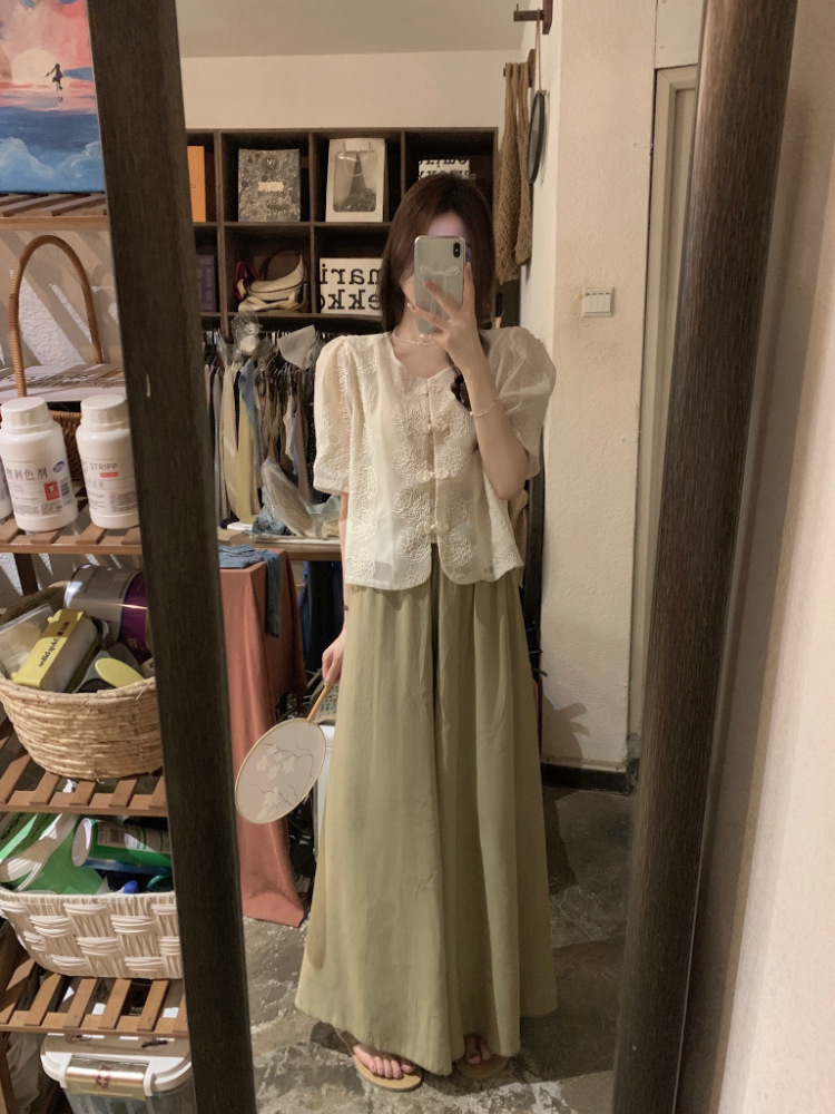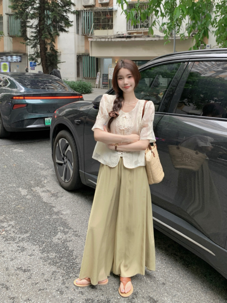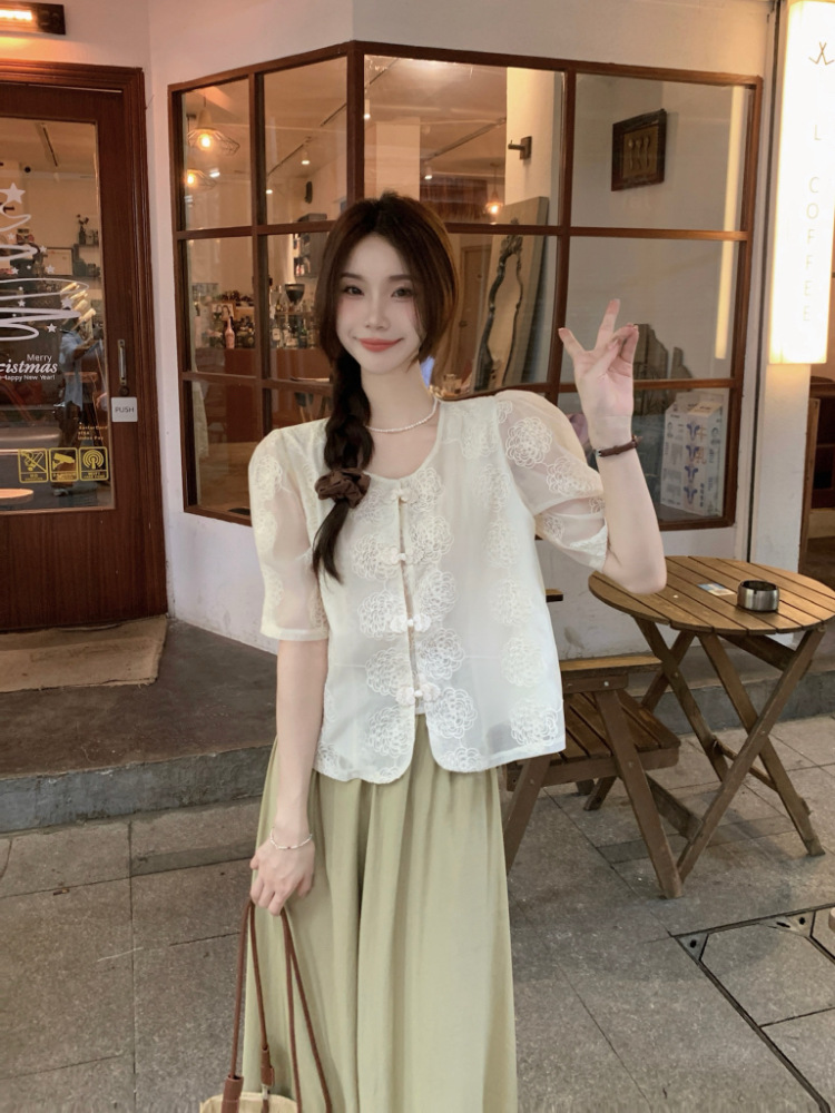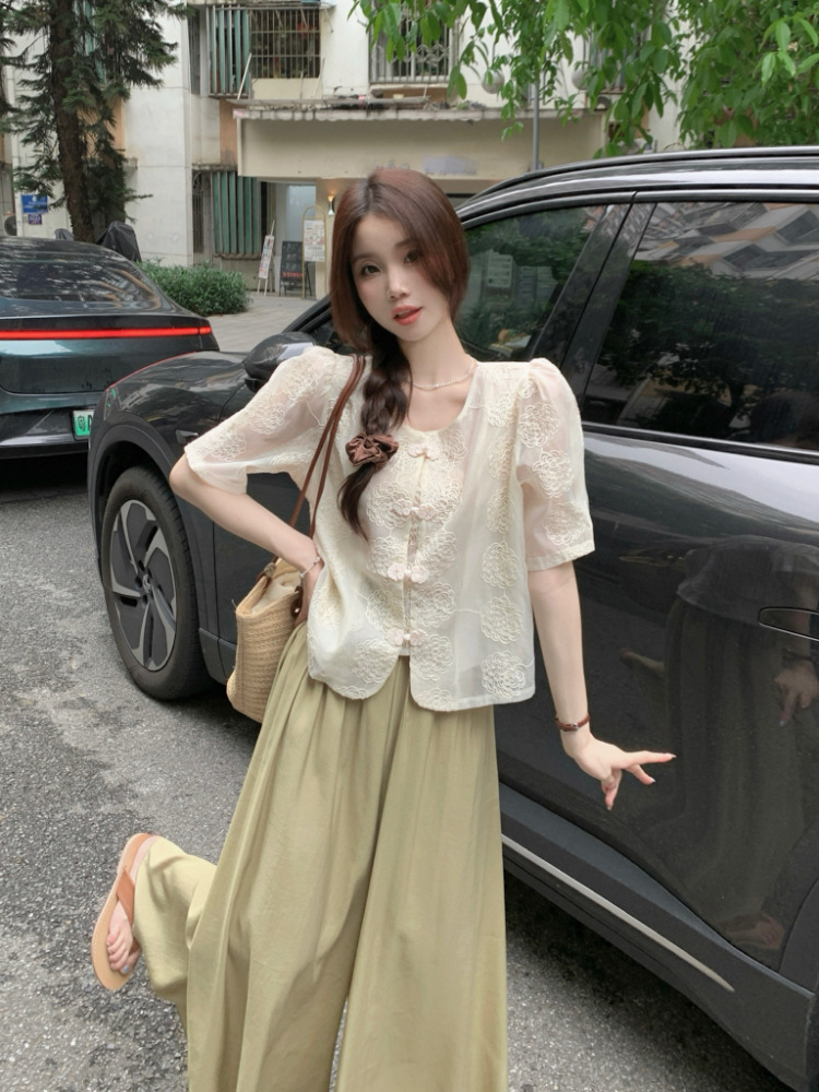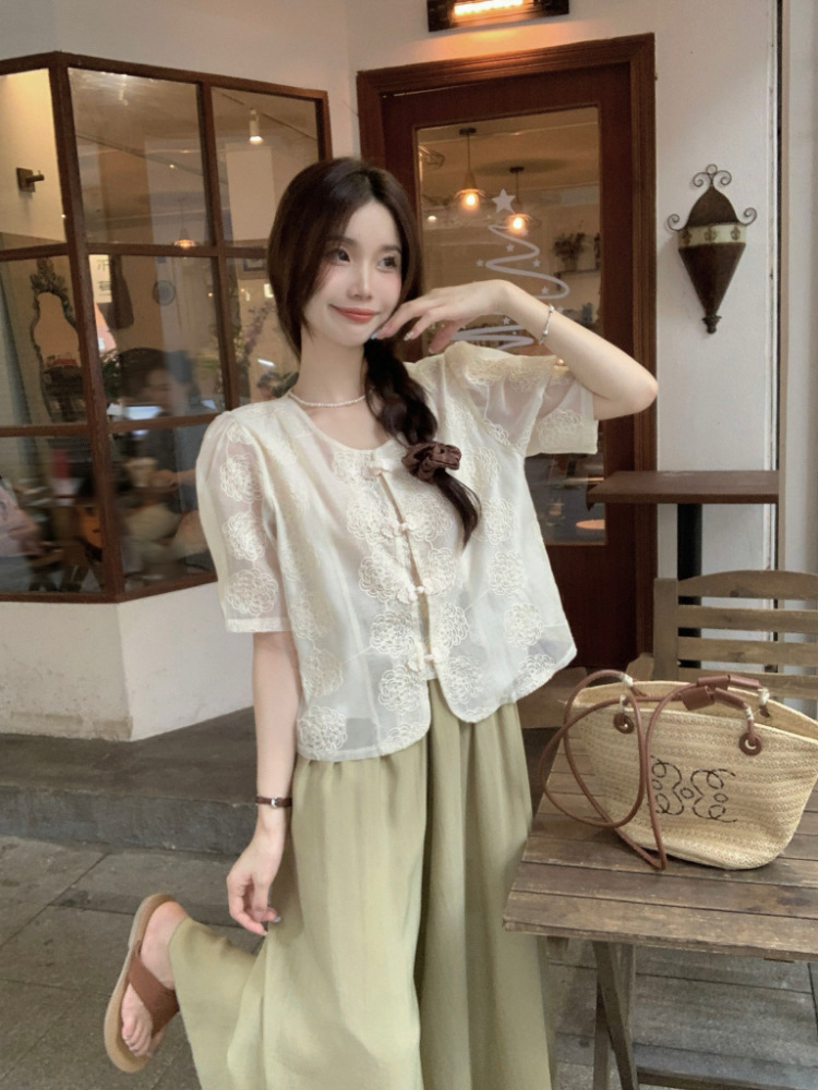리얼 샷 프랑스 세트 여성용 복고풍 버클 기질 짧은 소매 셔츠 하이 허리 느슨한 캐주얼 바지 투피스 64405