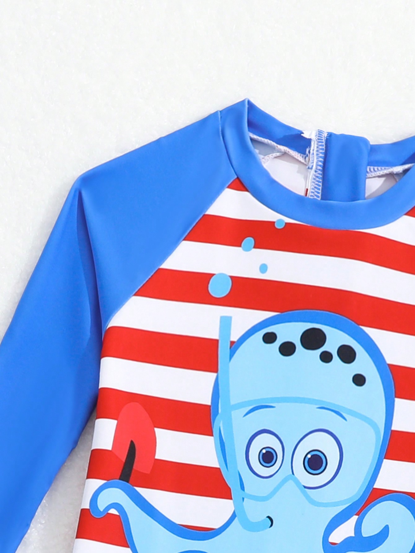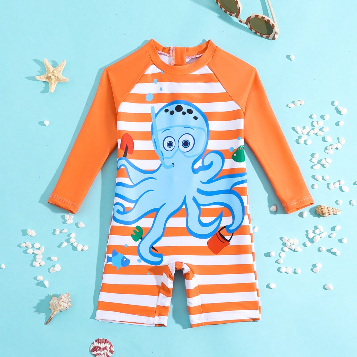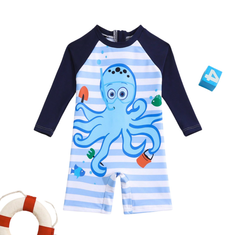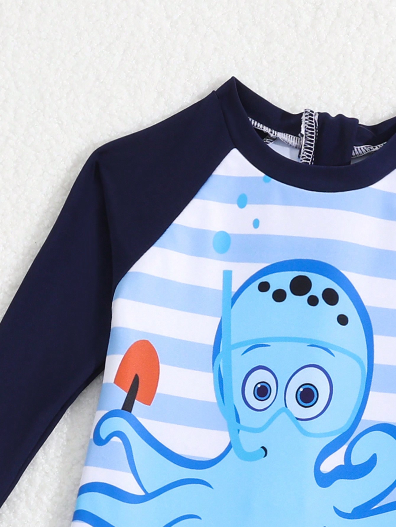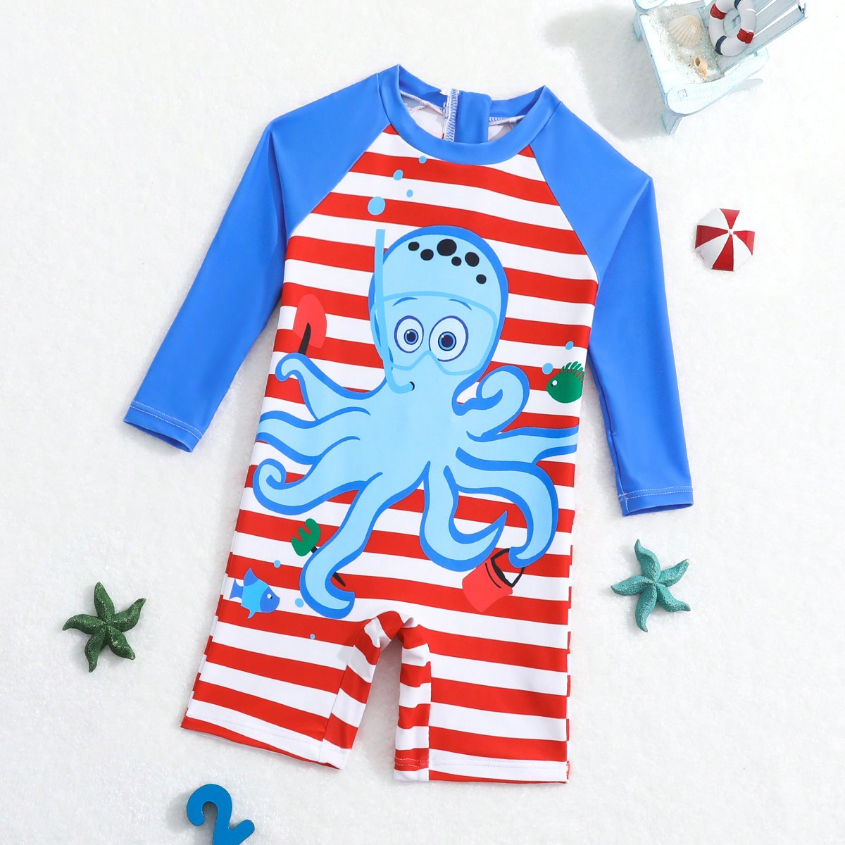 2024 새로운 대외 무역 큰 아이들을위한 어린이 원피스 수영복 귀여운 문어 소년 원피스 수영복 유럽과 미국 국경