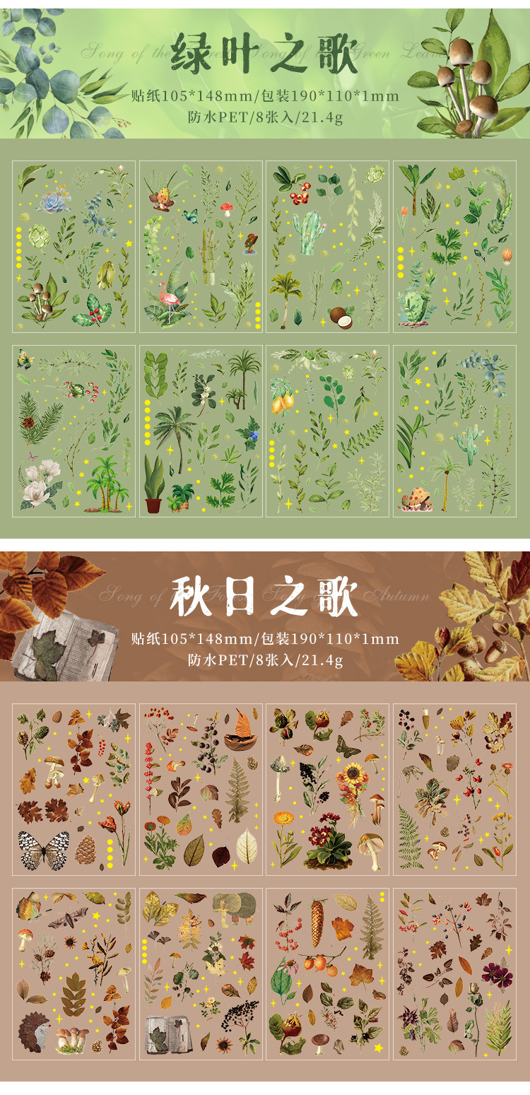 숲 노래 애완 동물 방수 종이 가방 복고풍 식물 가을 잎 단풍 잎 손 계정 DIY 콜라주 장식 재료 스티커