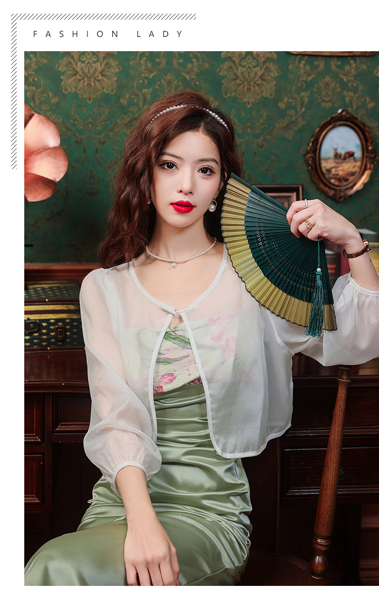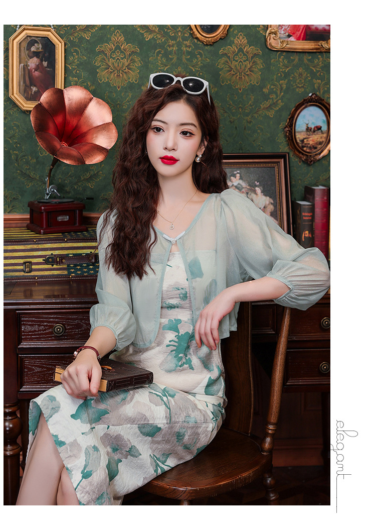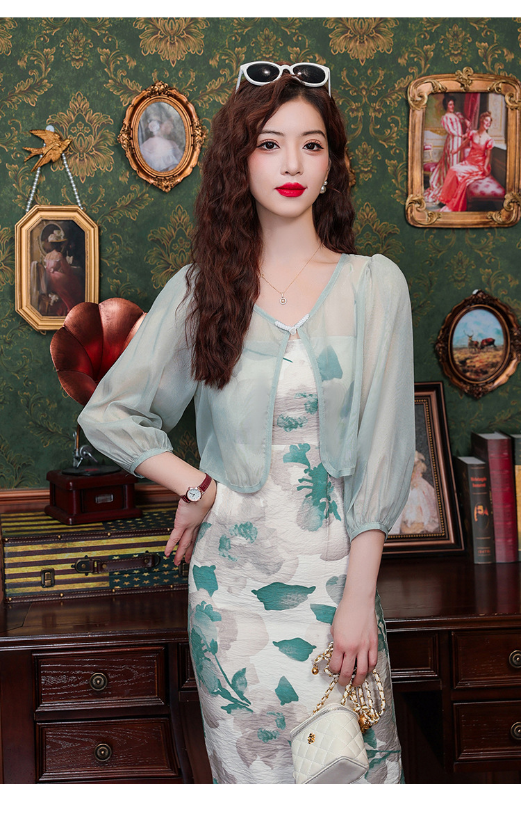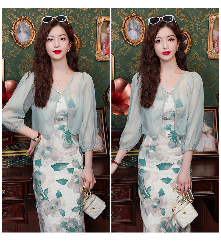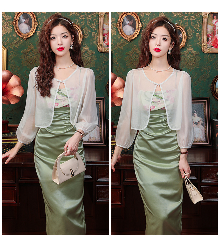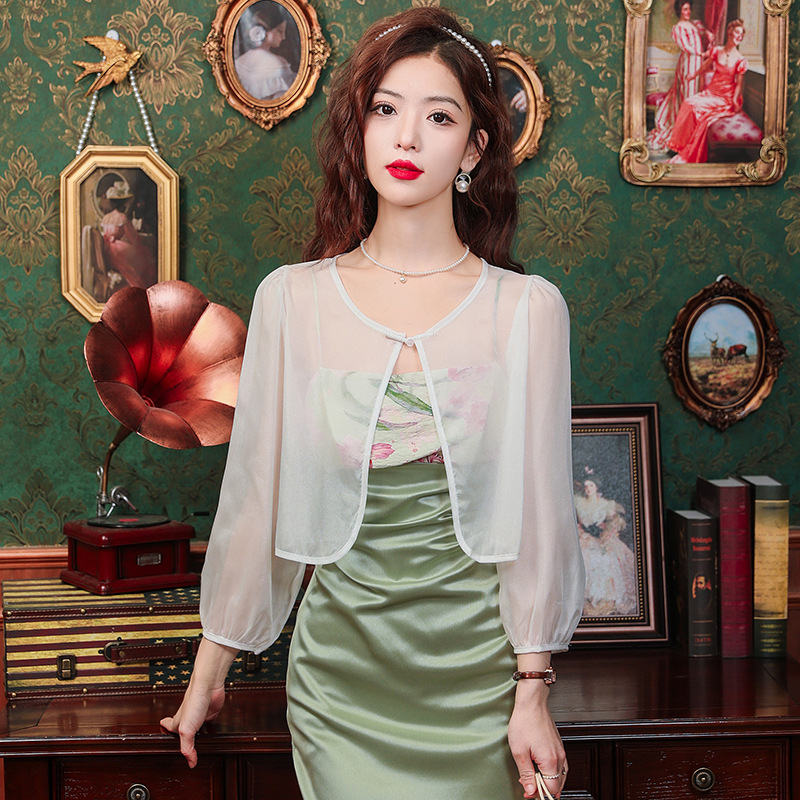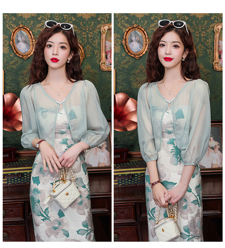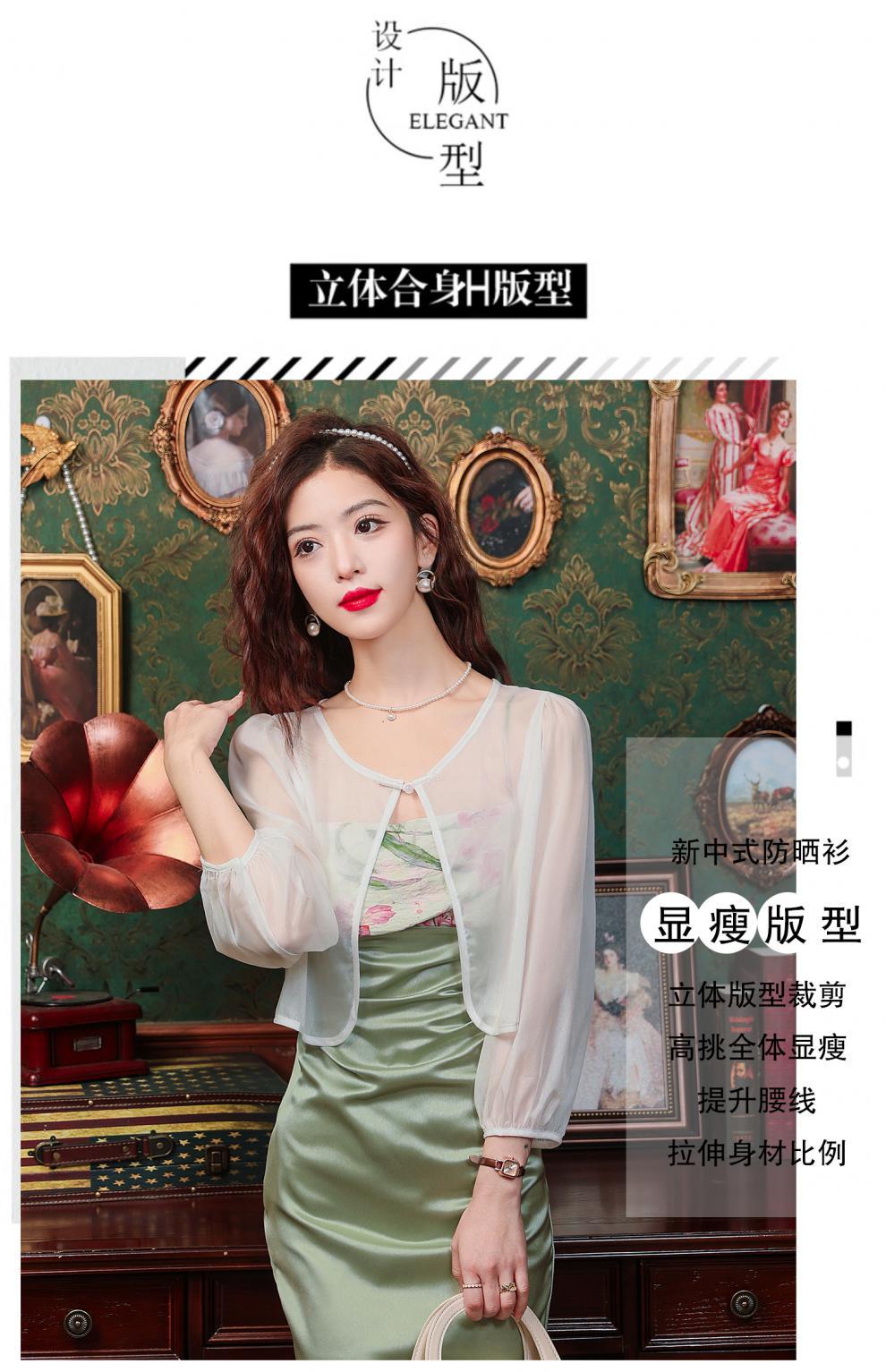 여성을 위한 새로운 중국 스타일 여름 얇은 거즈 서스펜더 롱 스커트와 작은 숄 재킷 쉬폰 가디건 자외선 차단 조끼