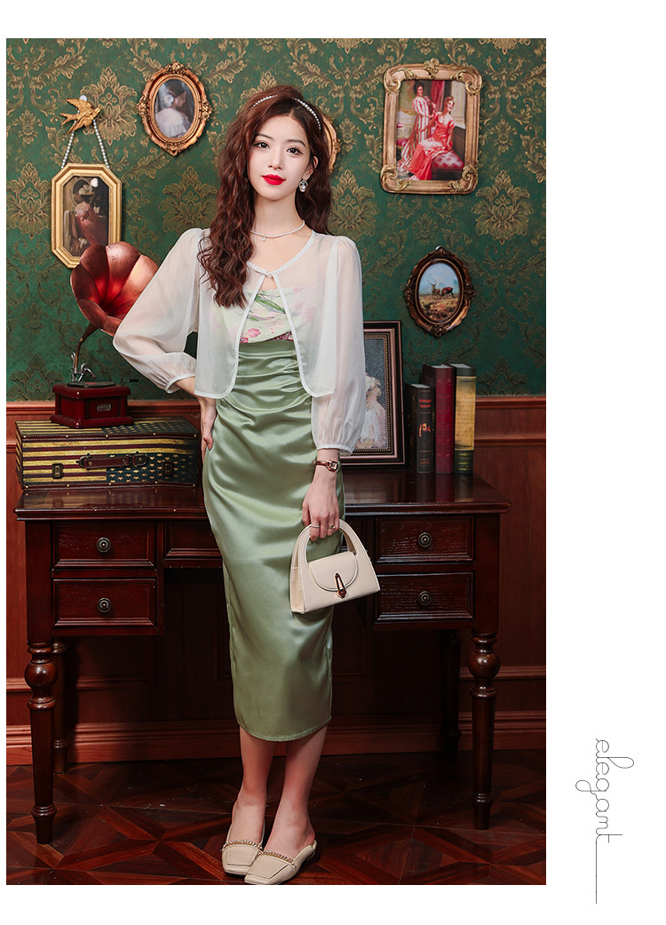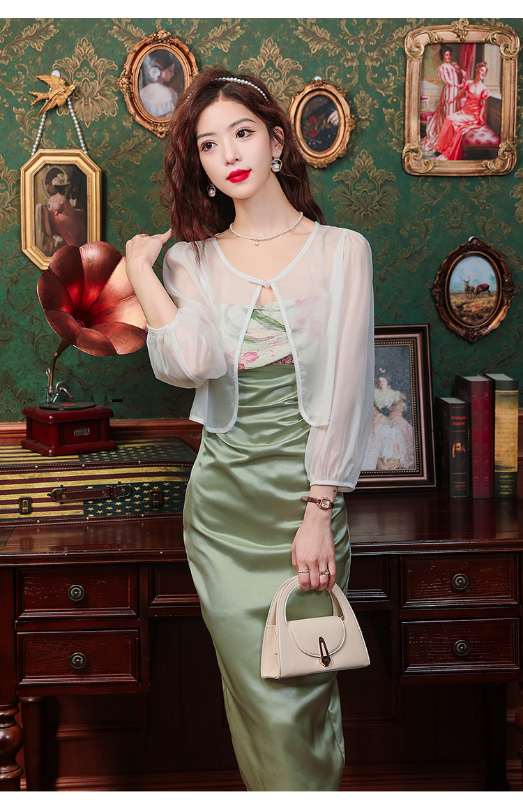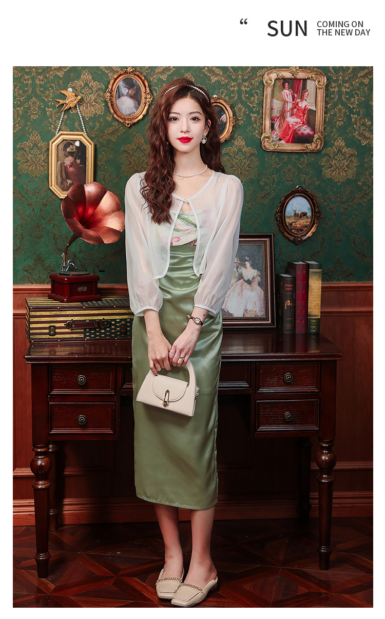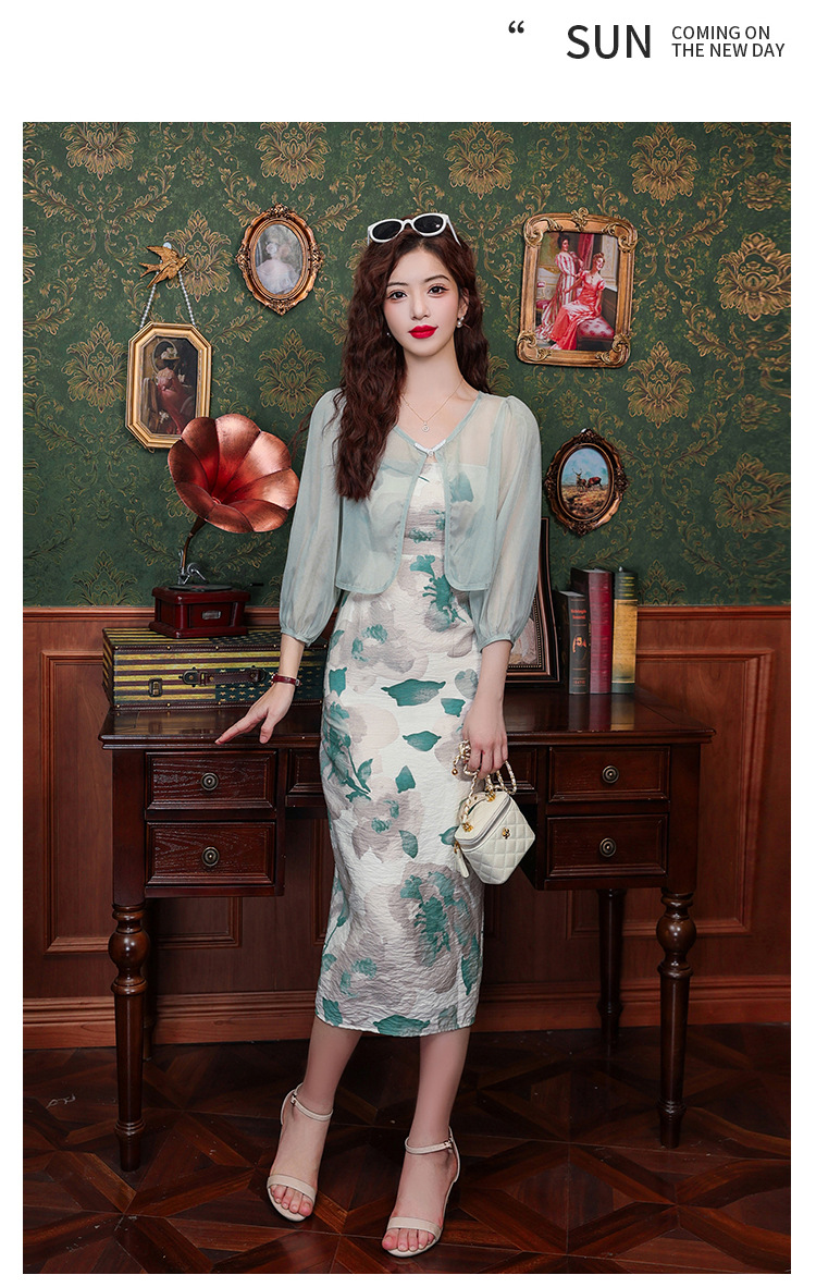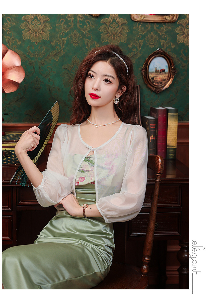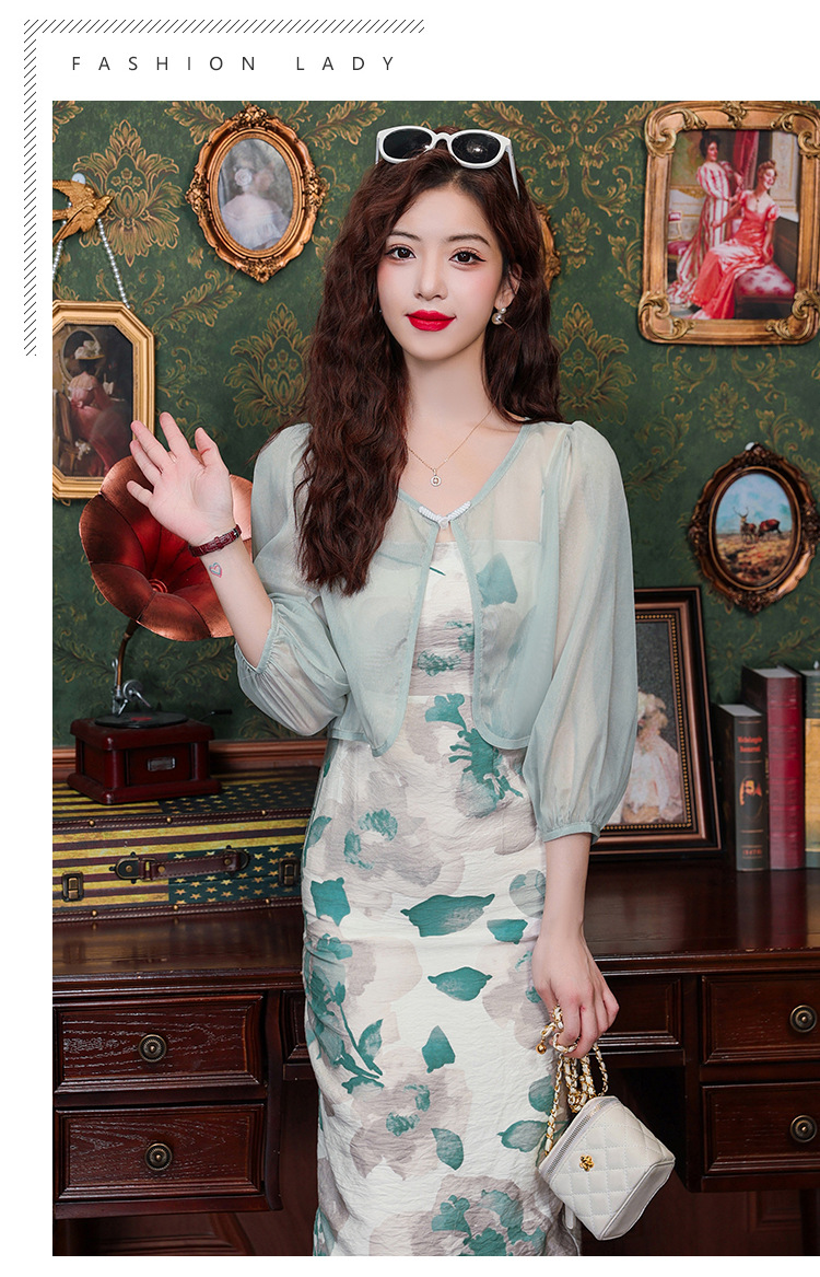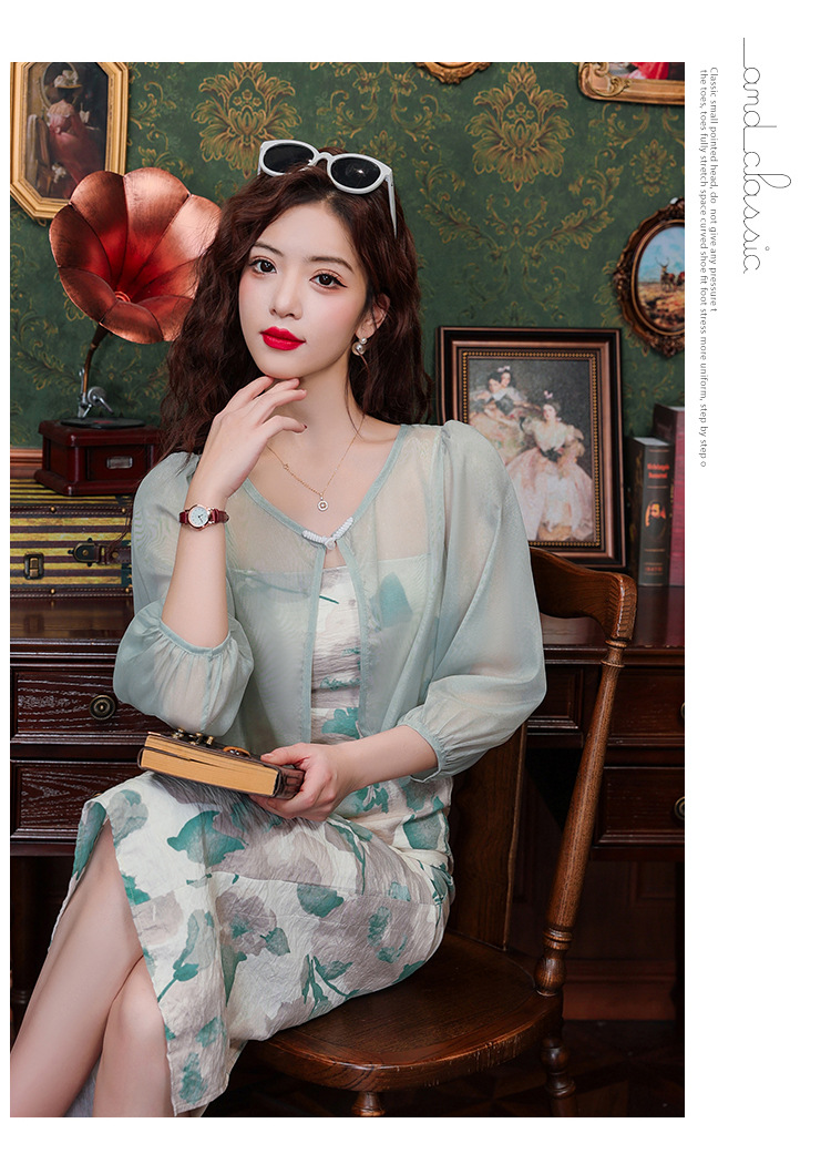여성을 위한 새로운 중국 스타일 여름 얇은 거즈 서스펜더 롱 스커트와 작은 숄 재킷 쉬폰 가디건 자외선 차단 조끼