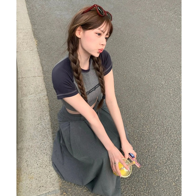 크로스-국경 2024 여름 새로운 컬러 삽입 라운드 넥 짧은 소매 우아한 슬림 티셔츠 여성용스토어 가기