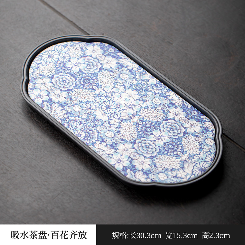 • 파란색과 흰색 도자기 타원형 흡수성 차 트레이