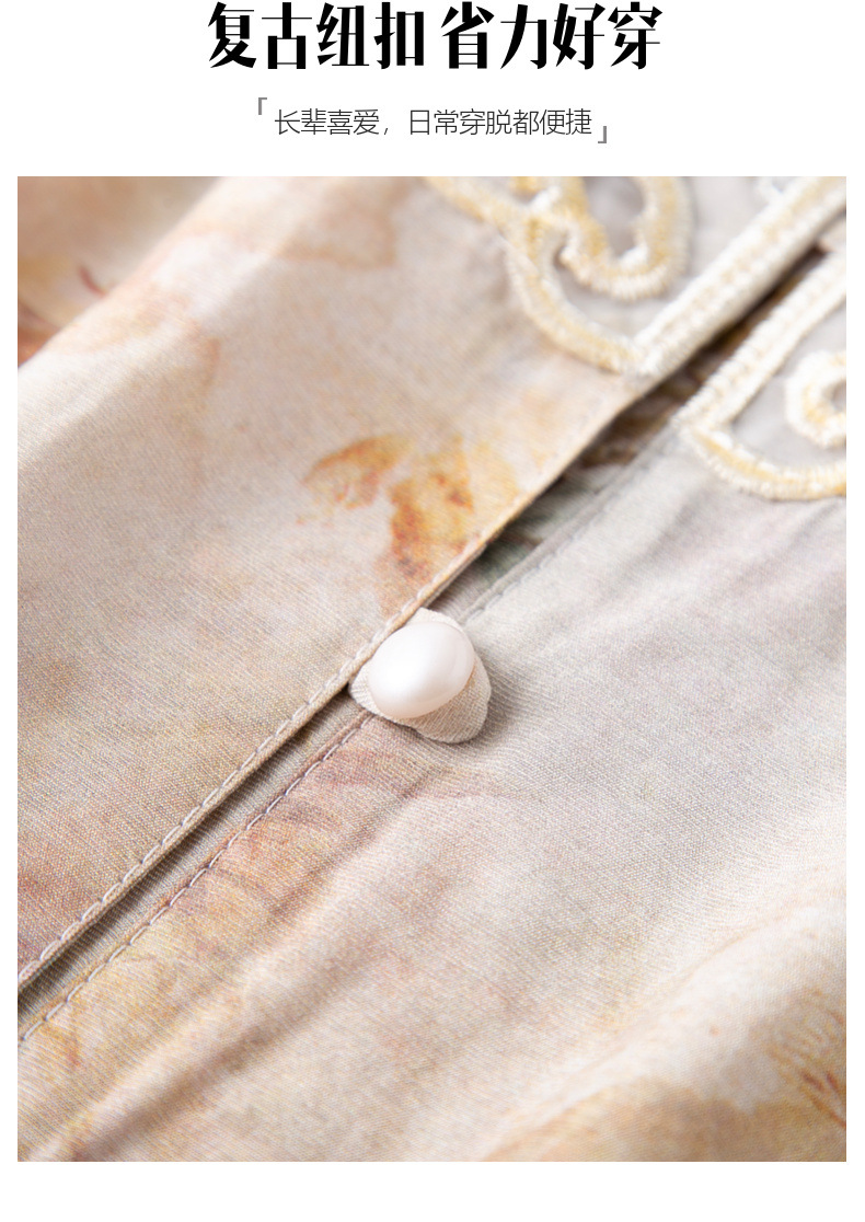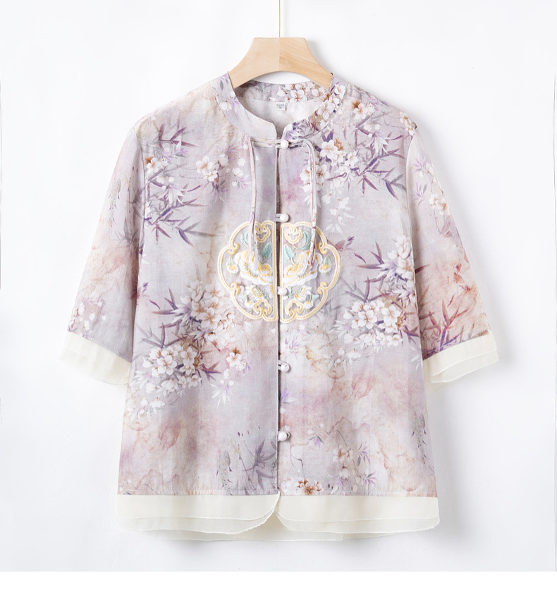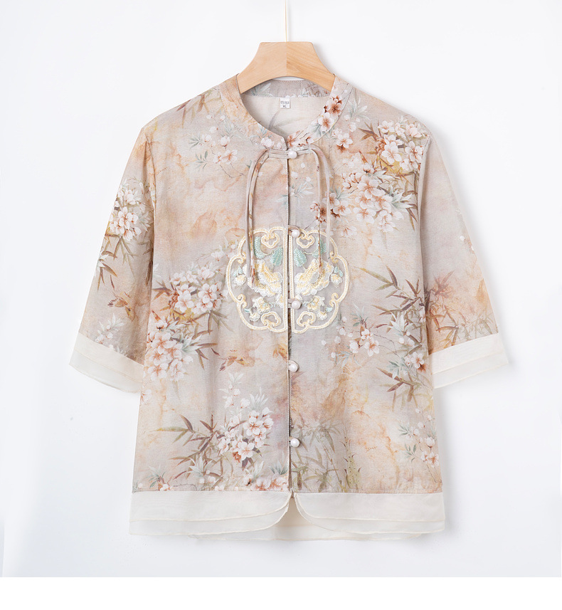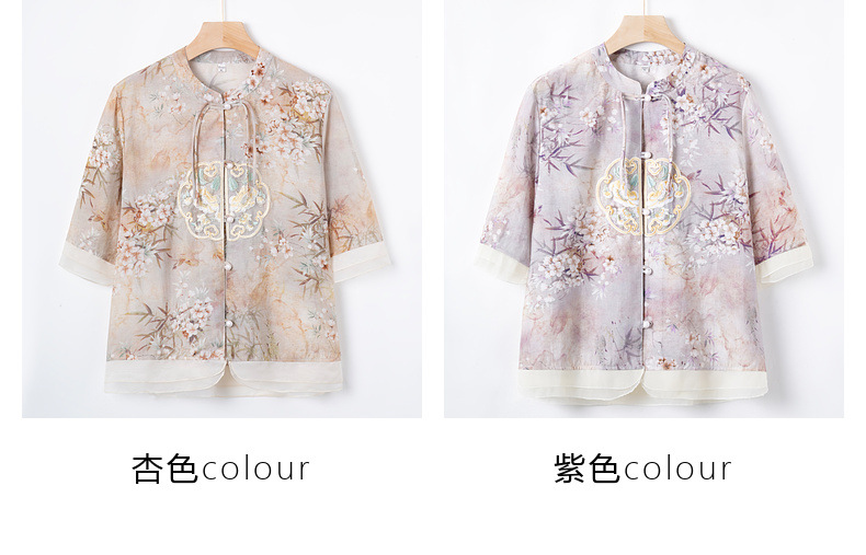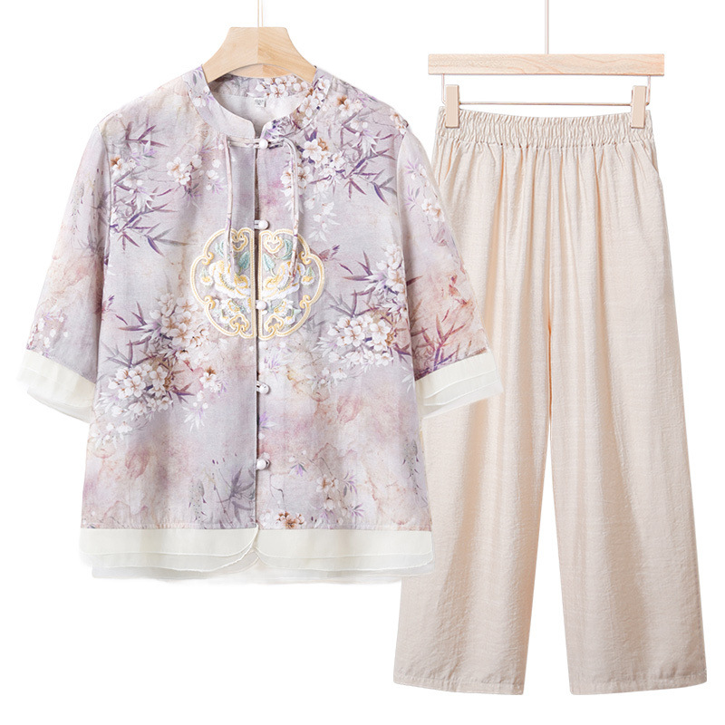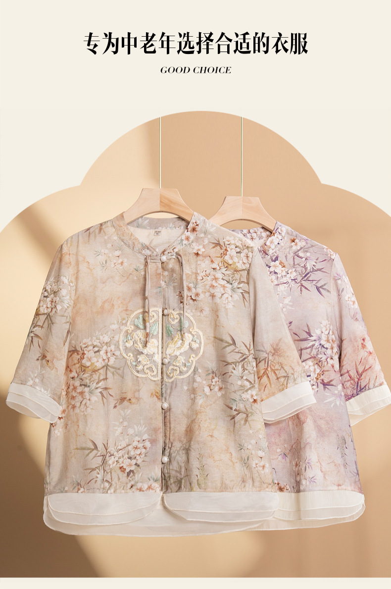 엄마의 새로운 봄과 여름 국가 스타일 작은 셔츠 투피스 세트 중년 및 노인 할머니의 여름 쉬폰 반소매 탑 여성을위한 맞춤형스토어 가기