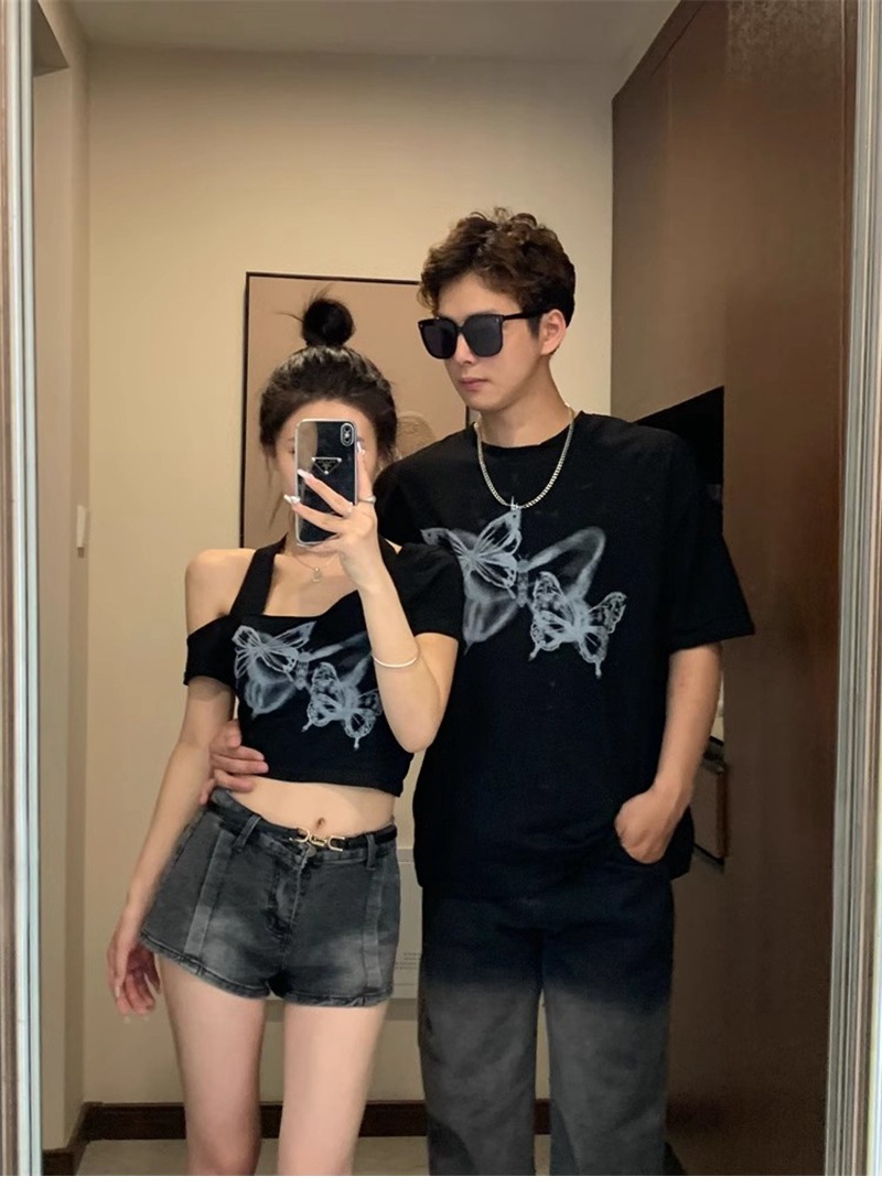 미국 레트로 스파이스 소녀 어깨 목면 반팔 티셔츠 여성 여름 디자인 나비 인쇄 짧은 상단스토어 가기
